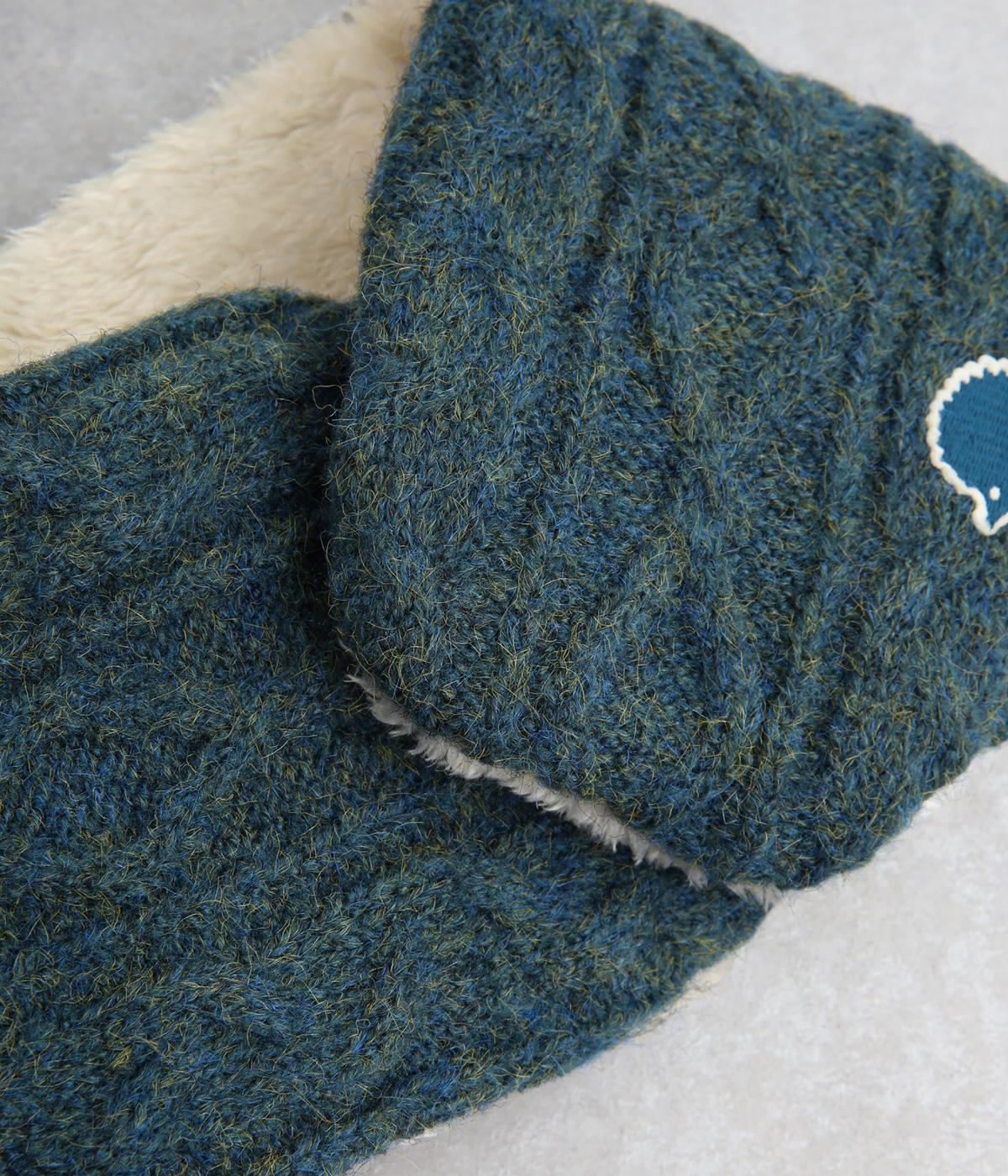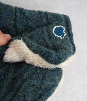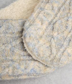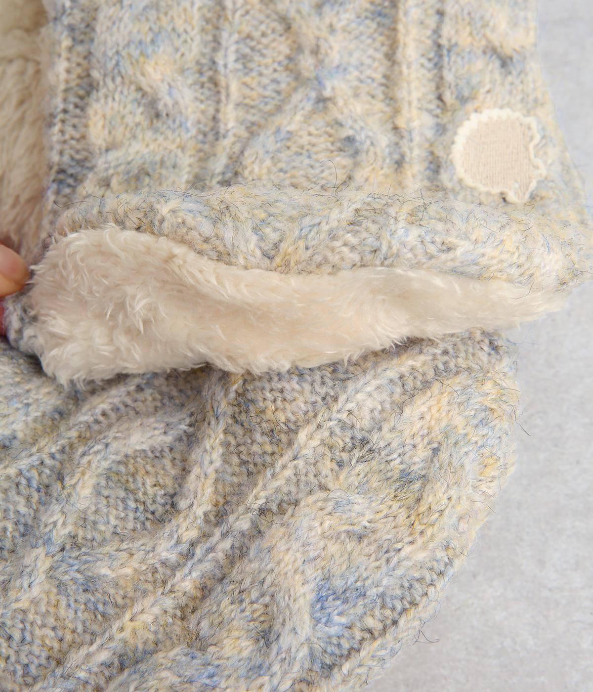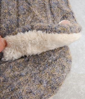 ケーブル編みニットの表地はポリエステル、アクリル、ポリウレタン。肌ざわりの良いボアの裏地はポリエステル。家庭で手洗いができるので、気軽にデイリー使いできるのが高ポイント。