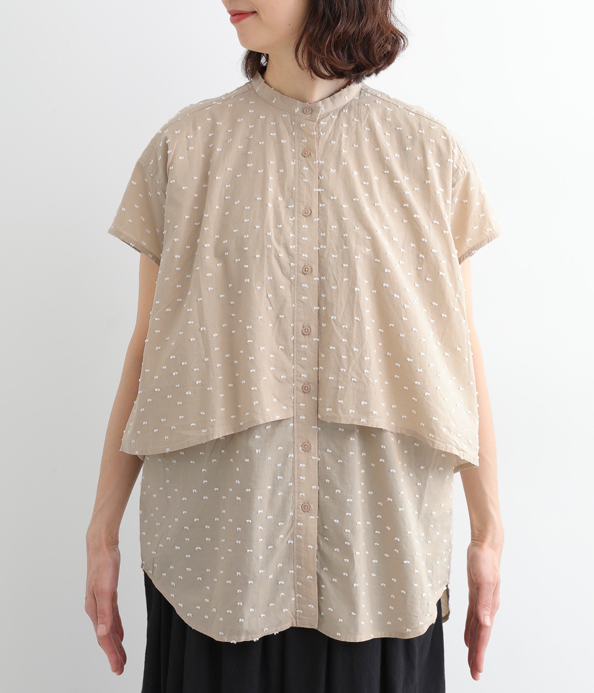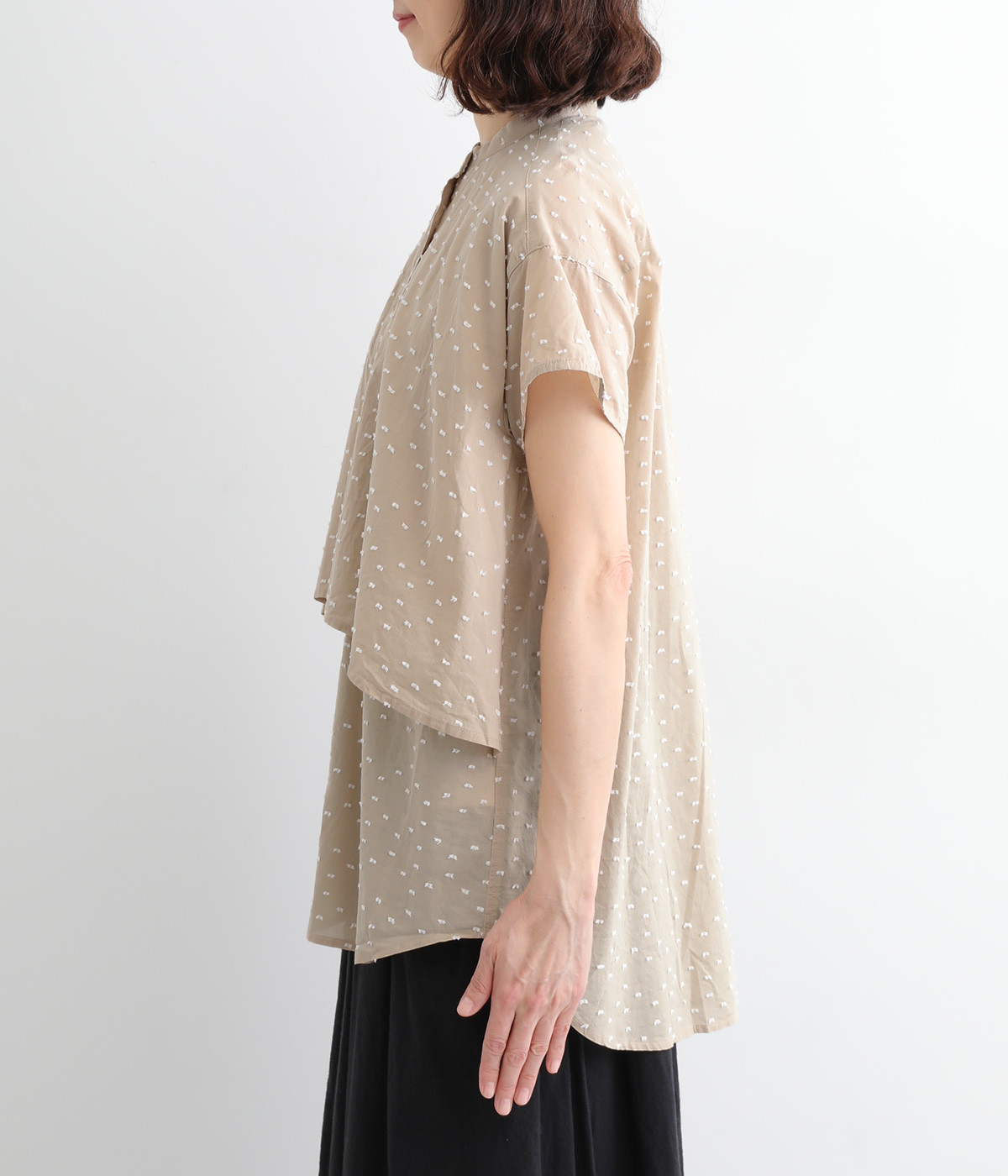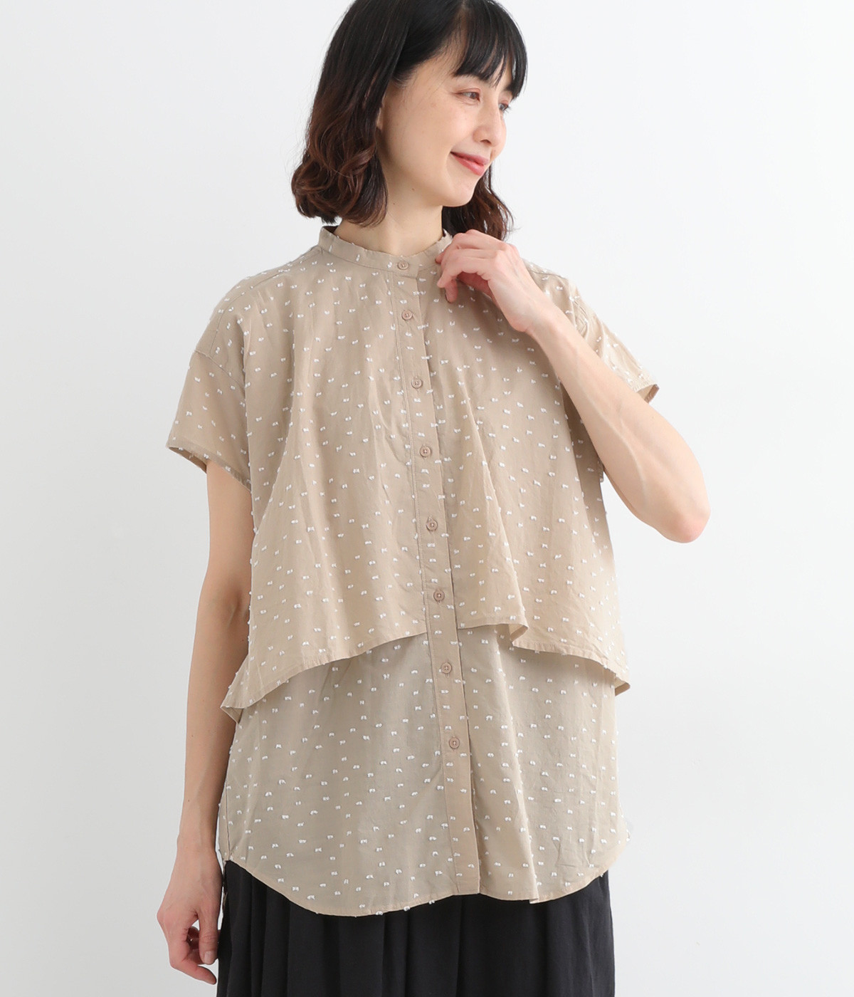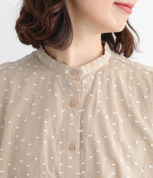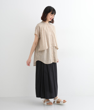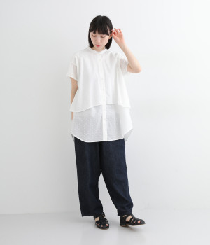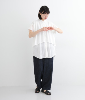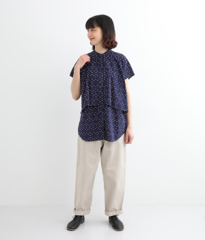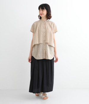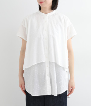 クリーンな印象のスタンドカラーに、2枚仕立てのフレアヨークがアクセントになったブラウスです。ボリュームがありつつも、すっきりとしたシルエットに仕上がっています。デニムやスカートとも幅広く合わせられるアイテムです。