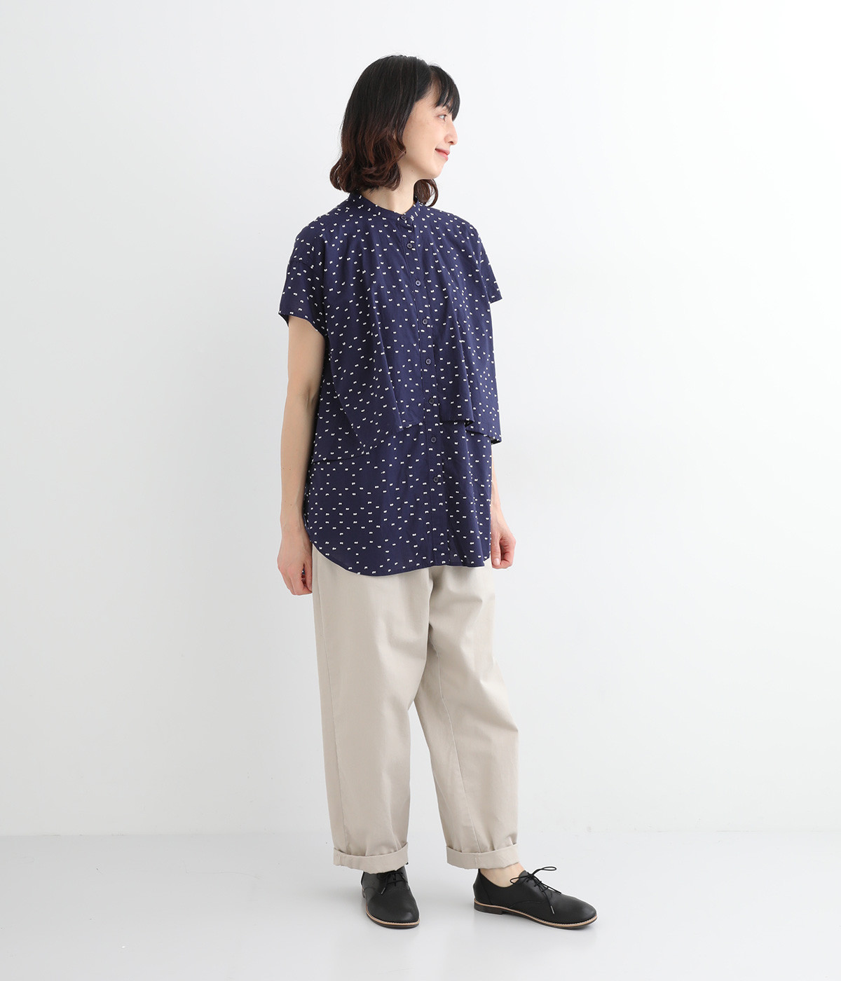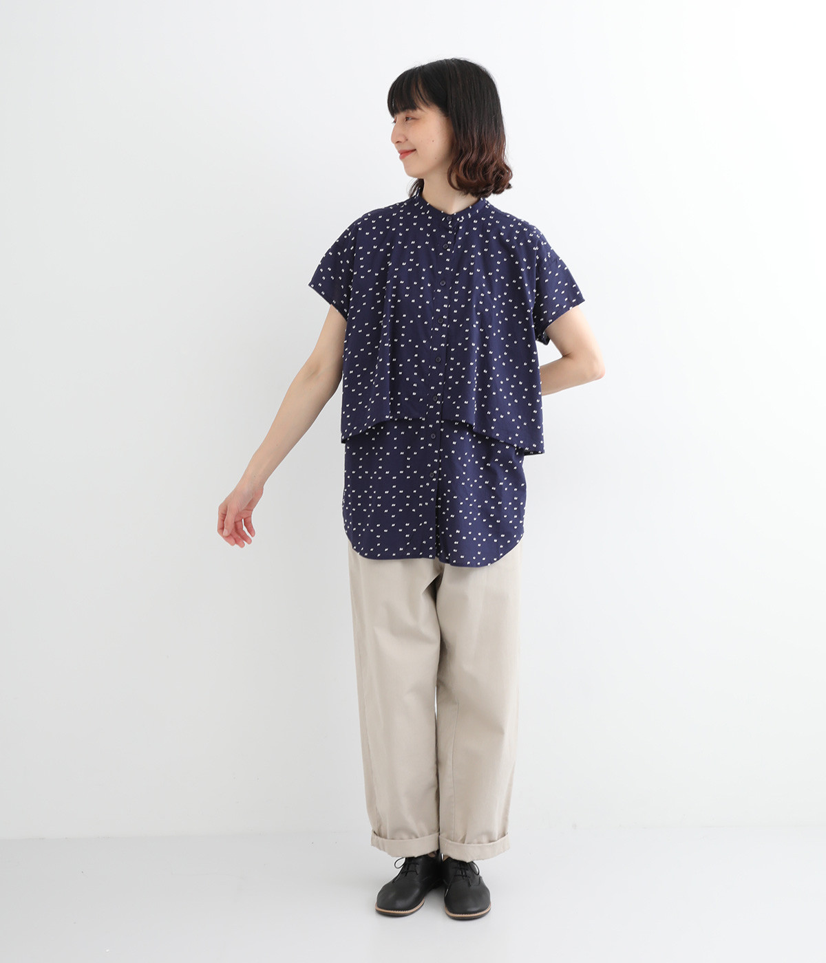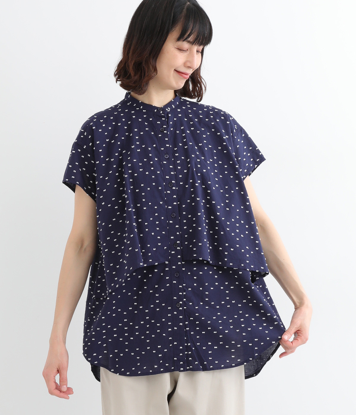 クリーンな印象のスタンドカラーに、2枚仕立てのフレアヨークがアクセントになったブラウスです。ボリュームがありつつも、すっきりとしたシルエットに仕上がっています。デニムやスカートとも幅広く合わせられるアイテムです。