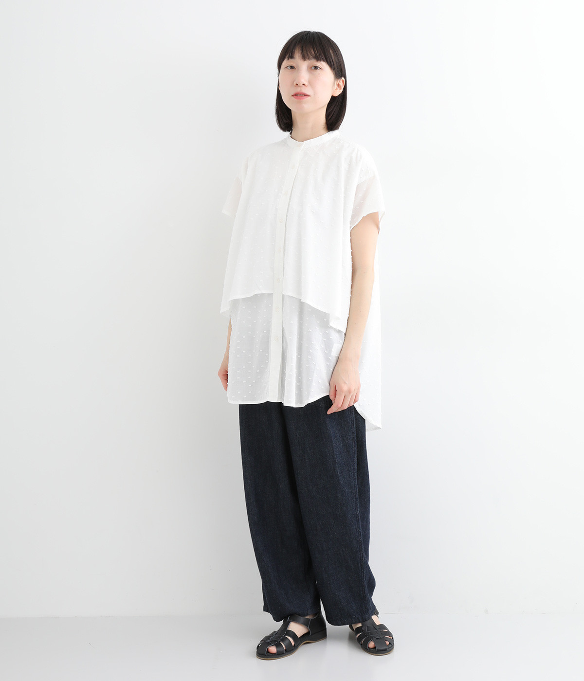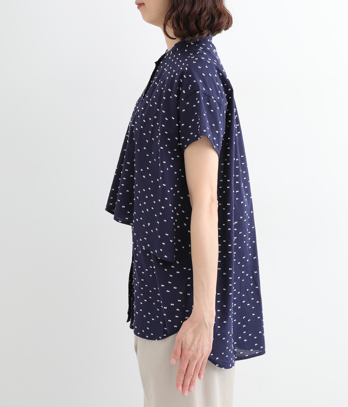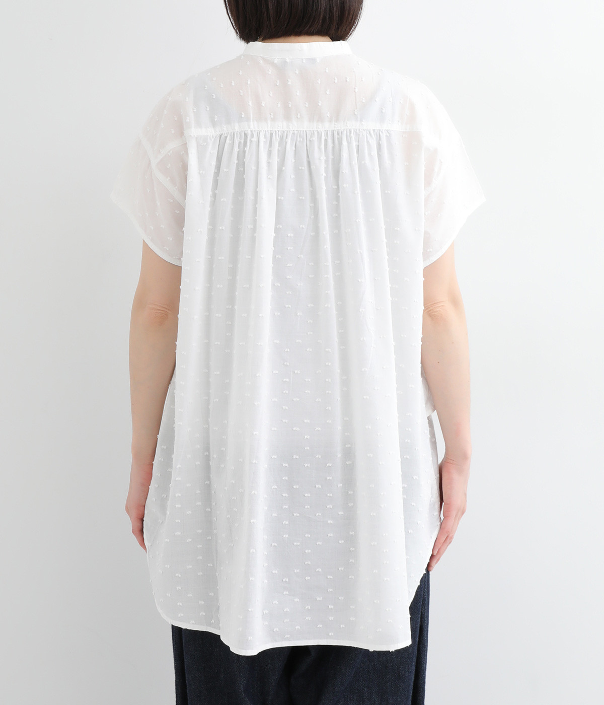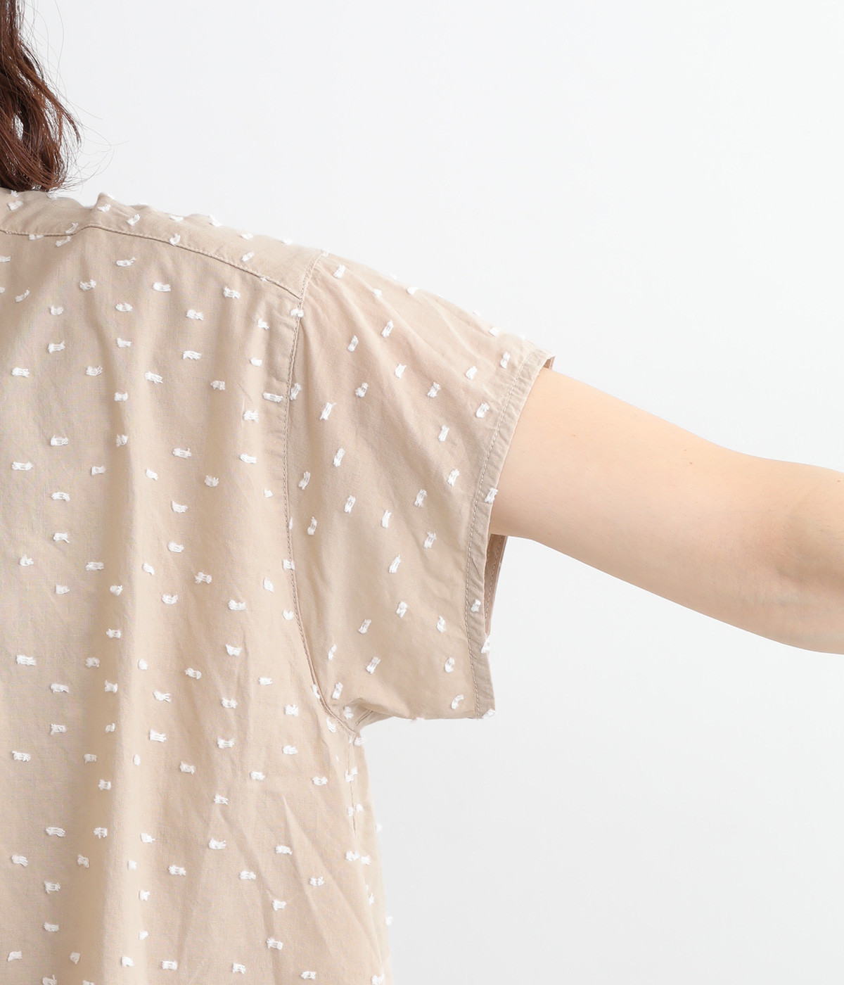 表面感のあるカットトビー織りがアクセントになった、やわらかくて肌ざわりのよいコットン生地を使用しています。ほんのりとシアーな薄手の生地です。