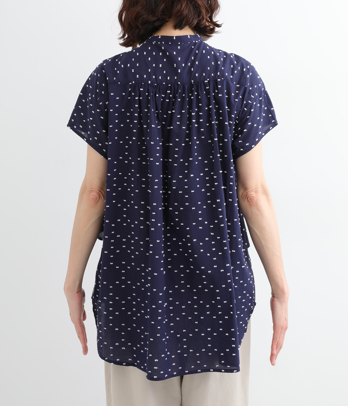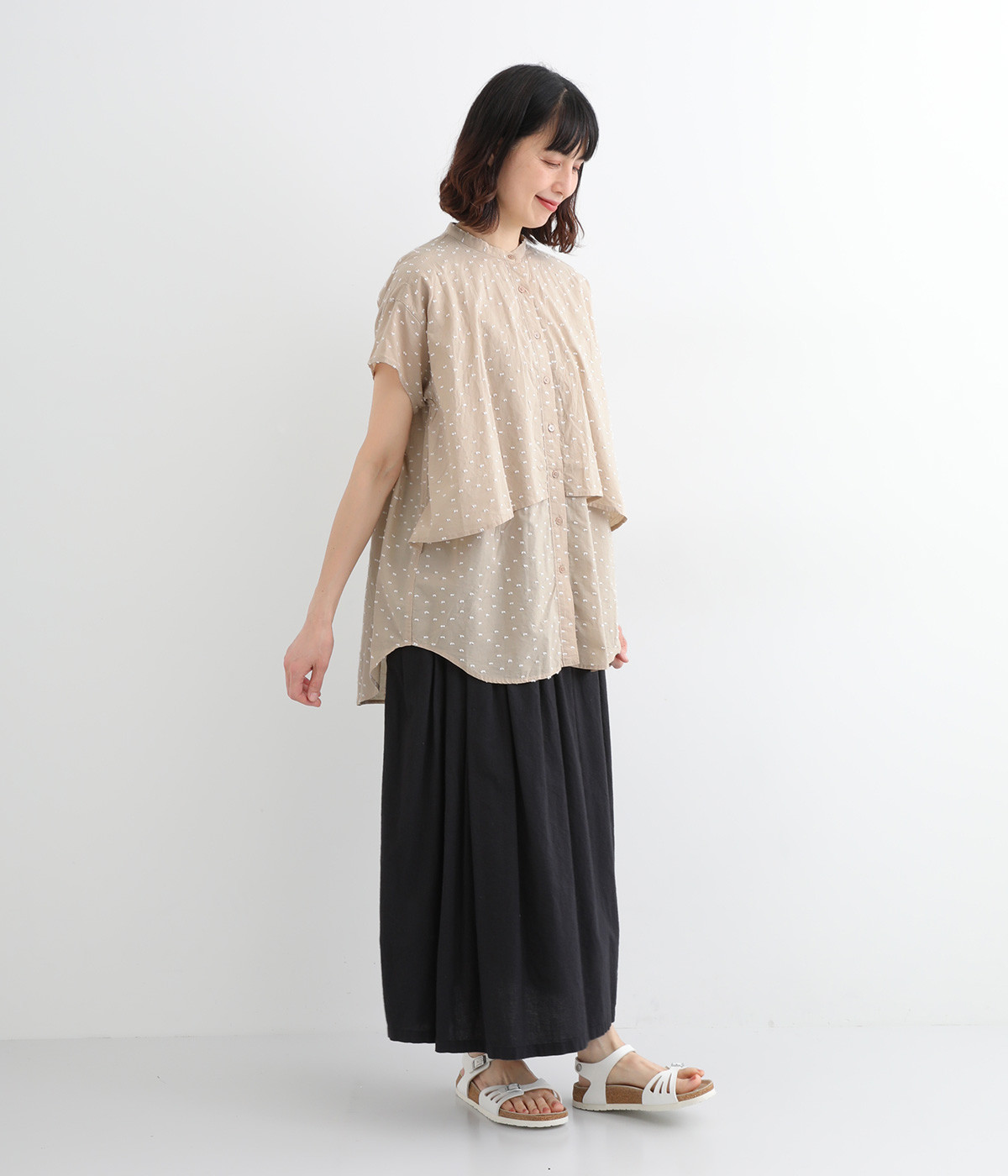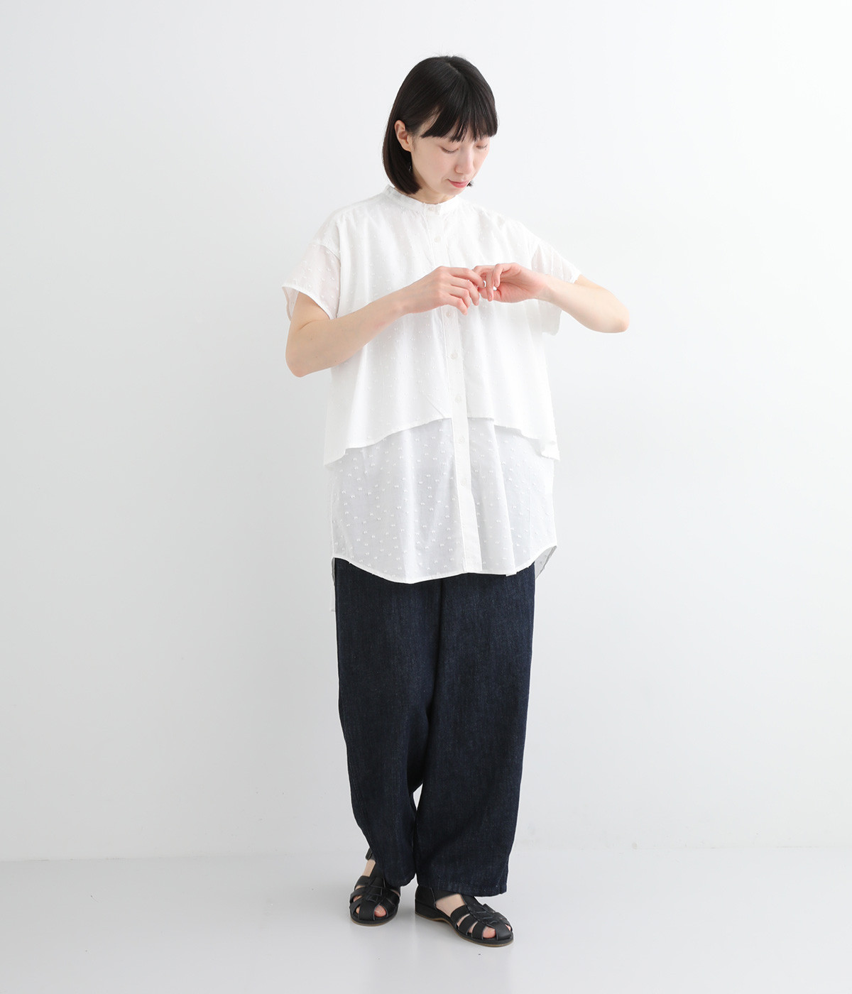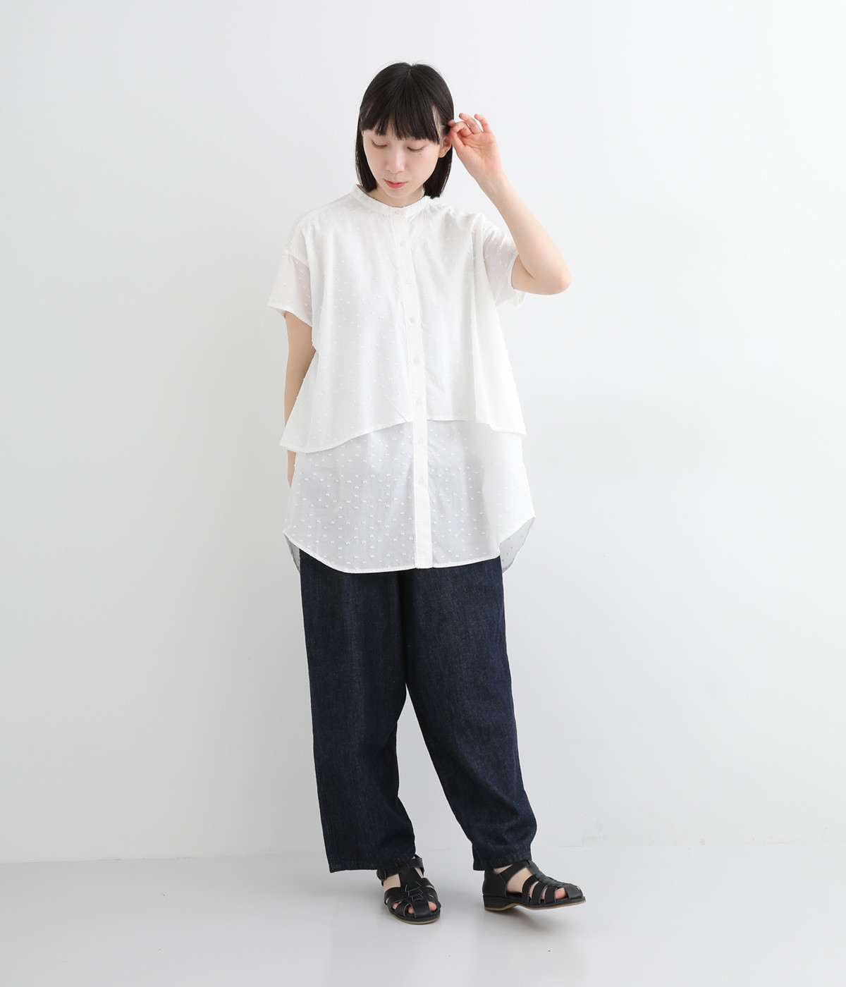 表面感のあるカットトビー織りがアクセントになった、やわらかくて肌ざわりのよいコットン生地を使用しています。ほんのりとシアーな薄手の生地です。