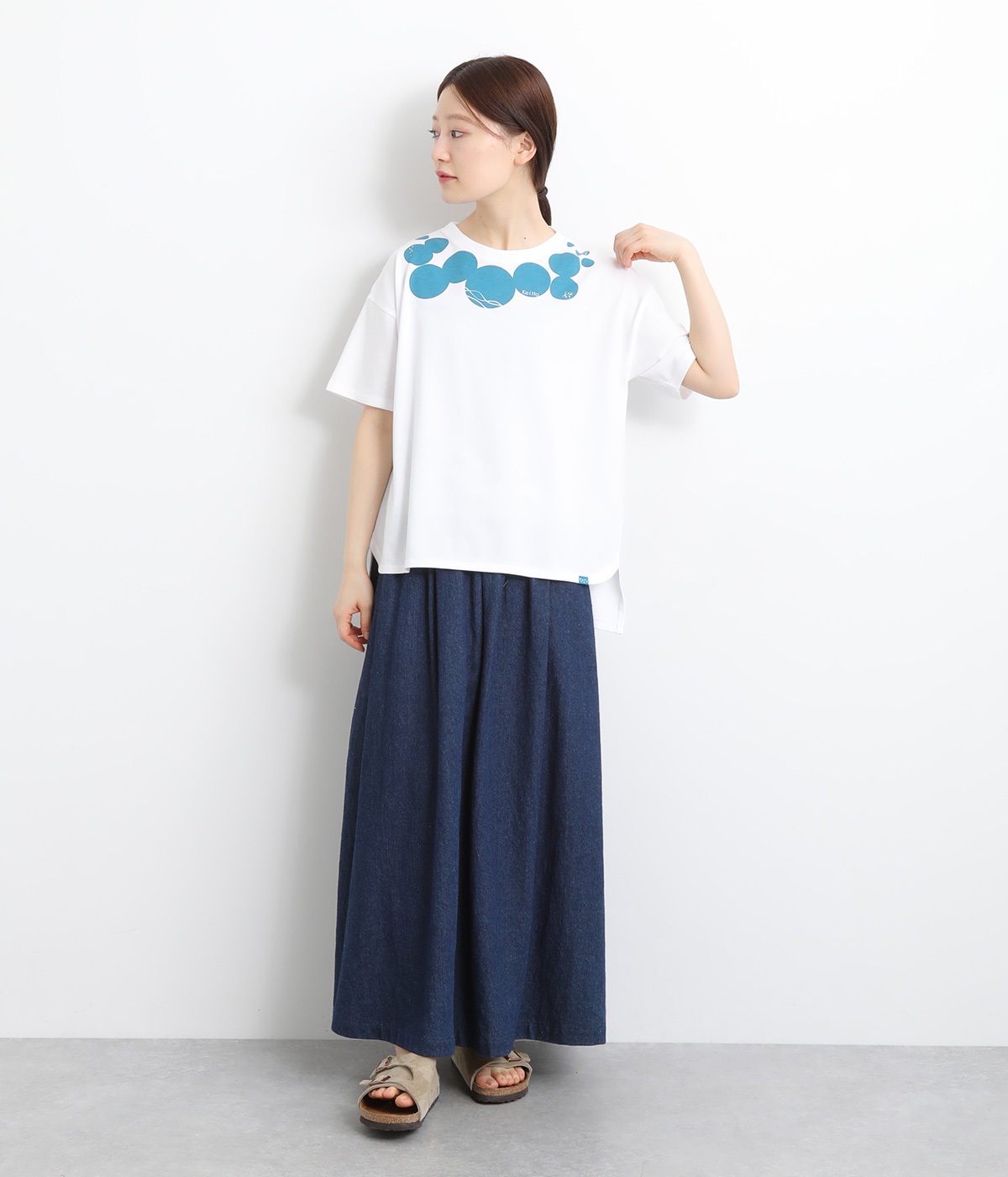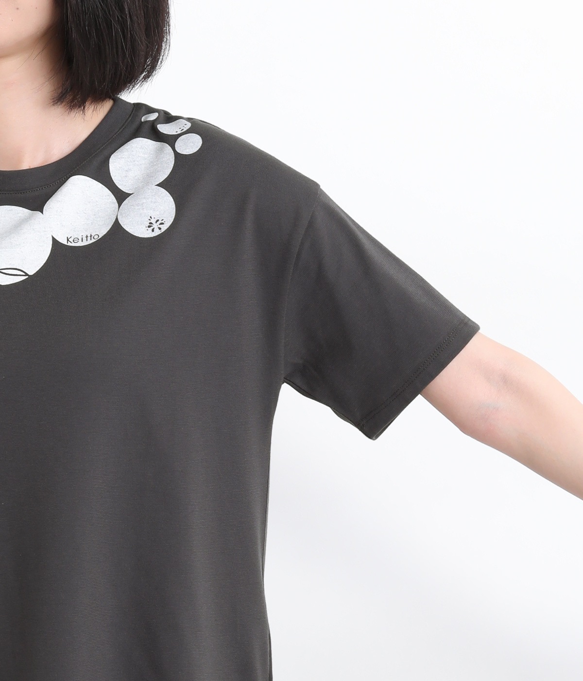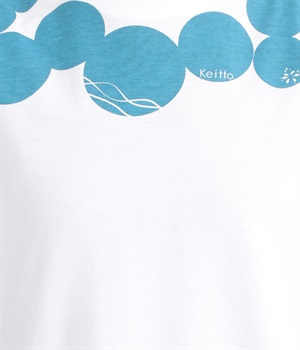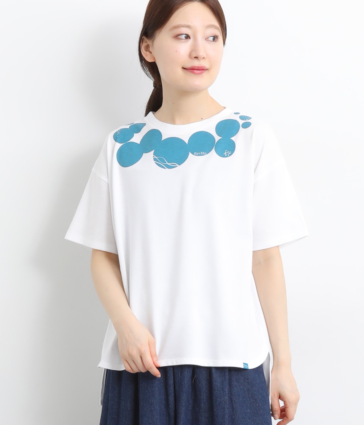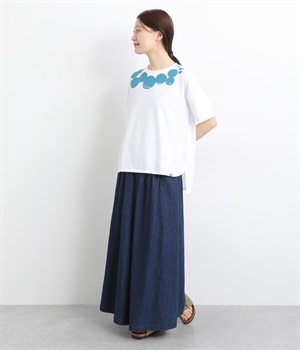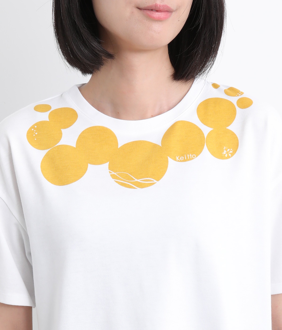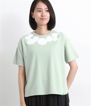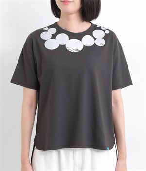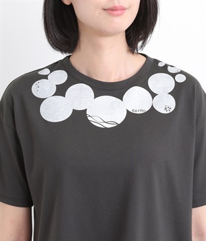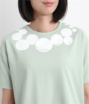 ドット柄の中に泳ぐシャチの水しぶきや泡、一緒に泳ぐ魚たちをさり気なく取り入れた、「水族館でシャチを見る」をテーマにした一枚です。ほどよくゆとりのある身幅が着心地よく、前後差のある裾は前をラウンドカットにして動きやすさをプラス。