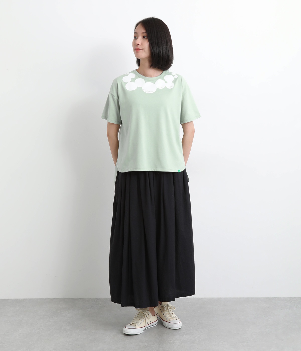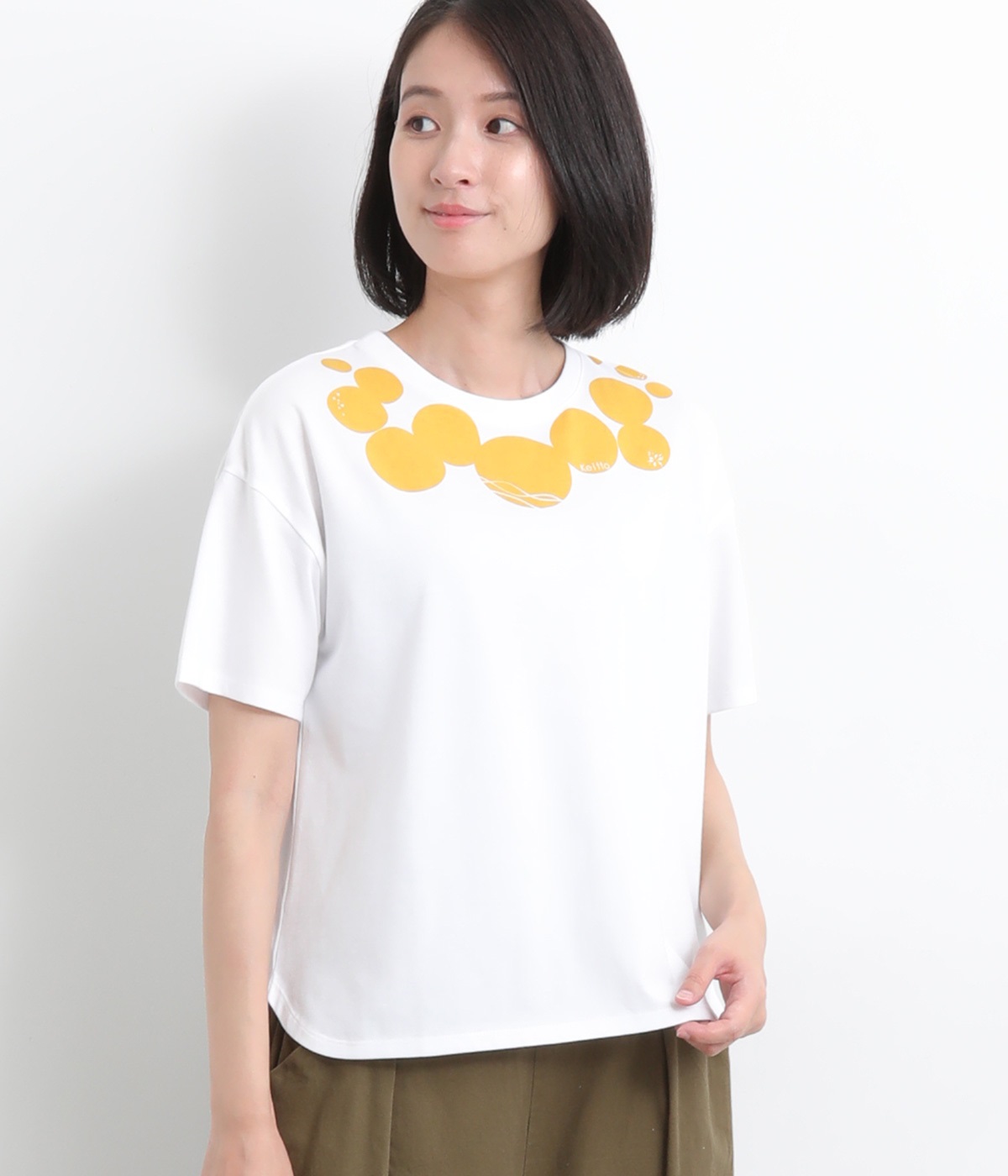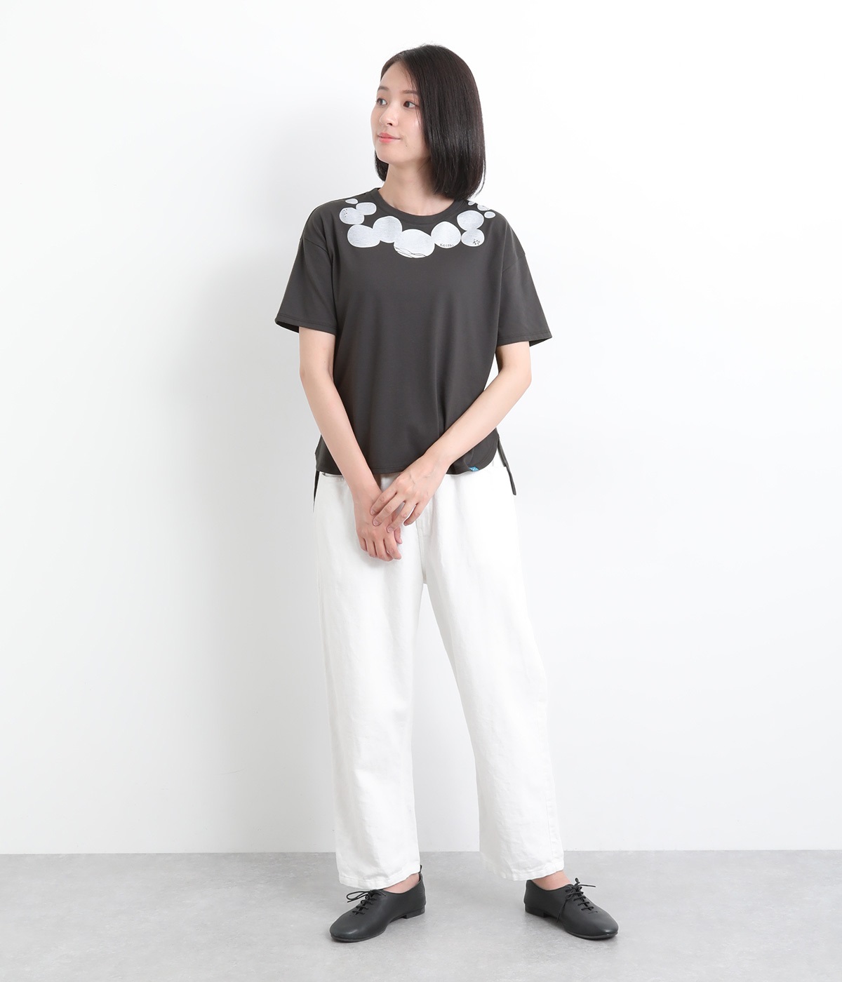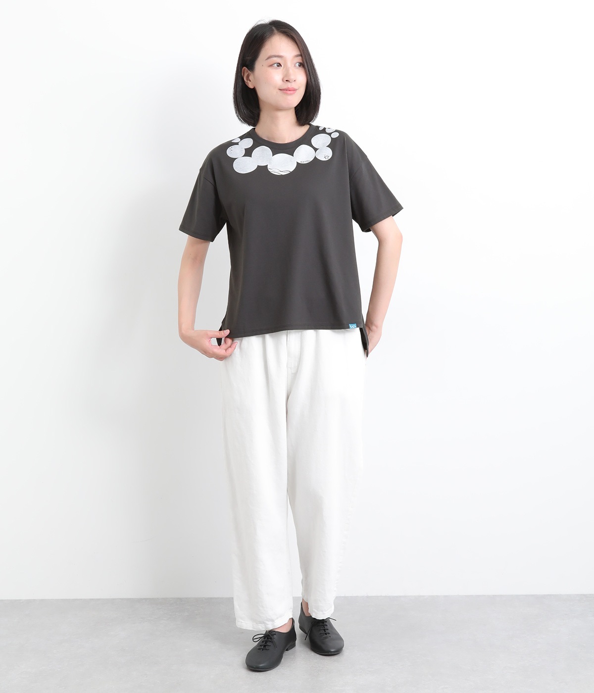 ドット柄の中に泳ぐシャチの水しぶきや泡、一緒に泳ぐ魚たちをさり気なく取り入れた、「水族館でシャチを見る」をテーマにした一枚です。ほどよくゆとりのある身幅が着心地よく、前後差のある裾は前をラウンドカットにして動きやすさをプラス。