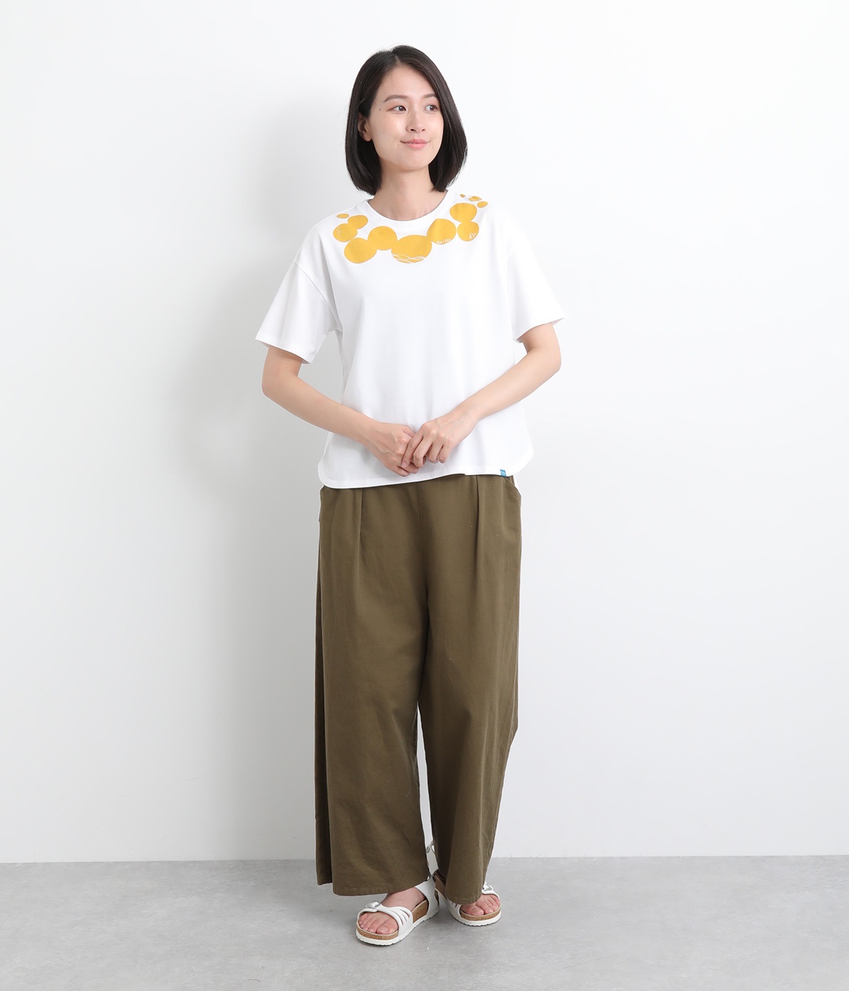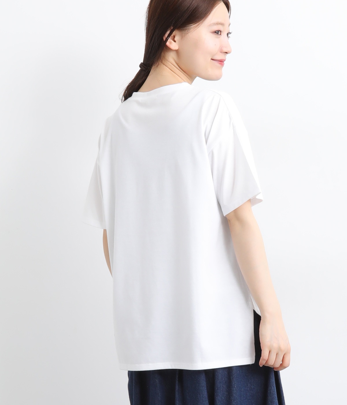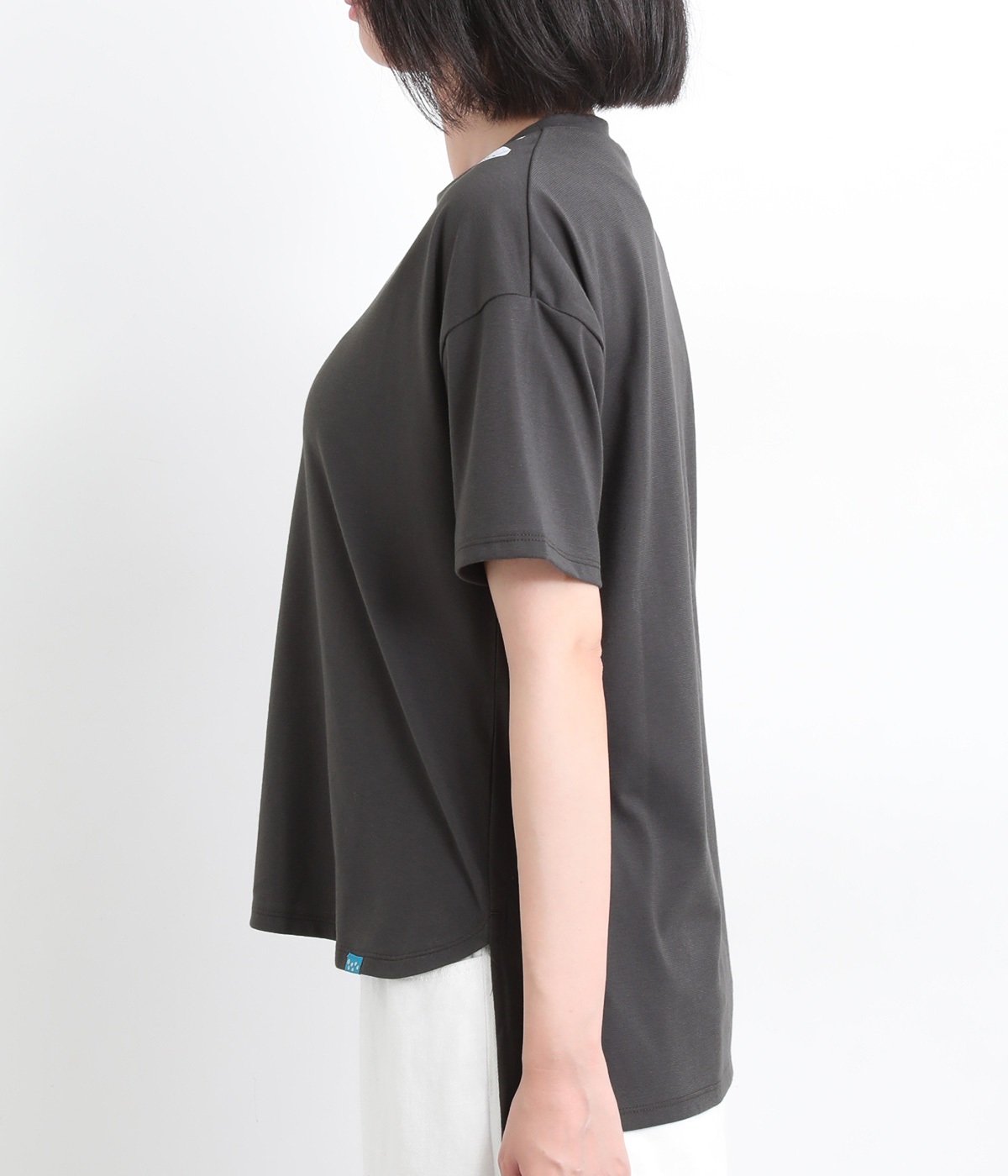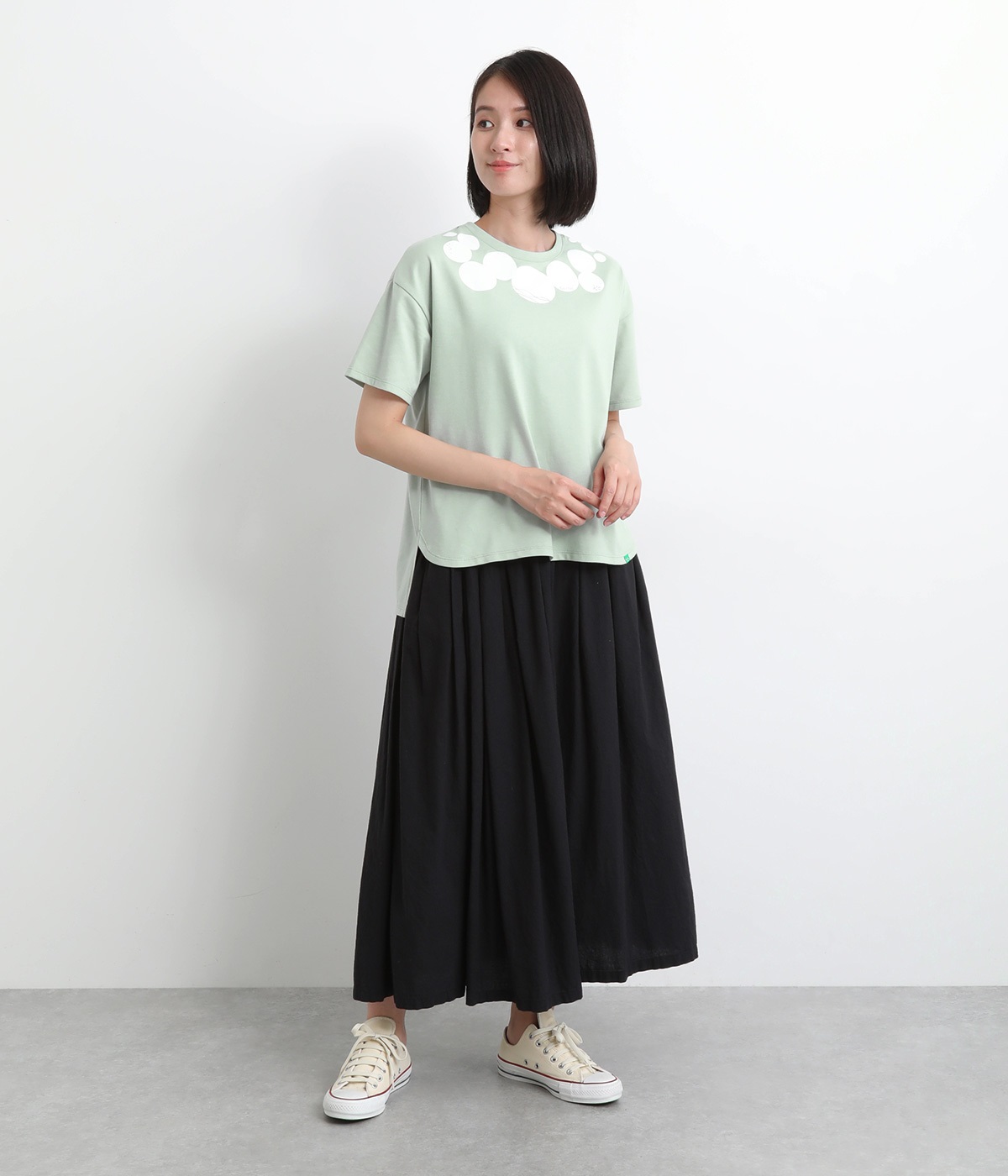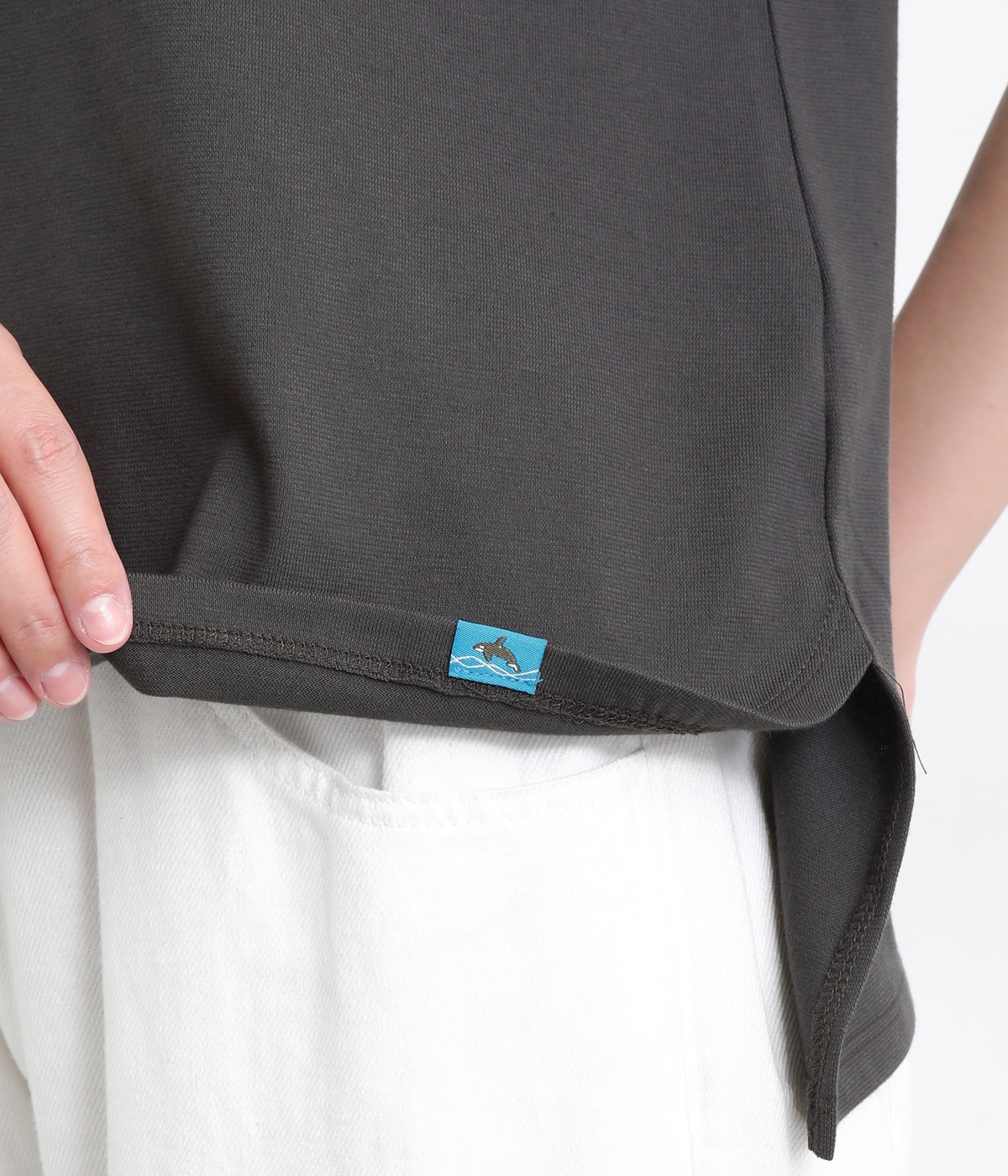 ドット柄の中に泳ぐシャチの水しぶきや泡、一緒に泳ぐ魚たちをさり気なく取り入れた、「水族館でシャチを見る」をテーマにした一枚です。ほどよくゆとりのある身幅が着心地よく、前後差のある裾は前をラウンドカットにして動きやすさをプラス。