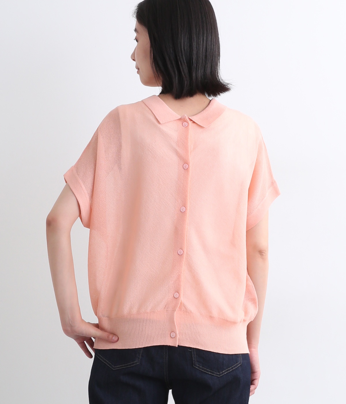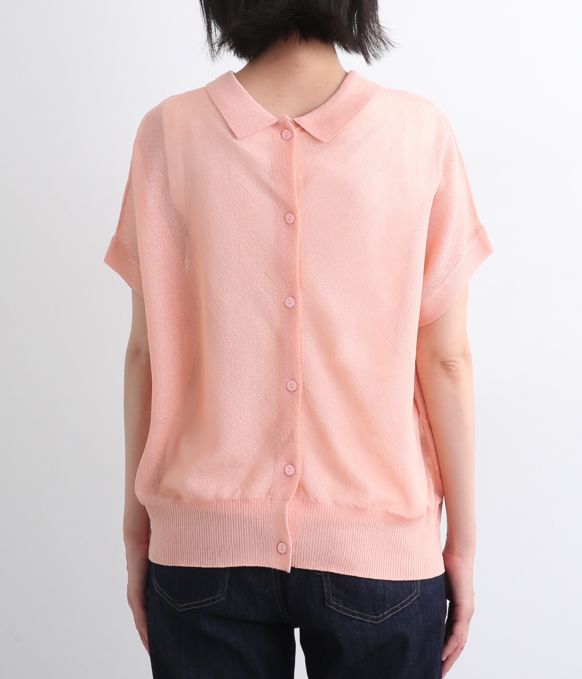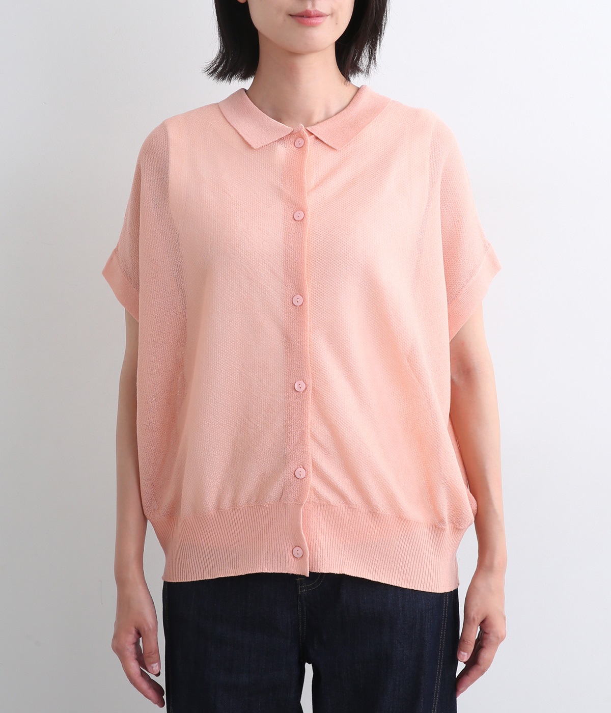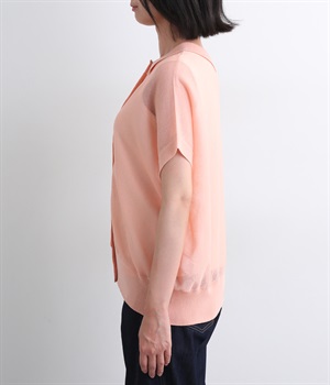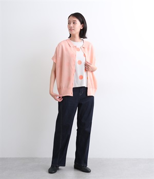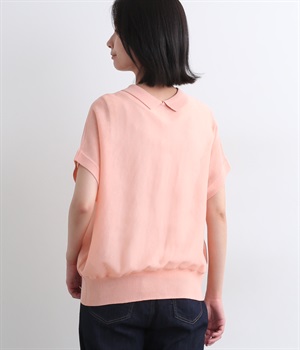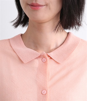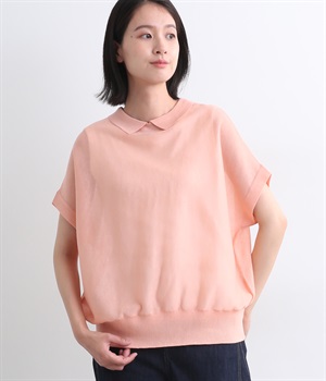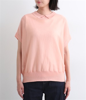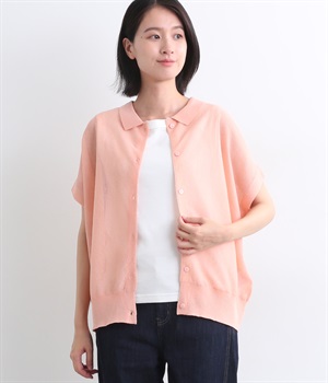 汗ばむ季節でもニットアイテムがたのしめる、前あきの羽織りにもなる前後2wayプルオーバーです。襟つきがグッドガールなポイントに。編み模様も前後で変えて印象チェンジも叶います。