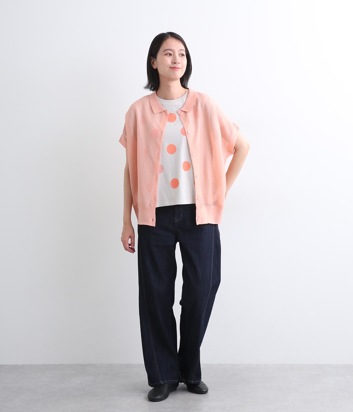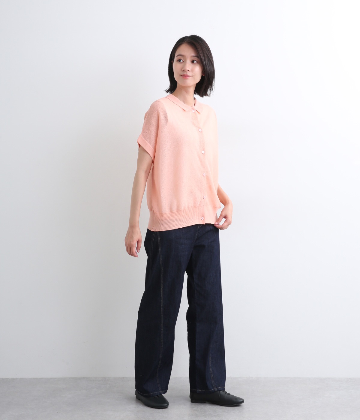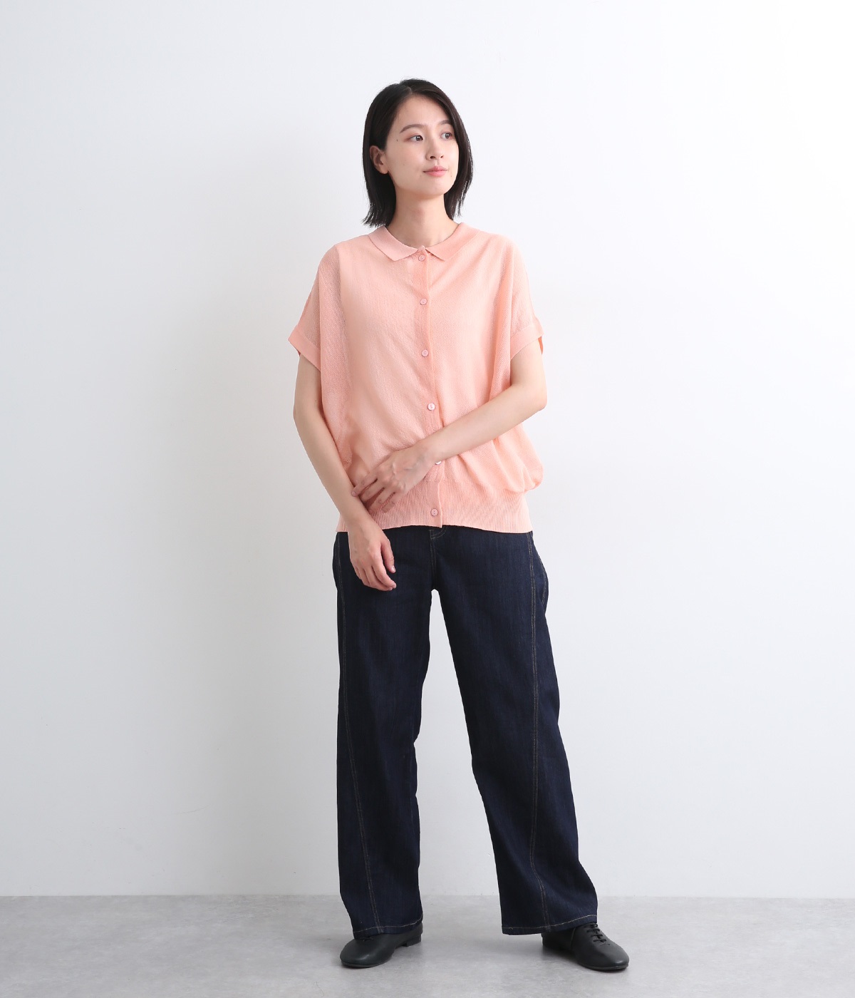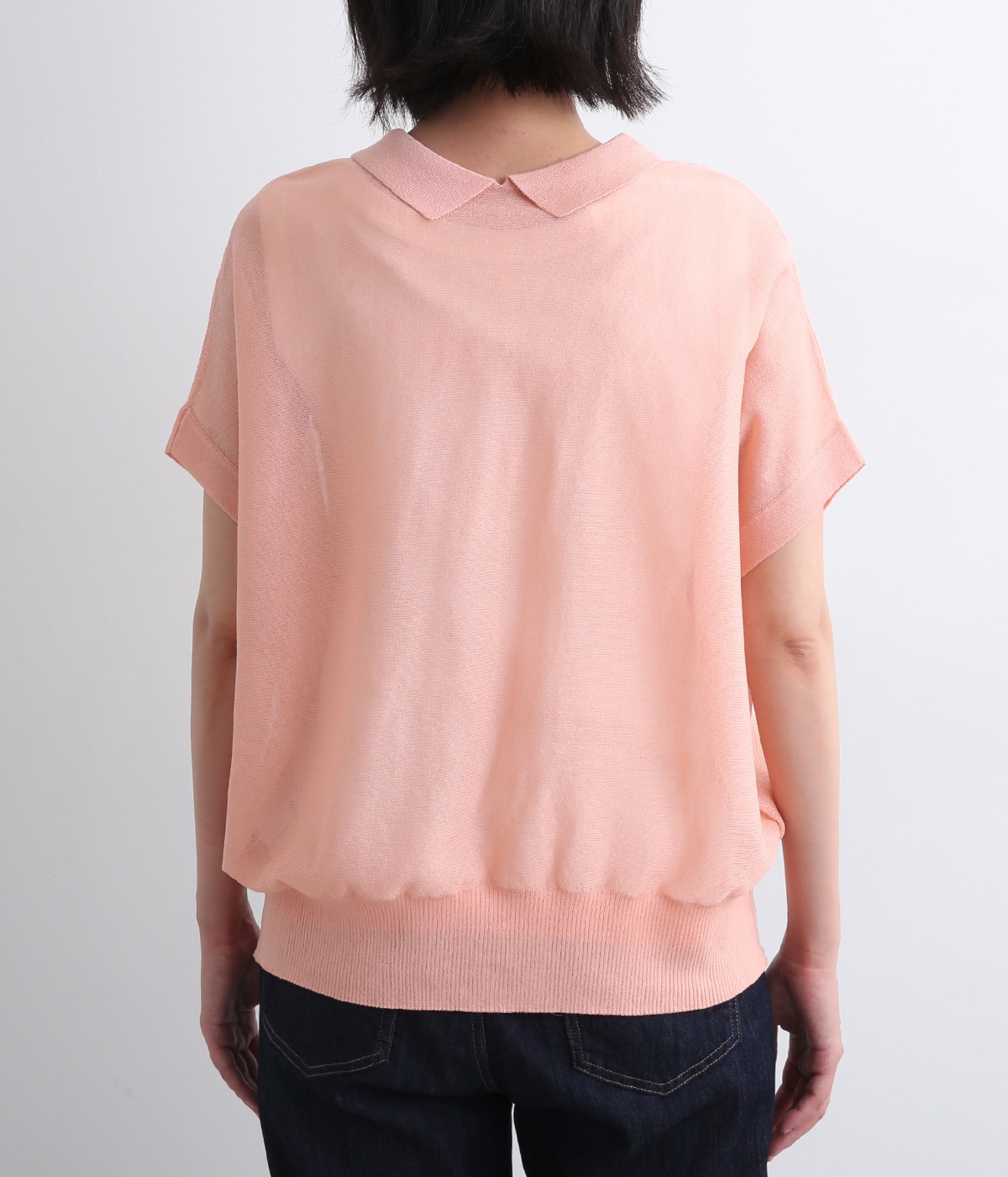 汗ばむ季節でもニットアイテムがたのしめる、前あきの羽織りにもなる前後2wayプルオーバーです。襟つきがグッドガールなポイントに。編み模様も前後で変えて印象チェンジも叶います。