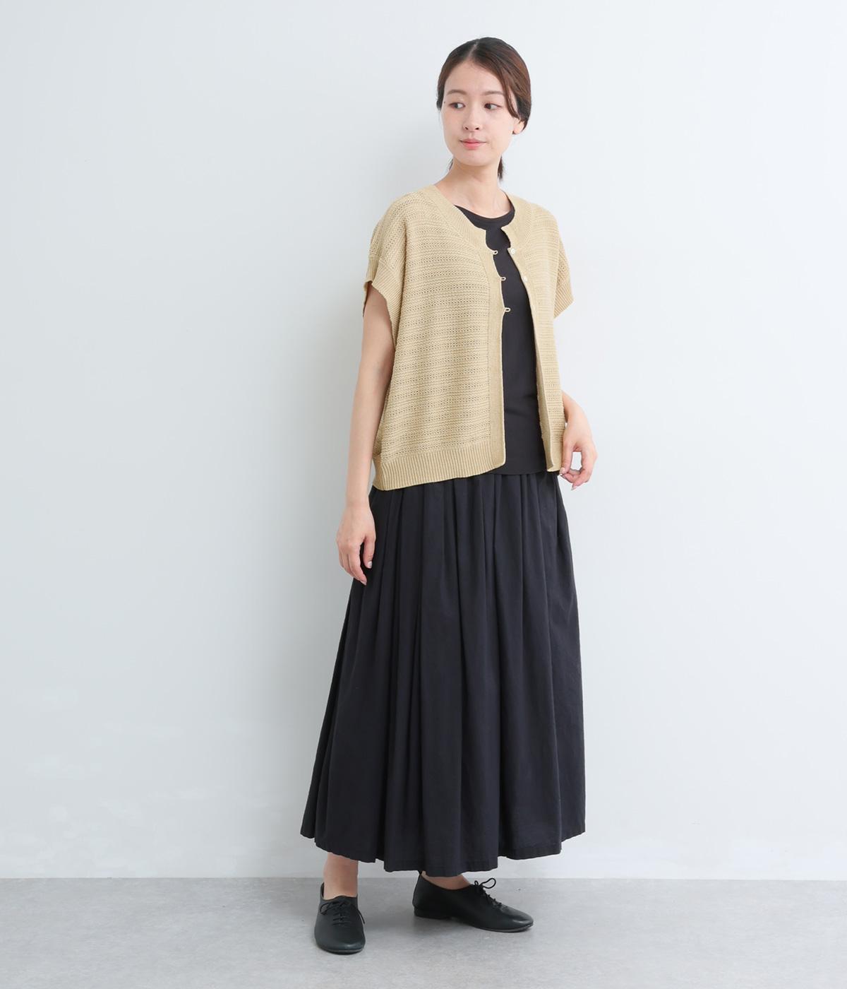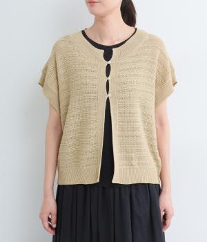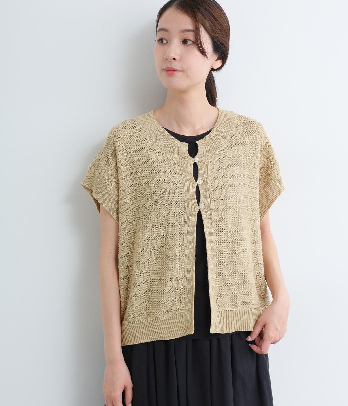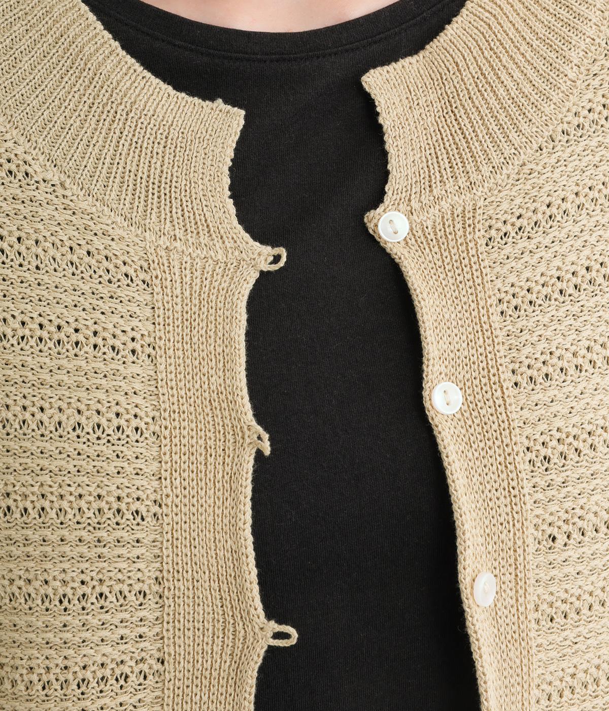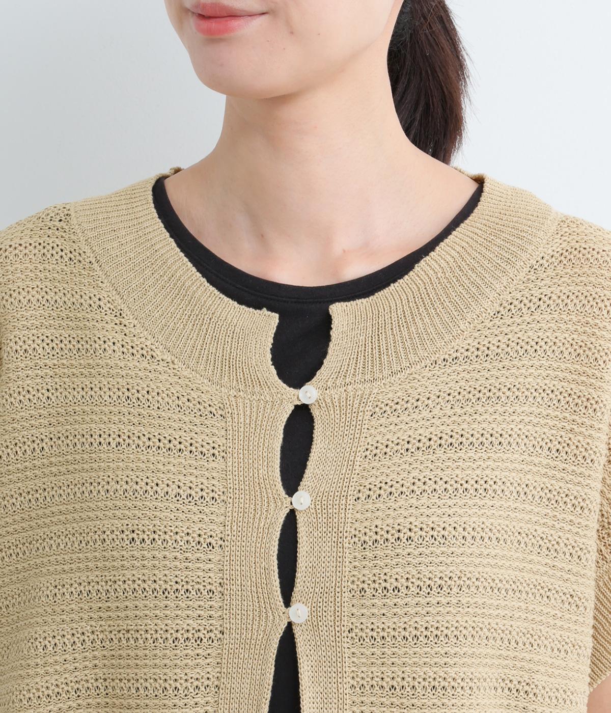 かぎ編みによる適度な抜け感がこなれた印象を運ぶカーディガン。ナチュラルな風合いでラフに羽織りやすく、スタイリングの印象チェンジとしても活躍。ボタンを上に配しているのでワンピースなどとも好相性です。