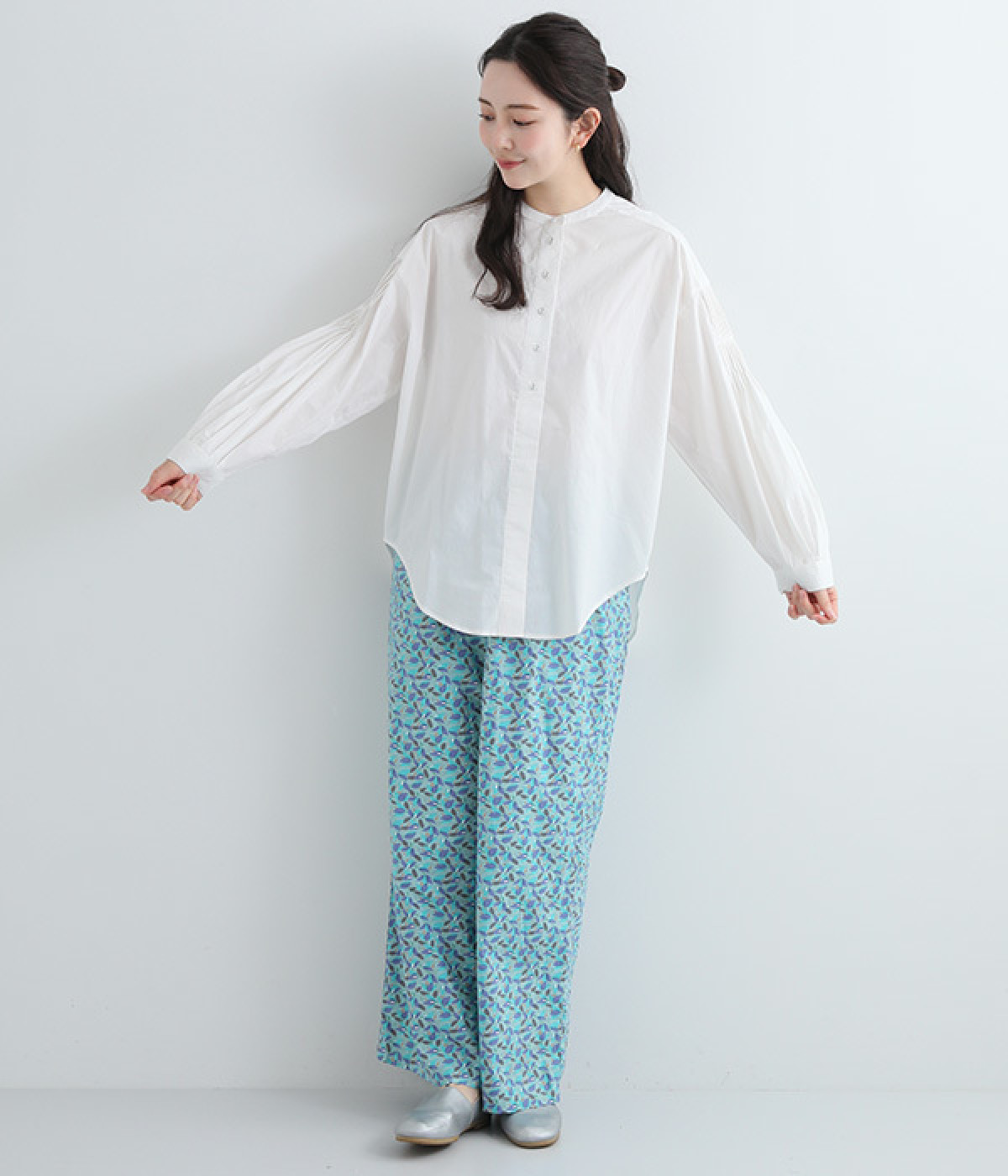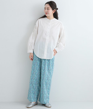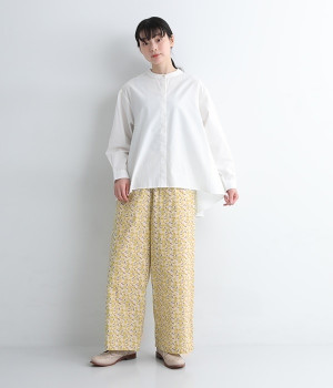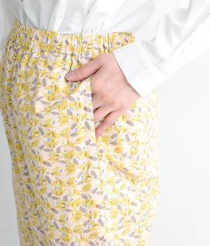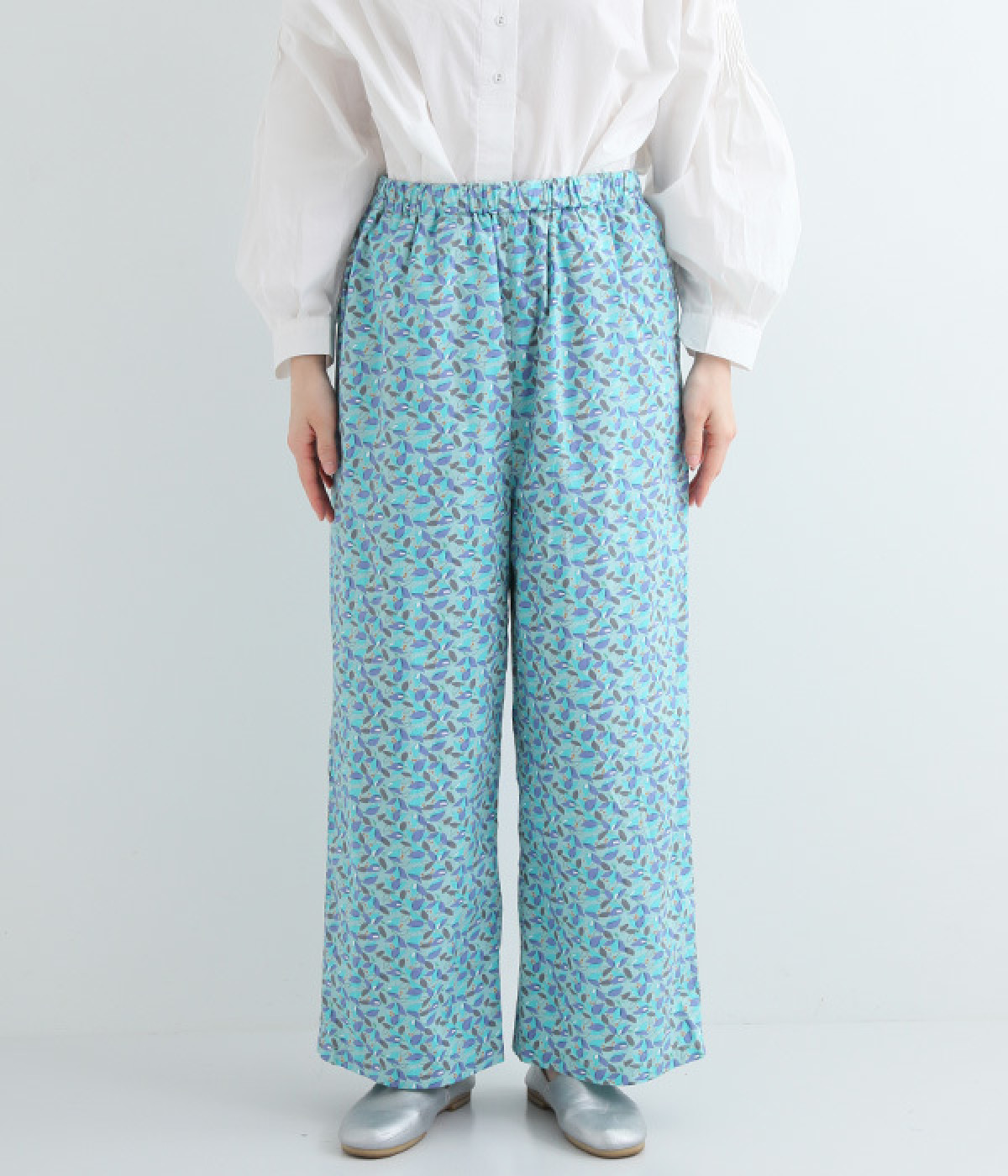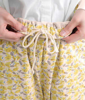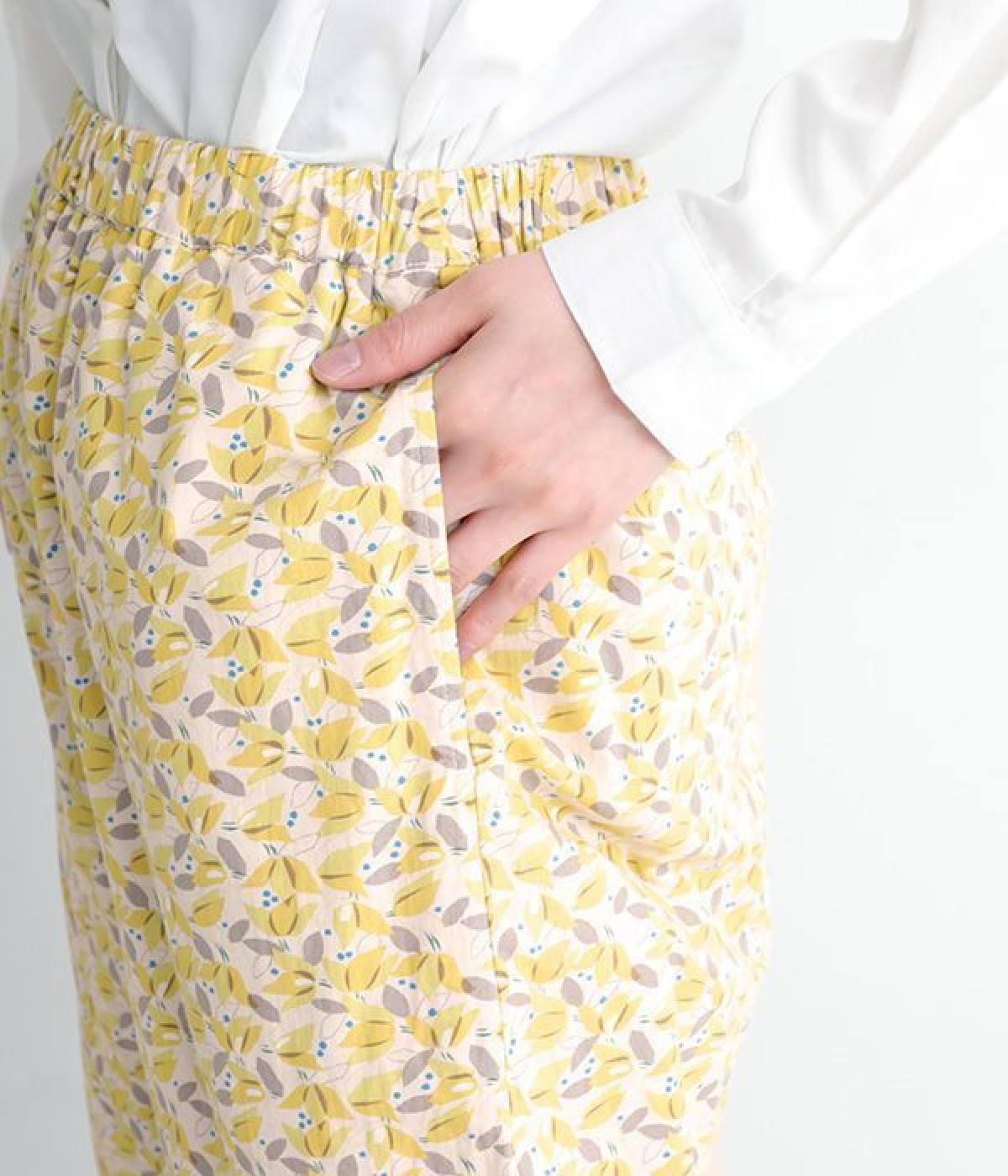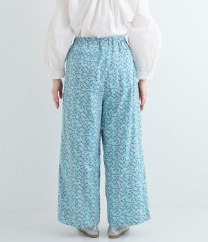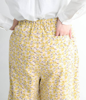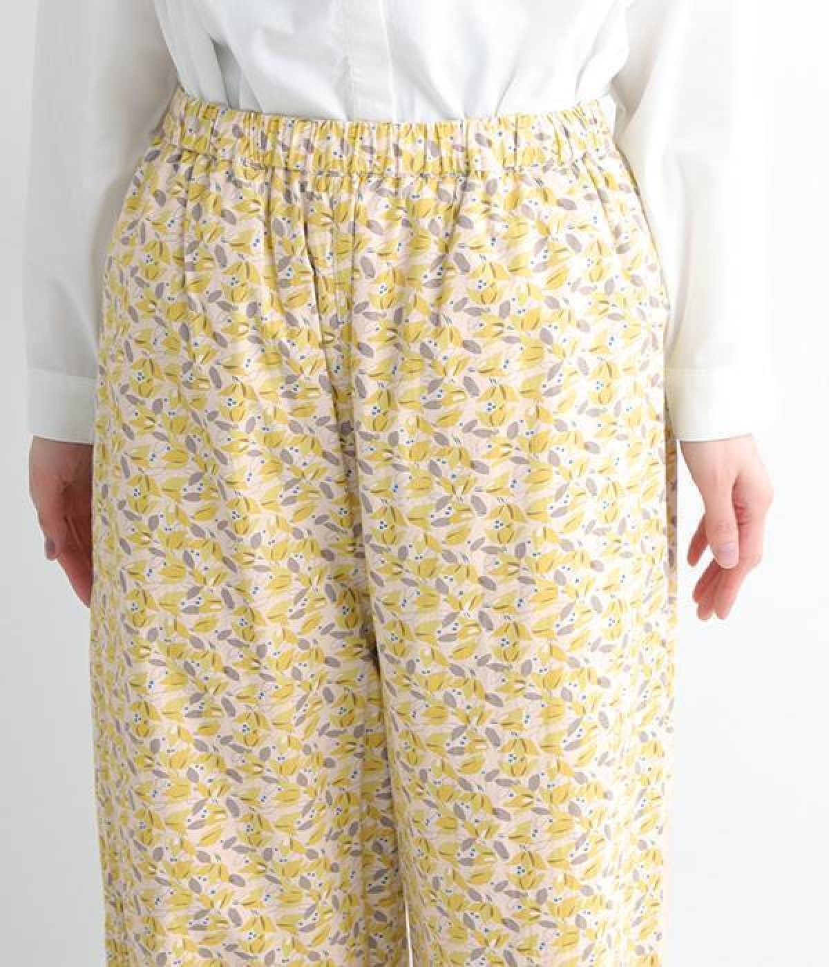 やさしい色合いのリーフ柄がかわいらしいイージーパンツ。さらっとなめらかな裏地が膝までついているため、穿き心地よく、透けるのを防いでくれます。ウエストは楽な総ゴム仕様で、フィット感を調整できる内ひも付き。程よいゆとりのあるストレートシルエットは、ブラウスやTシャツなどさまざまなトップス相性が良く、ワンピースの裾から柄をちらりと見せるレイヤードもおすすめです。