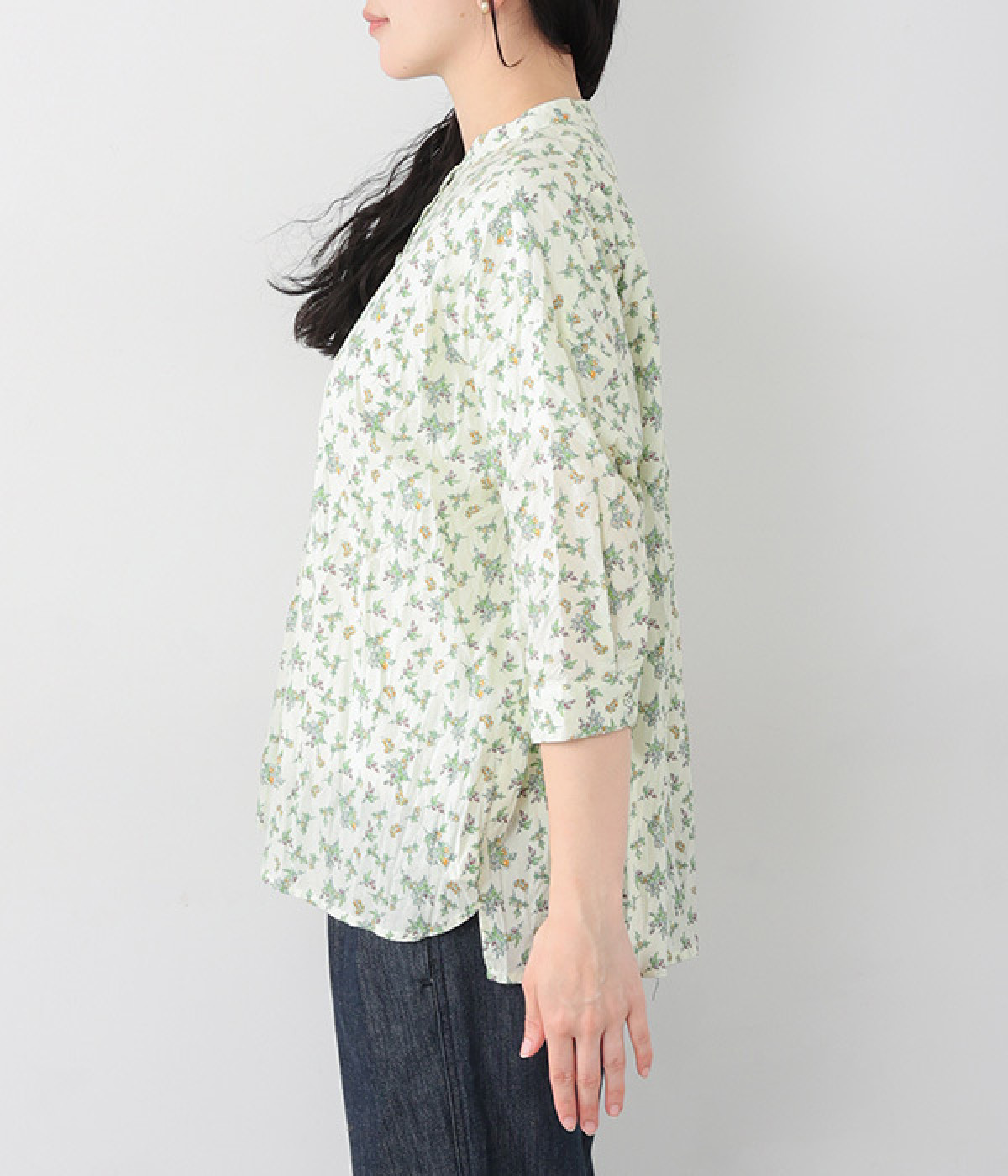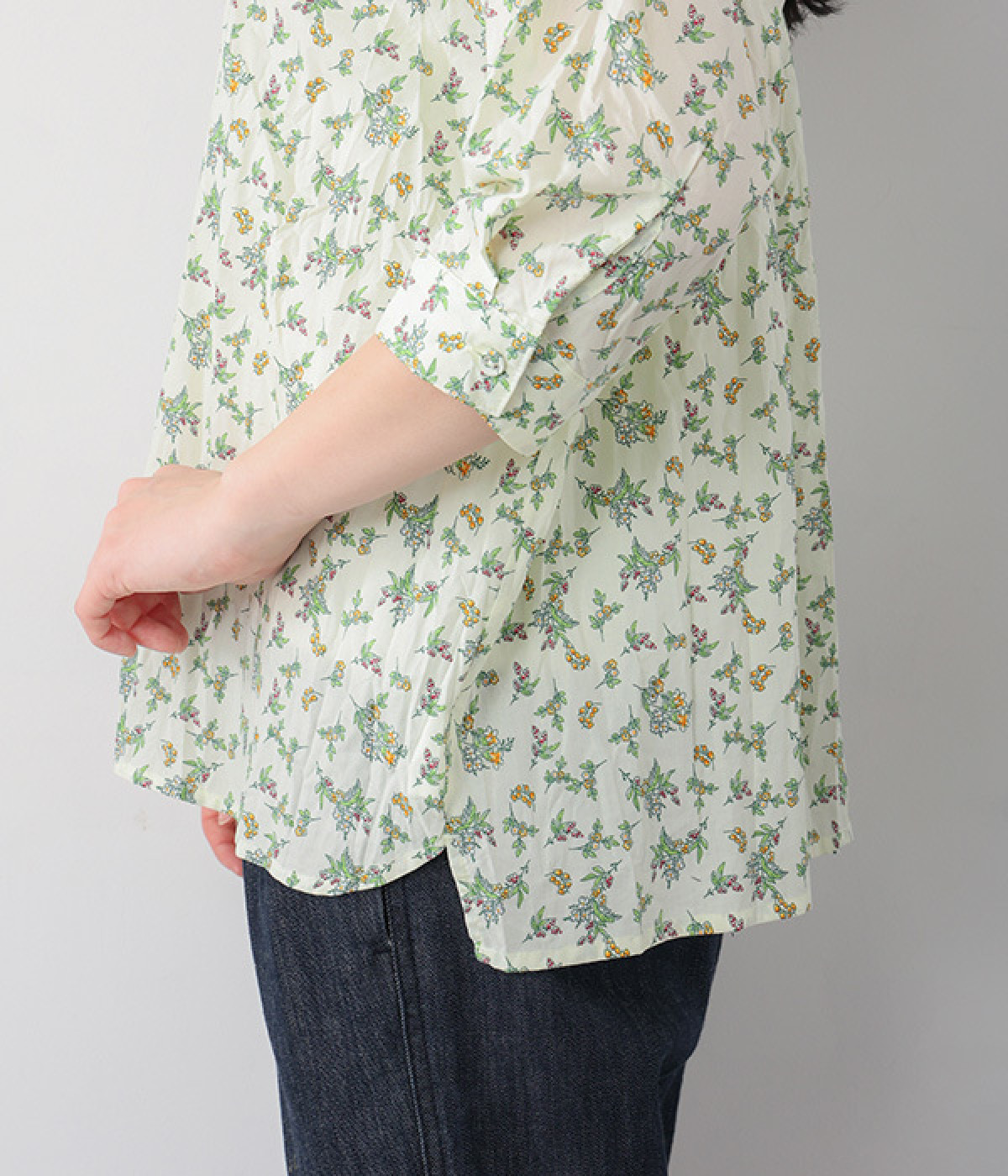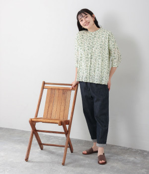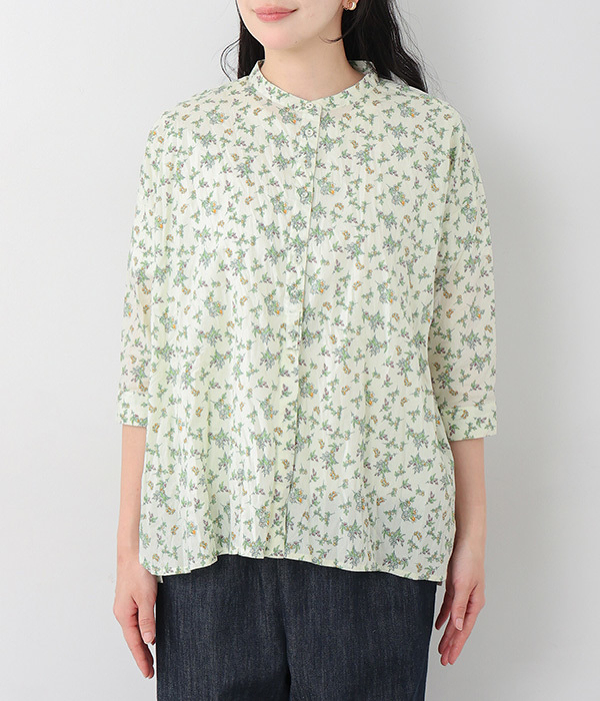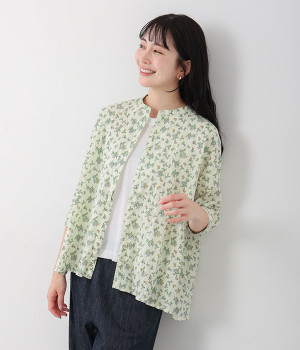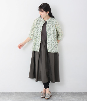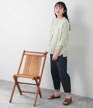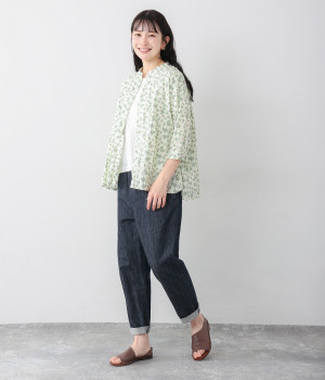 クリンクル加工を施した、シワの表情がかわいいシャツです。どこかレトロなフラワープリントが目をひく、着こなしの主役になる一枚。共布のくるみボタンは、途中から比翼にして、すっきりとした印象に仕上げました。ひじまで隠す袖丈とやや薄手の軽やかな生地で、日差し除けにも重宝しそう。スカートにもパンツにも合わせやすい絶妙なシルエットで、さまざまなコーディネートが楽しめます。