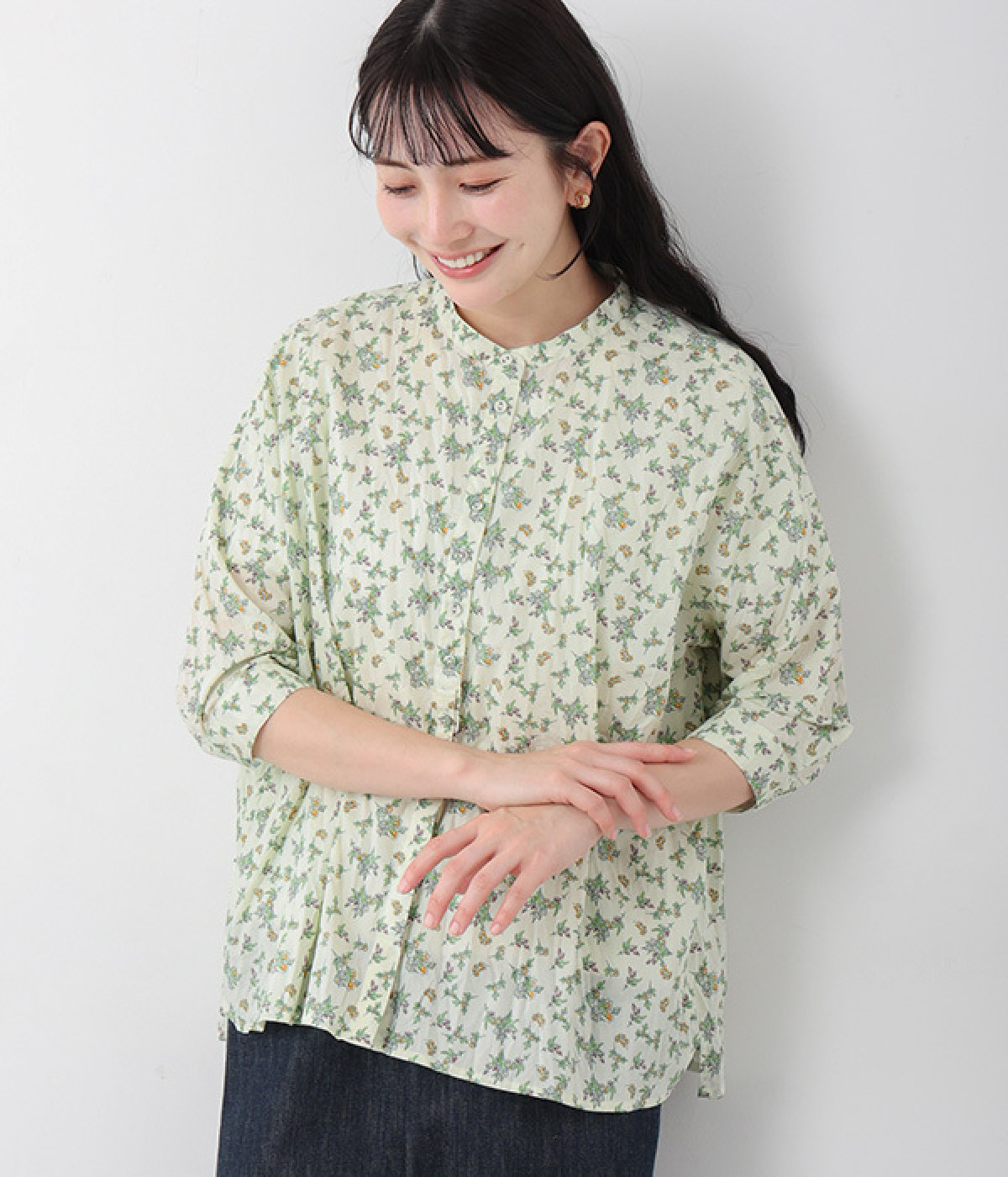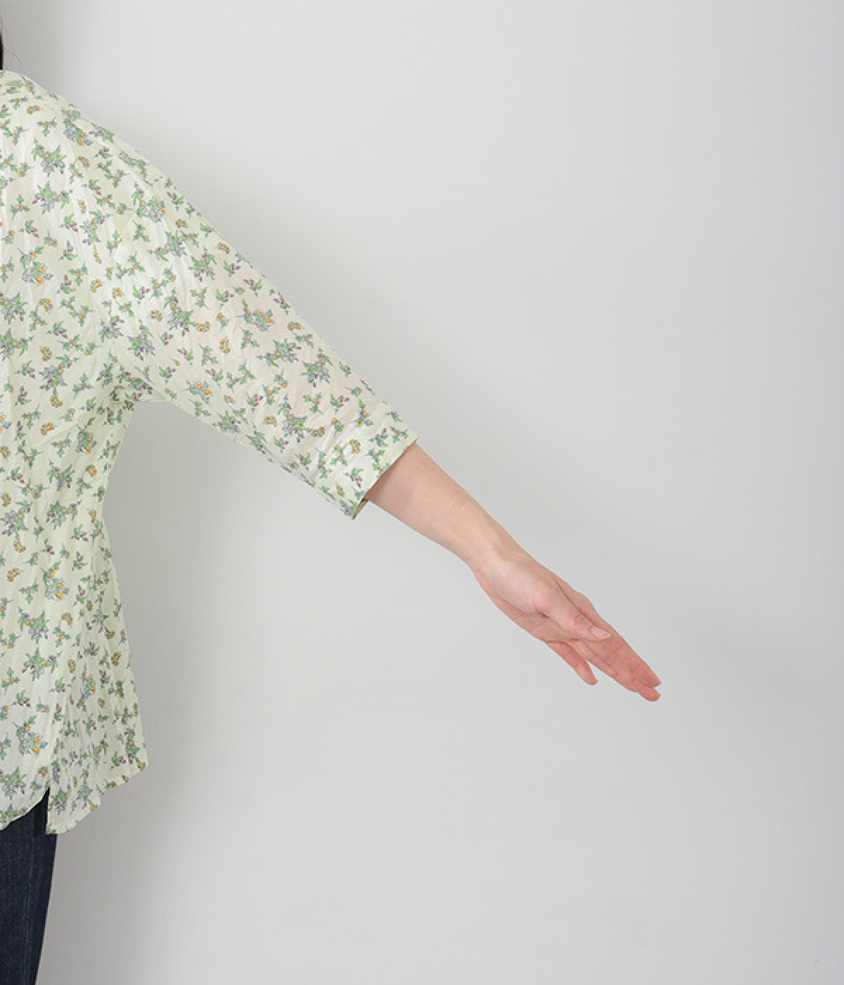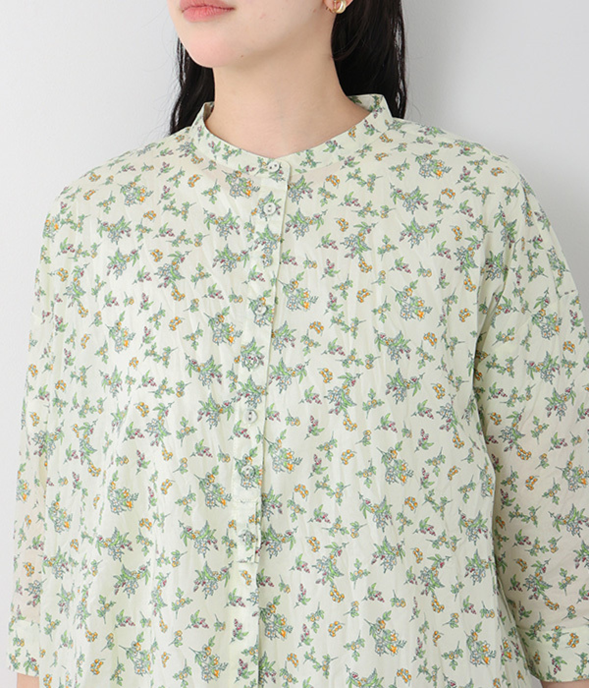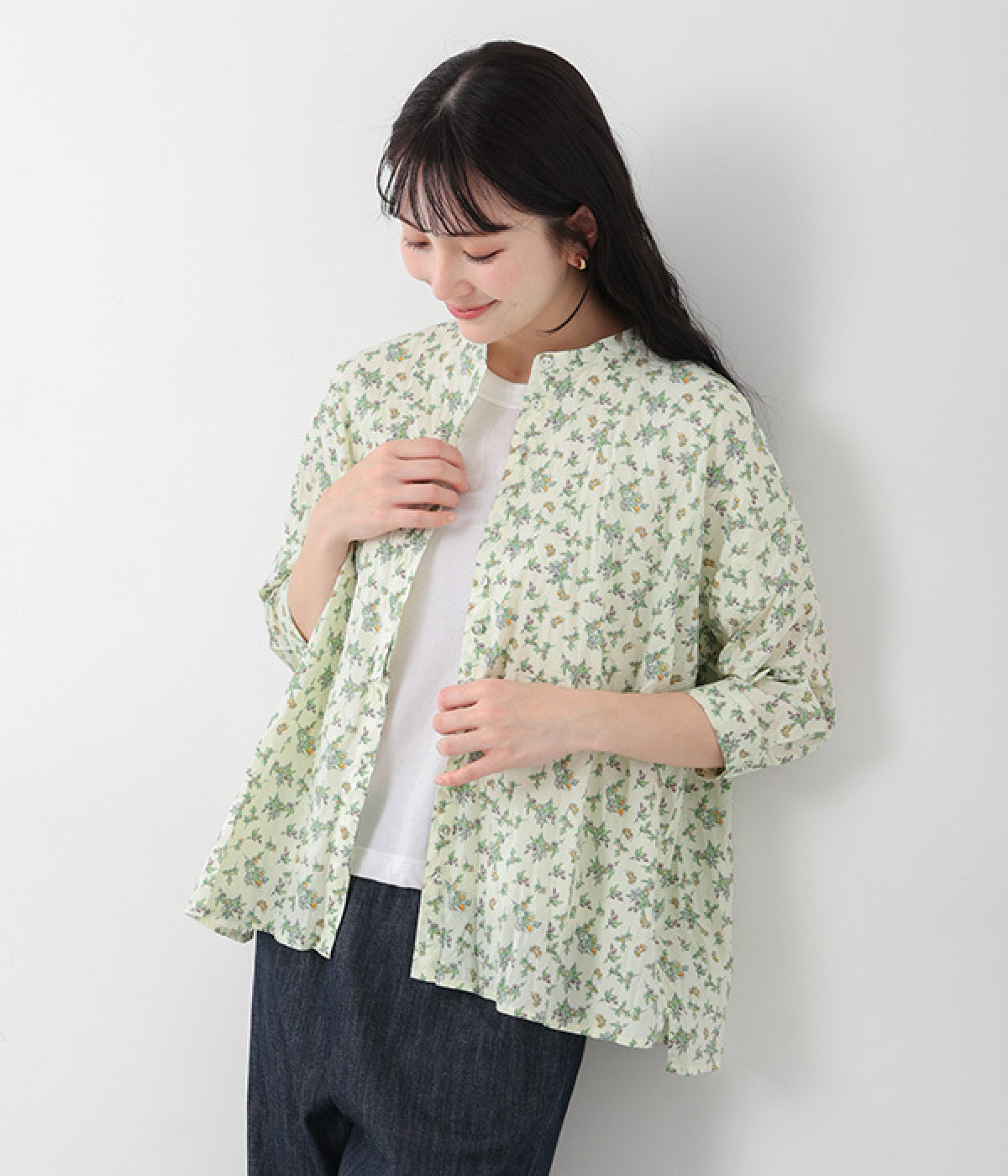 クリンクル加工を施した、シワの表情がかわいいシャツです。どこかレトロなフラワープリントが目をひく、着こなしの主役になる一枚。共布のくるみボタンは、途中から比翼にして、すっきりとした印象に仕上げました。ひじまで隠す袖丈とやや薄手の軽やかな生地で、日差し除けにも重宝しそう。スカートにもパンツにも合わせやすい絶妙なシルエットで、さまざまなコーディネートが楽しめます。