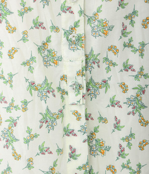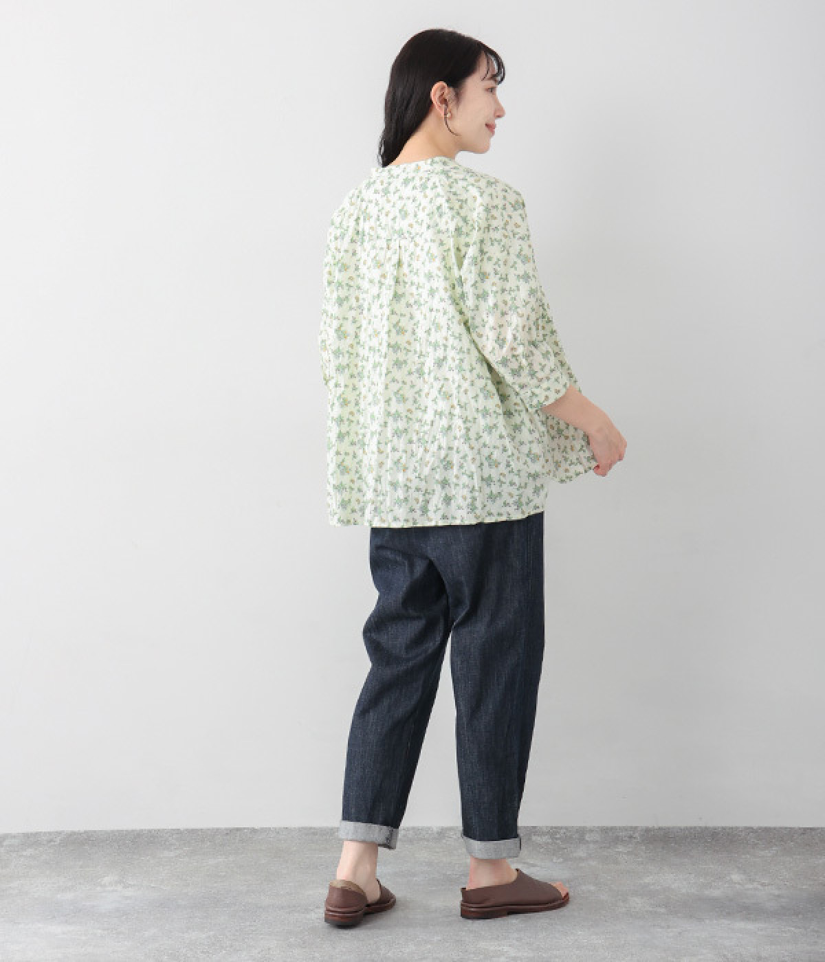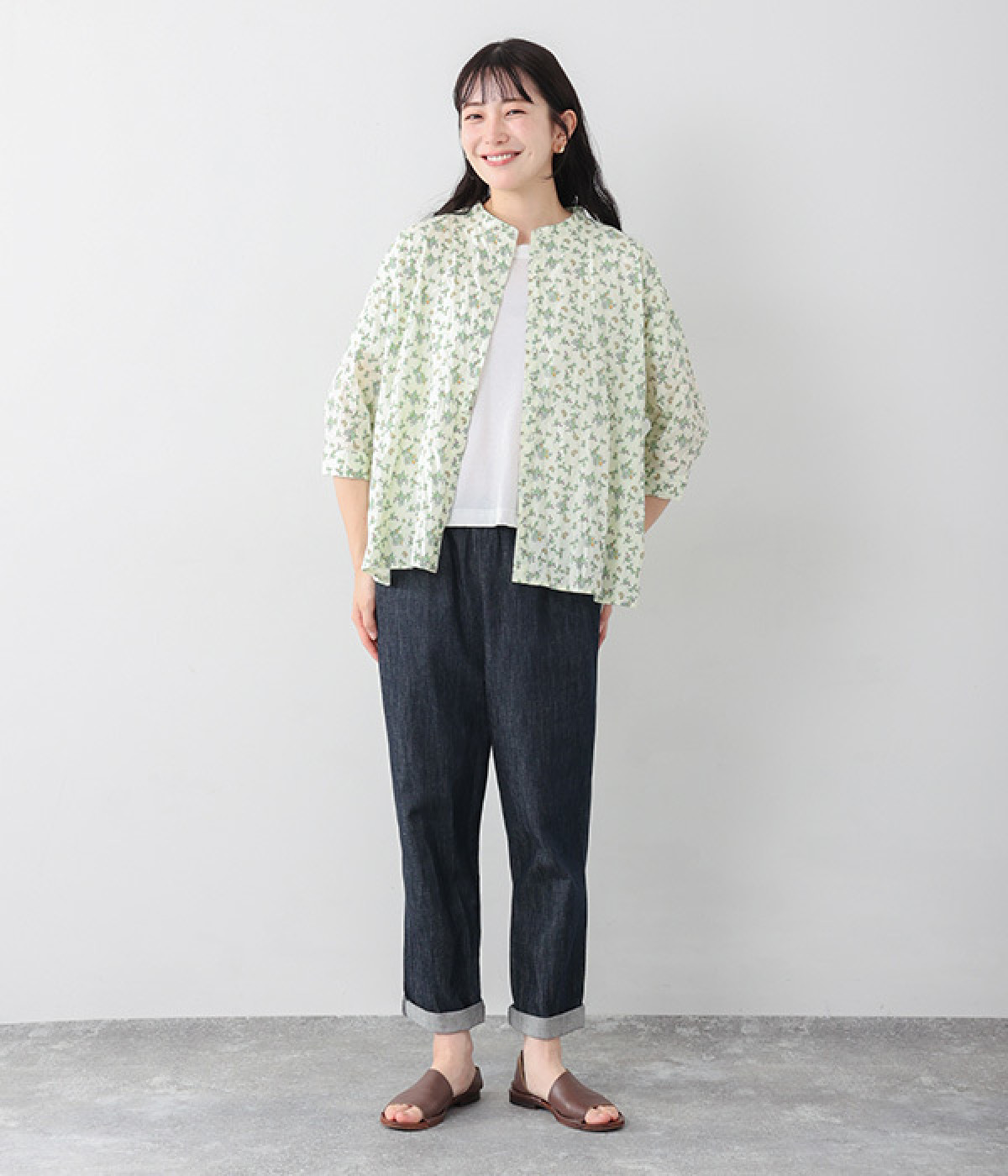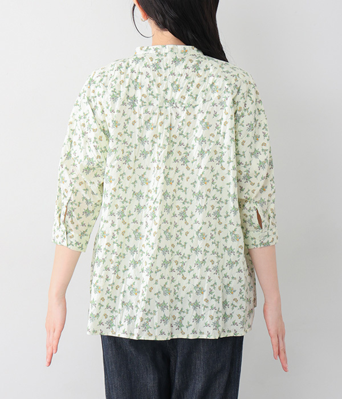 クリンクル加工を施した、シワの表情がかわいいシャツです。どこかレトロなフラワープリントが目をひく、着こなしの主役になる一枚。共布のくるみボタンは、途中から比翼にして、すっきりとした印象に仕上げました。ひじまで隠す袖丈とやや薄手の軽やかな生地で、日差し除けにも重宝しそう。スカートにもパンツにも合わせやすい絶妙なシルエットで、さまざまなコーディネートが楽しめます。
