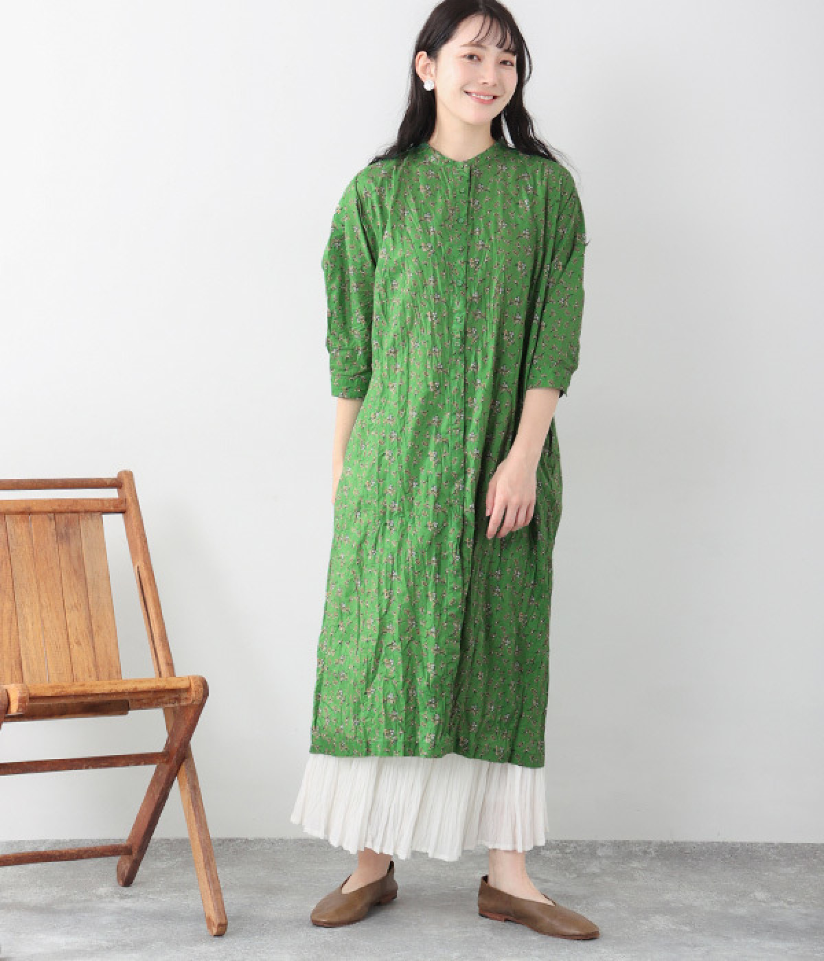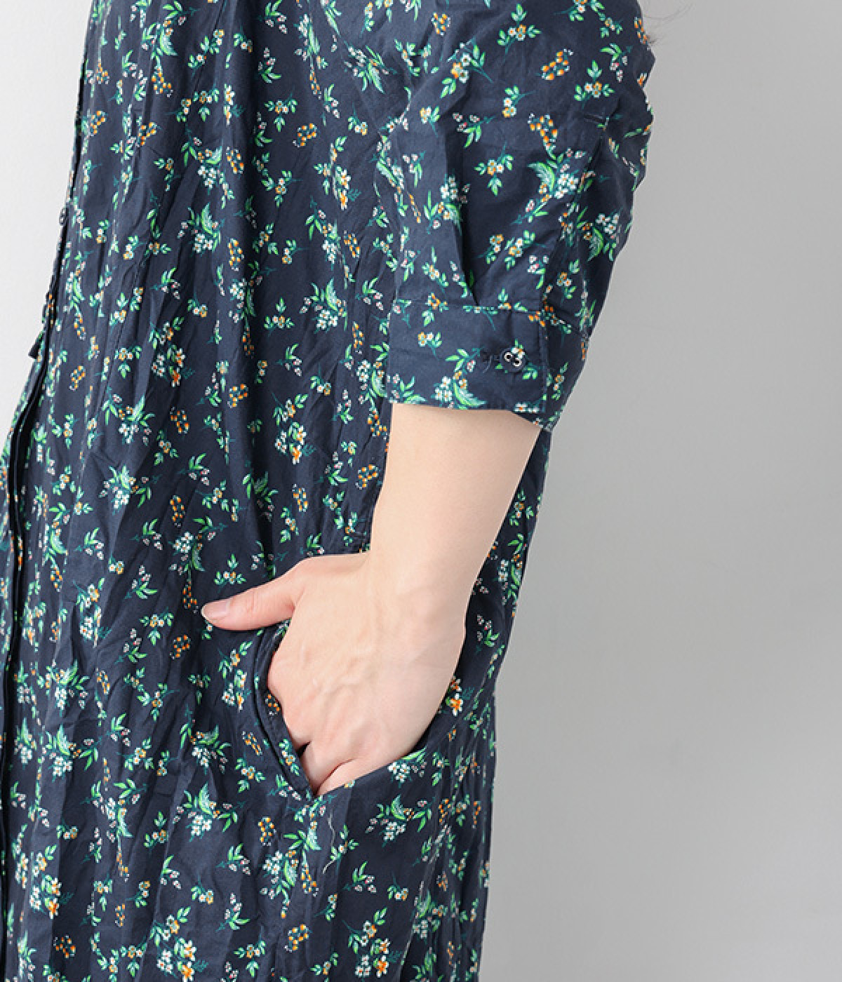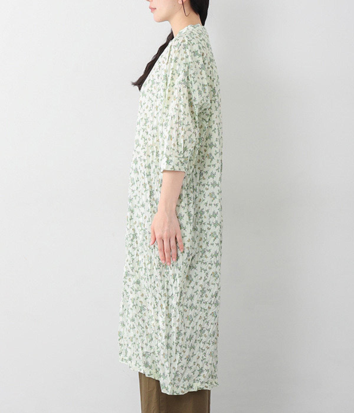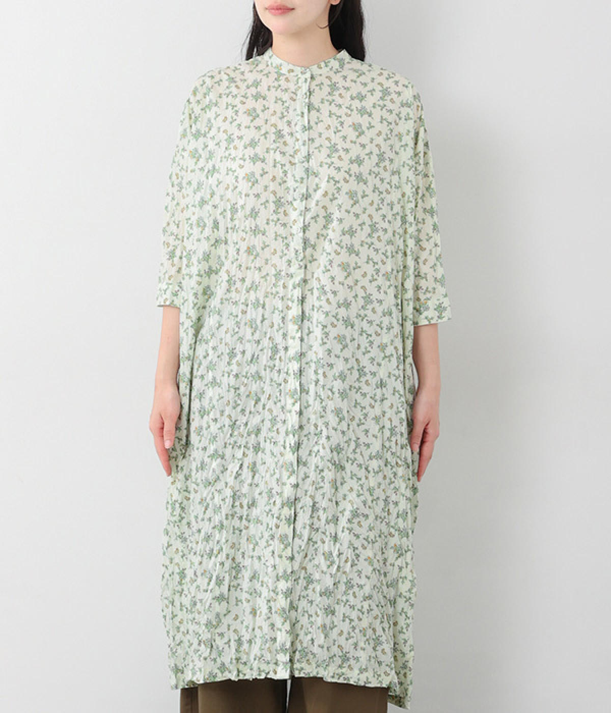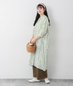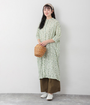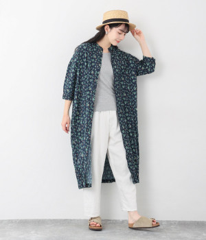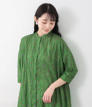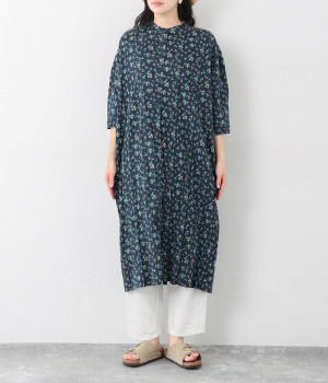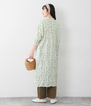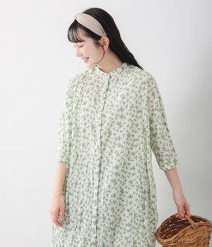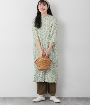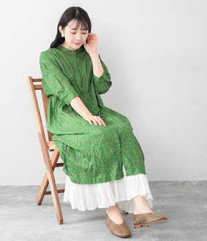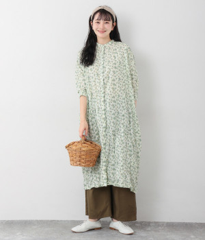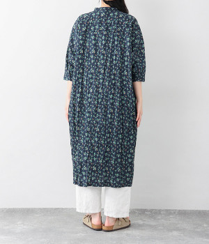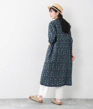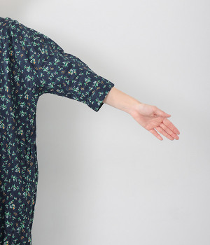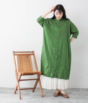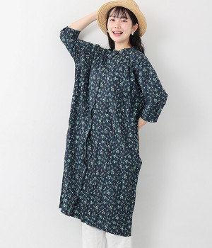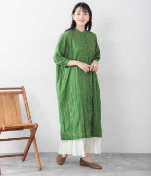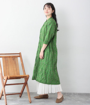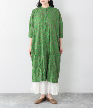 クリンクル加工を施した、シワの表情がかわいいワンピースです。どこかレトロなフラワープリントが目をひく、着こなしの主役になる一枚。共布のくるみボタンは途中から比翼にして、全体をすっきりと見せています。ひじまで隠す袖丈とやや薄手の軽やかな生地で、日差し除けにも重宝しそう。ボタンをあけてパンツスタイルや無地のノースリーブワンピースに羽織るのもおすすめです。