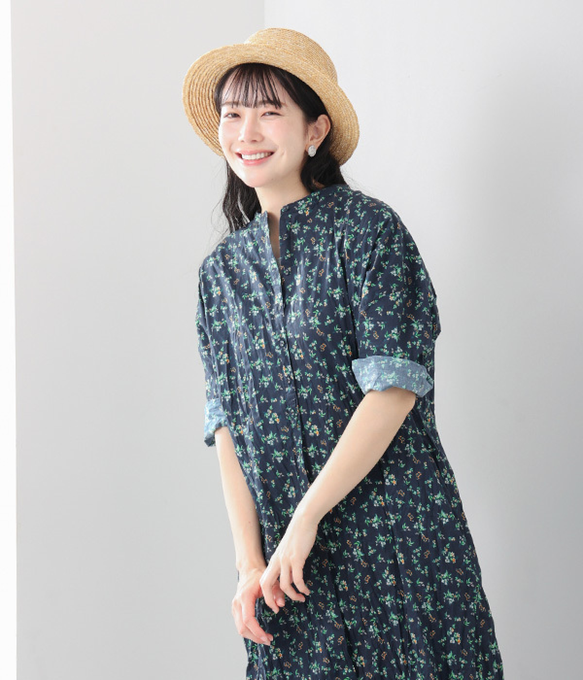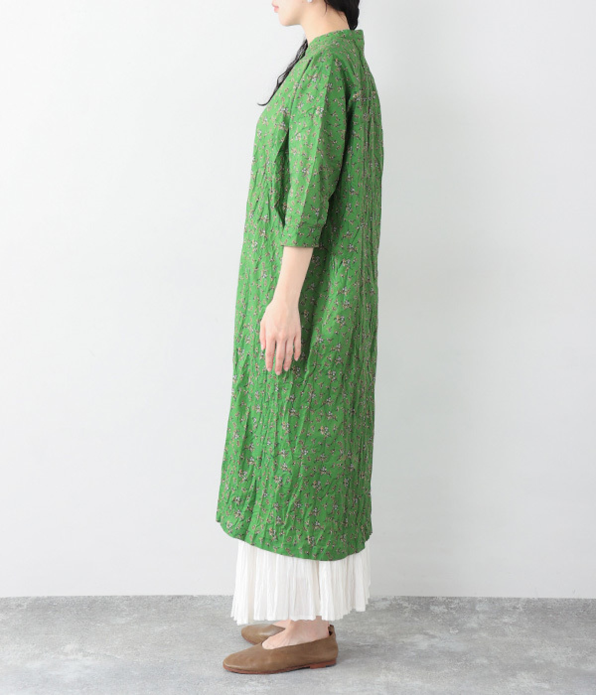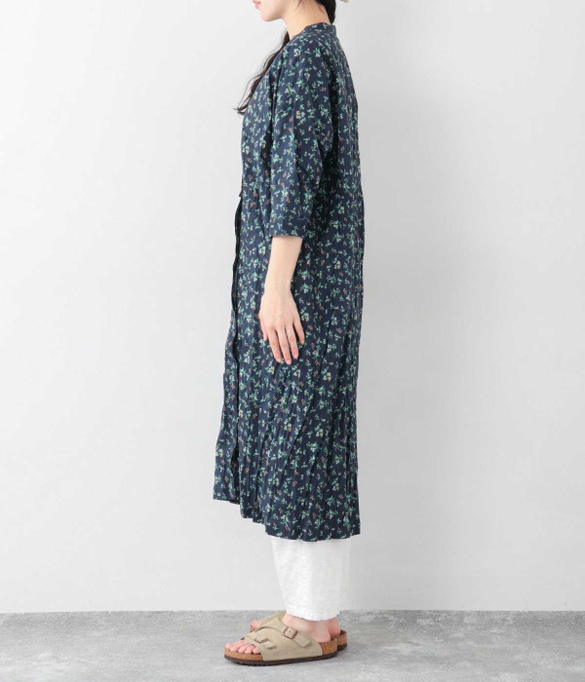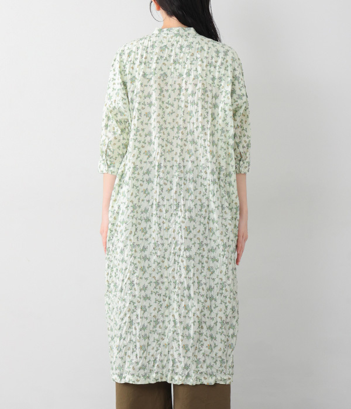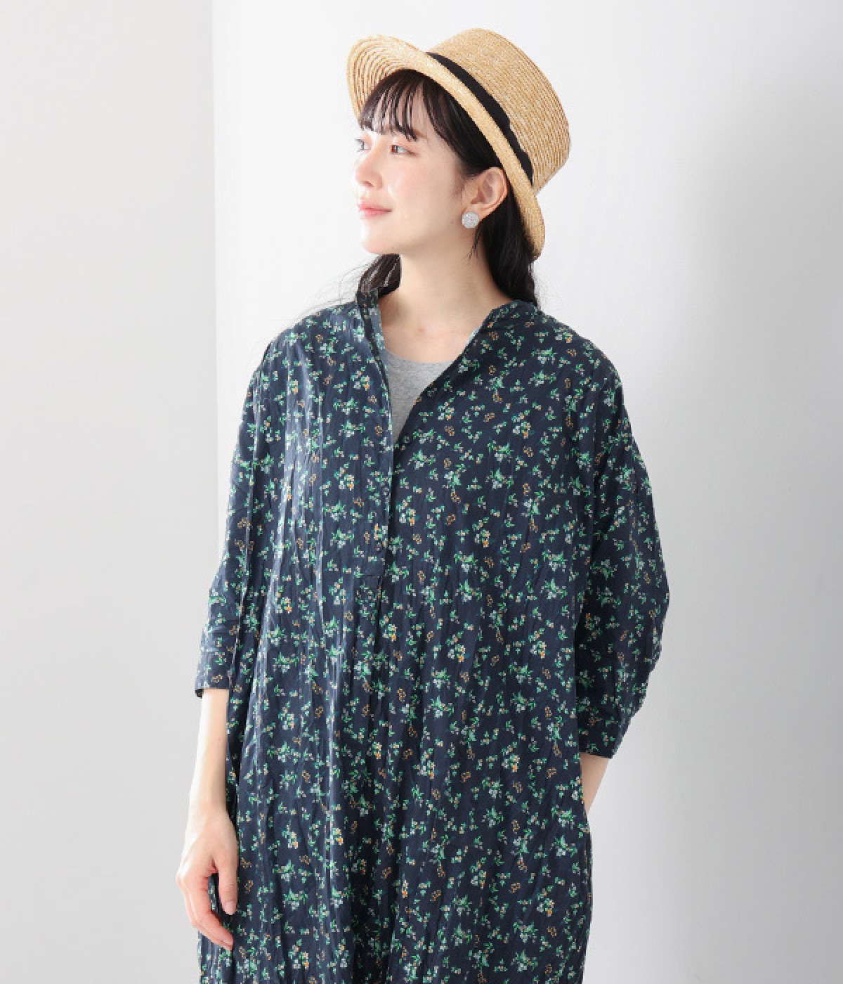 クリンクル加工を施した、シワの表情がかわいいワンピースです。どこかレトロなフラワープリントが目をひく、着こなしの主役になる一枚。共布のくるみボタンは途中から比翼にして、全体をすっきりと見せています。ひじまで隠す袖丈とやや薄手の軽やかな生地で、日差し除けにも重宝しそう。ボタンをあけてパンツスタイルや無地のノースリーブワンピースに羽織るのもおすすめです。