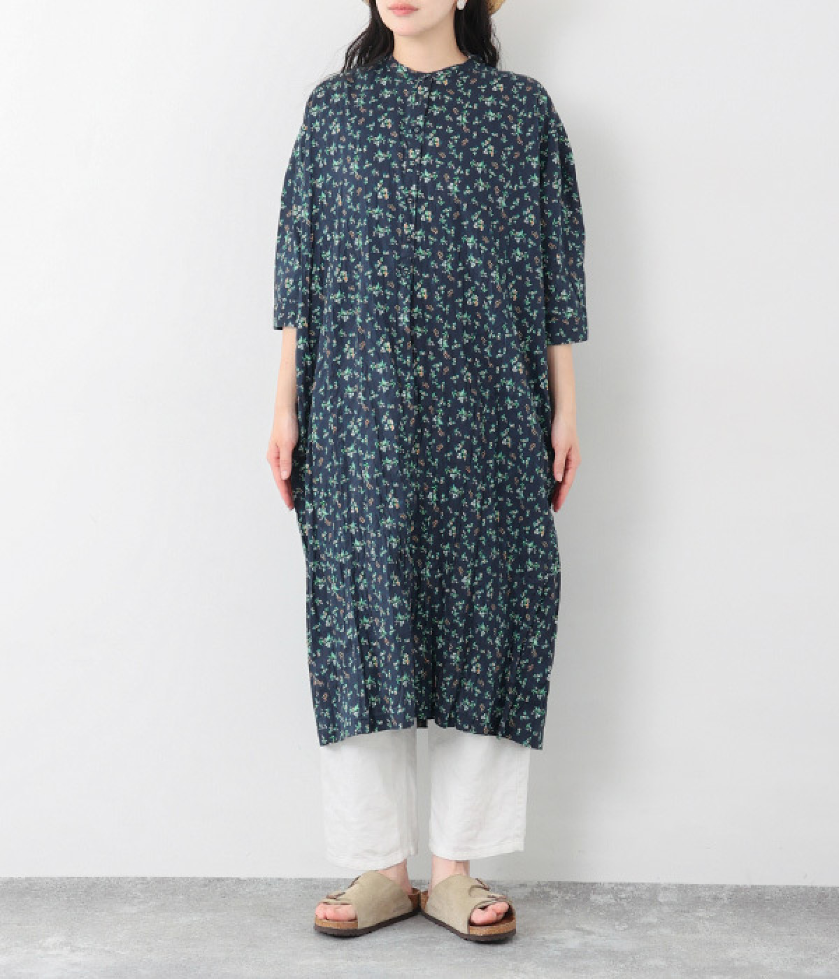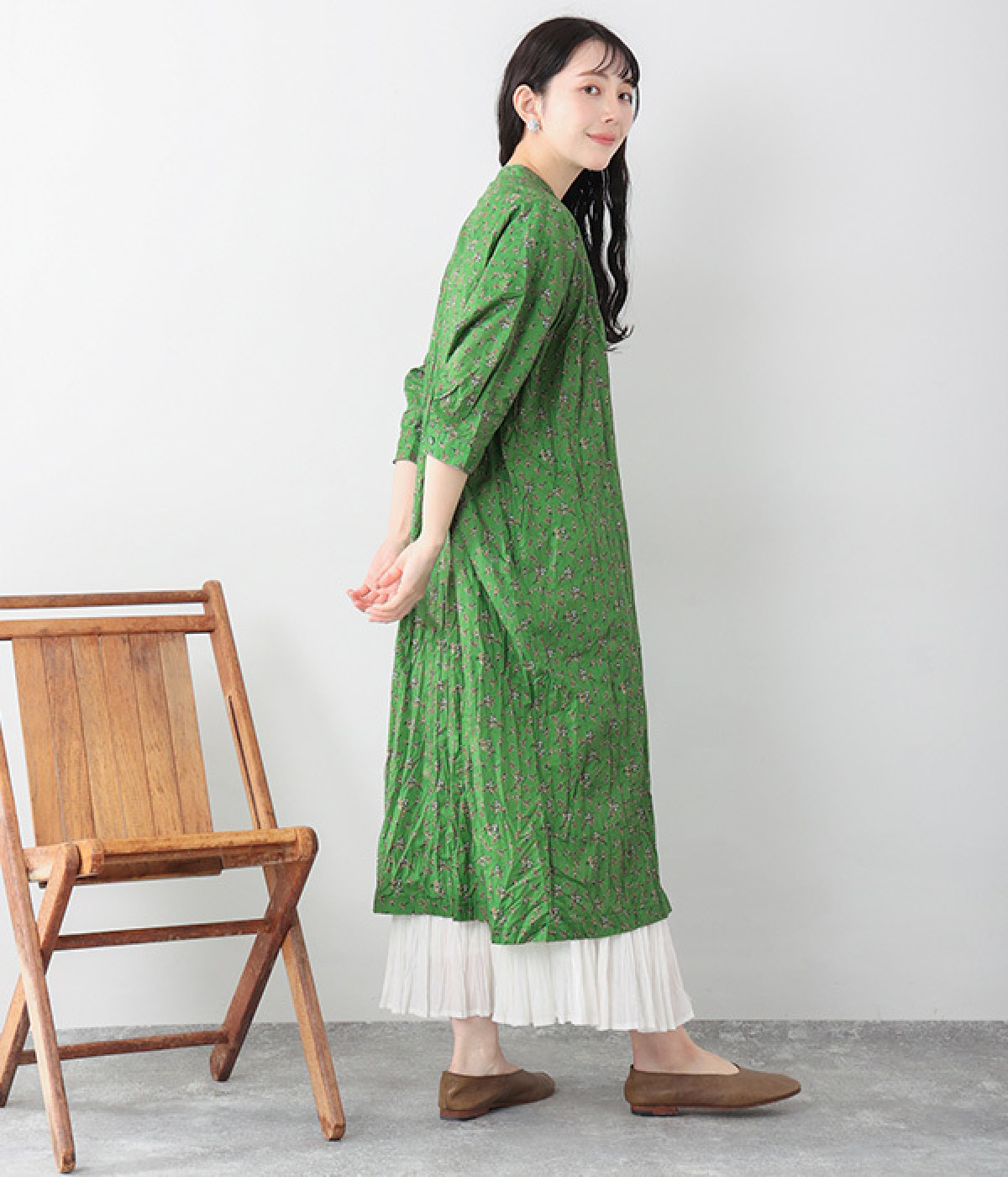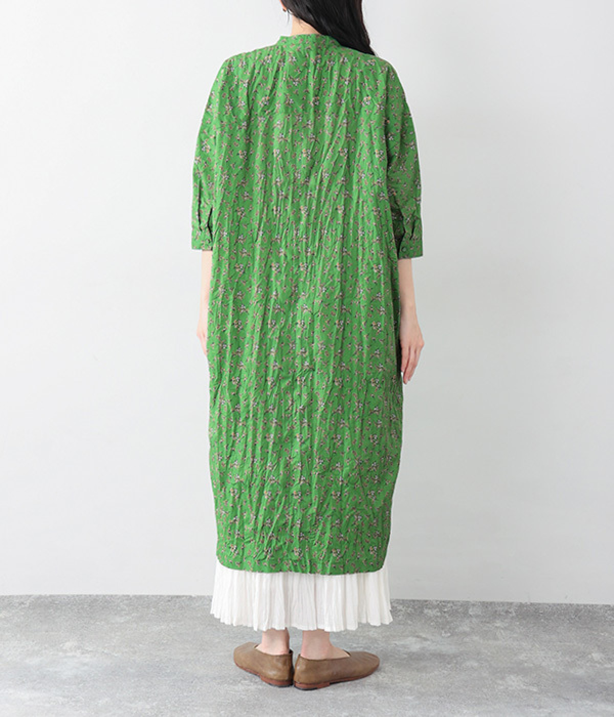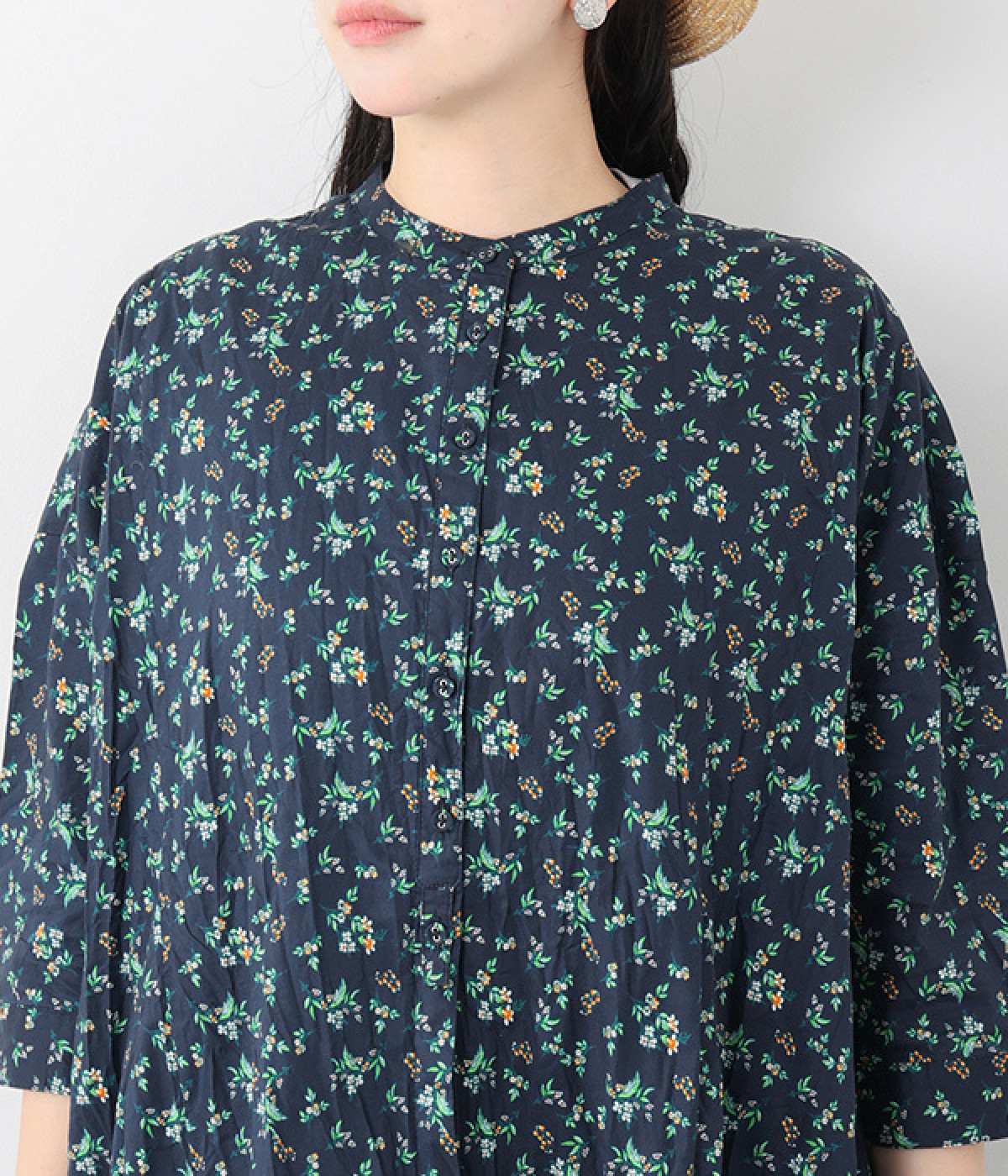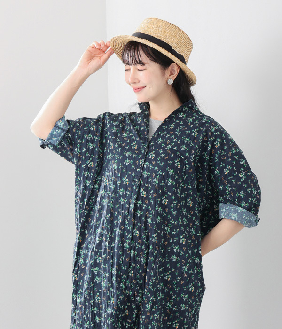 クリンクル加工を施した、シワの表情がかわいいワンピースです。どこかレトロなフラワープリントが目をひく、着こなしの主役になる一枚。共布のくるみボタンは途中から比翼にして、全体をすっきりと見せています。ひじまで隠す袖丈とやや薄手の軽やかな生地で、日差し除けにも重宝しそう。ボタンをあけてパンツスタイルや無地のノースリーブワンピースに羽織るのもおすすめです。