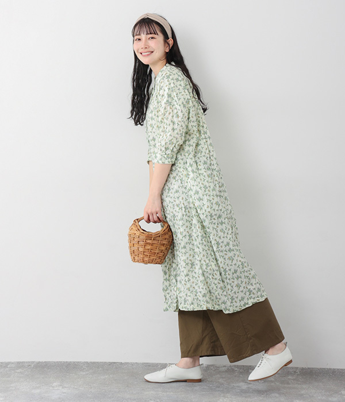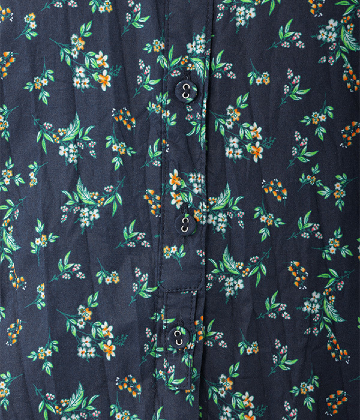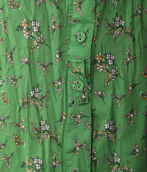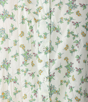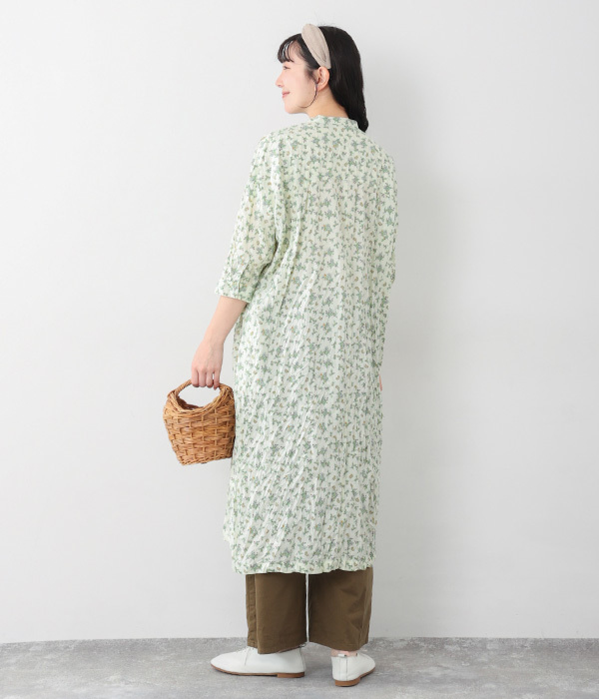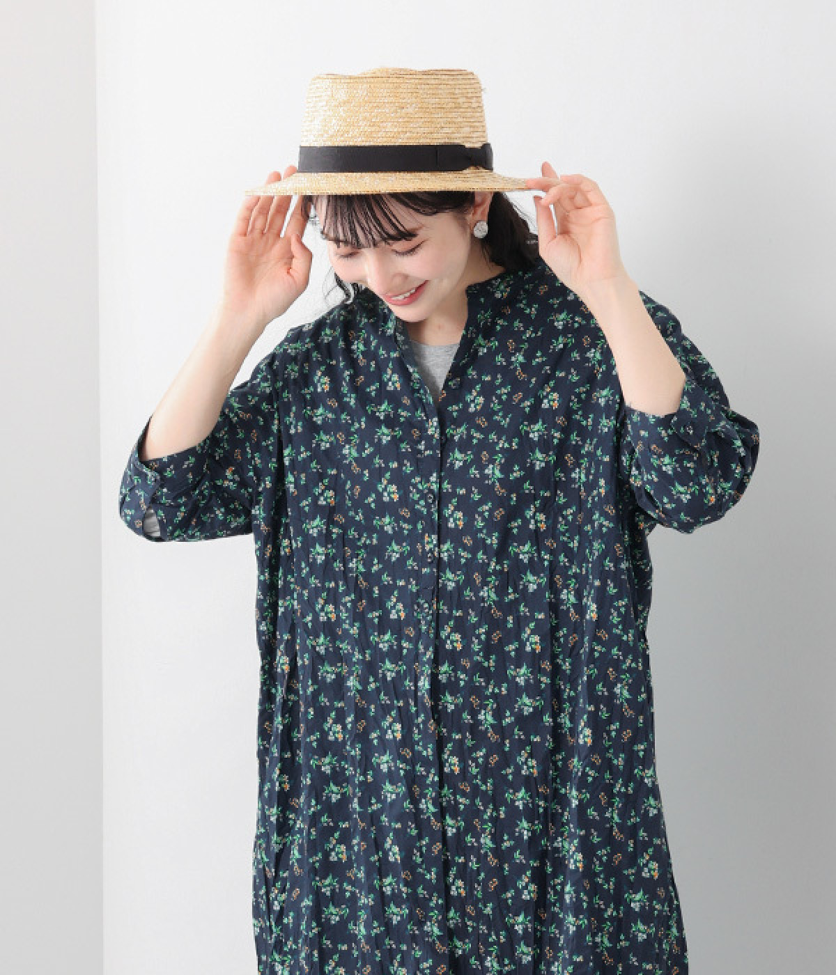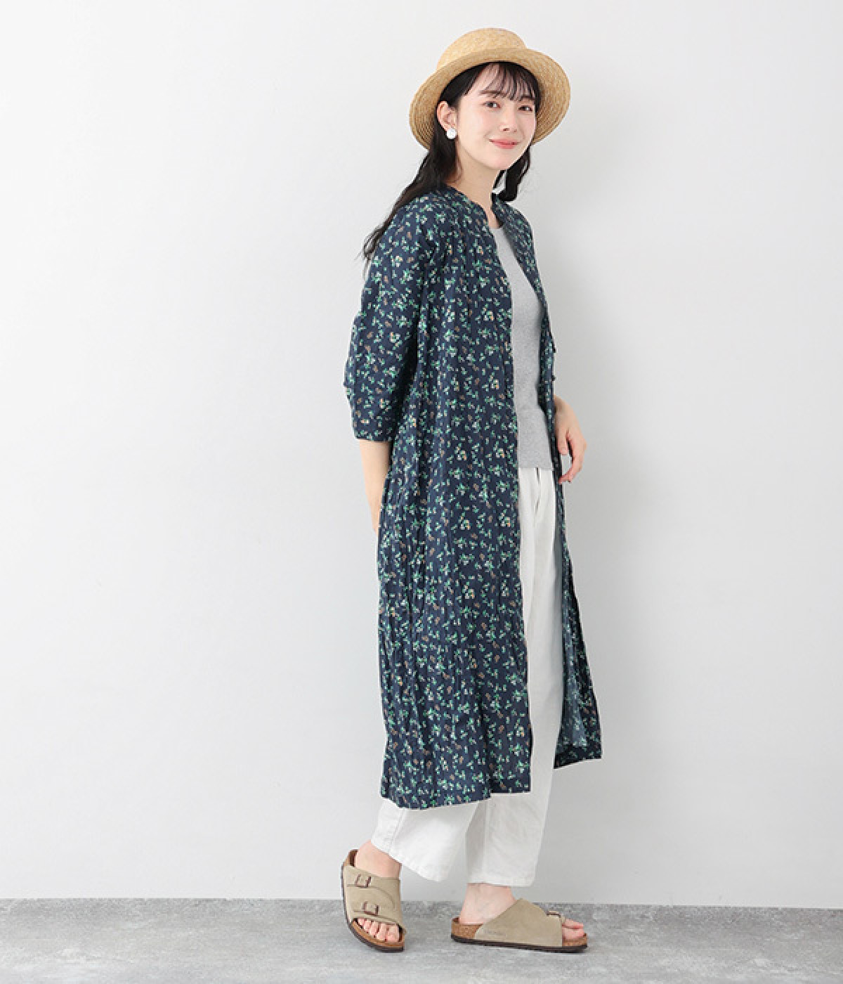 クリンクル加工を施した、シワの表情がかわいいワンピースです。どこかレトロなフラワープリントが目をひく、着こなしの主役になる一枚。共布のくるみボタンは途中から比翼にして、全体をすっきりと見せています。ひじまで隠す袖丈とやや薄手の軽やかな生地で、日差し除けにも重宝しそう。ボタンをあけてパンツスタイルや無地のノースリーブワンピースに羽織るのもおすすめです。