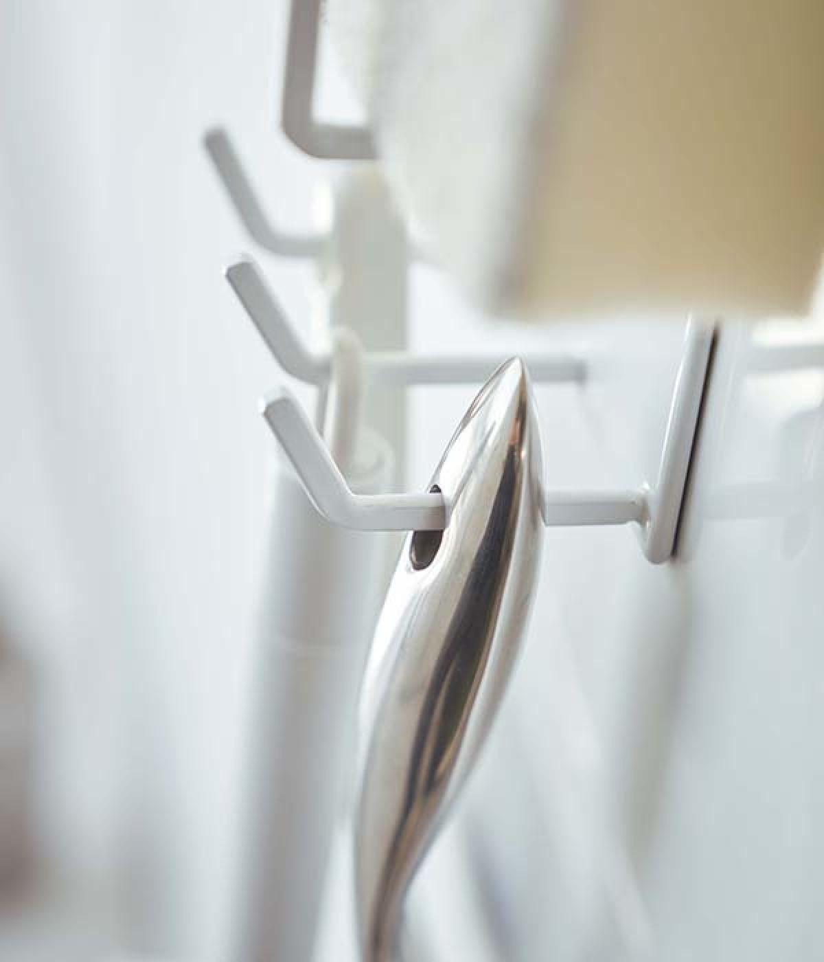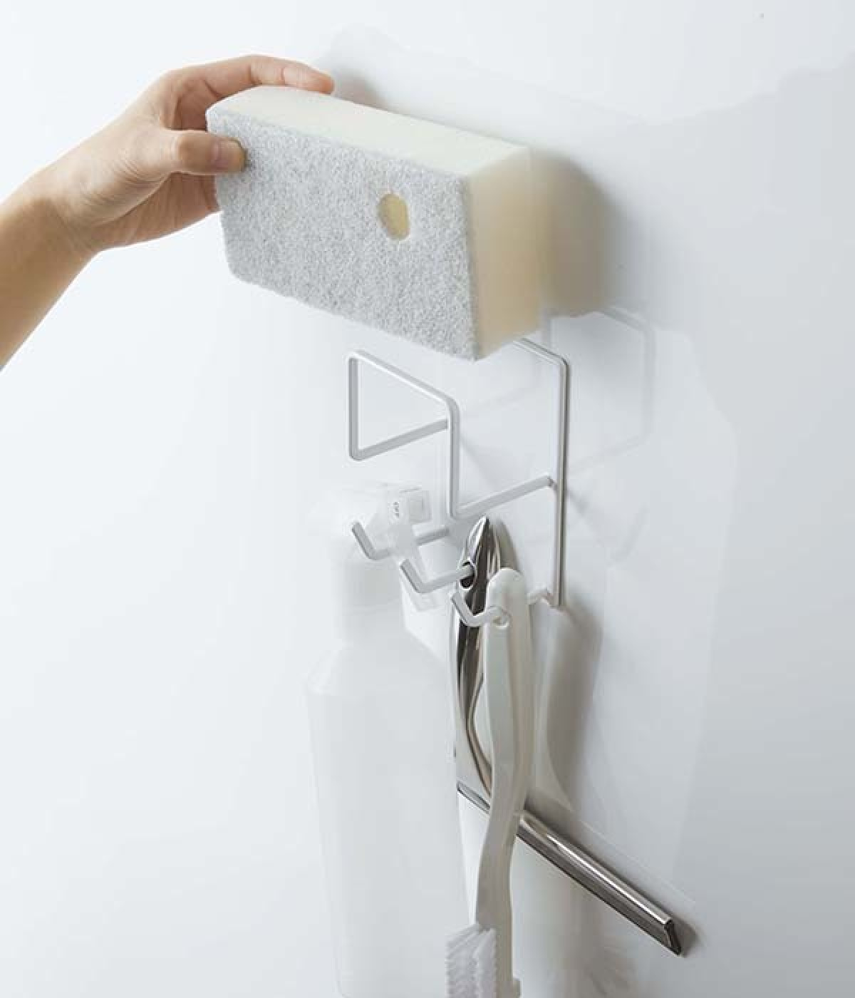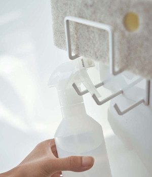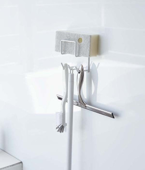 強力マグネット付で、お風呂の壁面に取り付けるだけでスポンジ・掃除ブラシ・スプレーボトルを一括収納する事ができます。スポンジは置くだけの簡単収納。フックは奥行きが長いので、スプレーボトルも掛けられます。耐荷重量も約1kgあるので安心です。置き場所に困るおそうじグッズをまとめて壁面に収納して、床スペースを広く使ってみませんか。