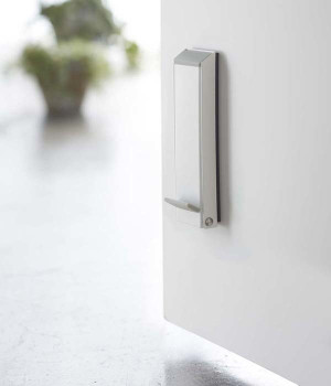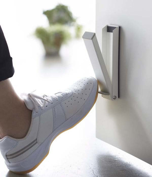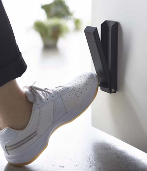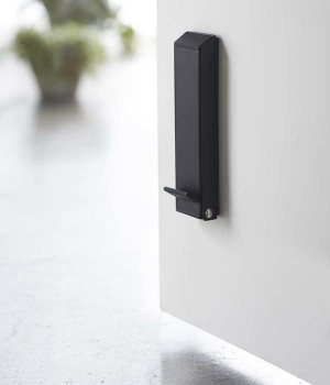 立ったまま操作できる便利な玄関ドアストッパー。スチール製ドアにマグネットで簡単取り付ける事ができます。片足でサッと押し下げてドアを固定。使わない時は折り畳んでスリムに収納しておくことができます。