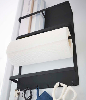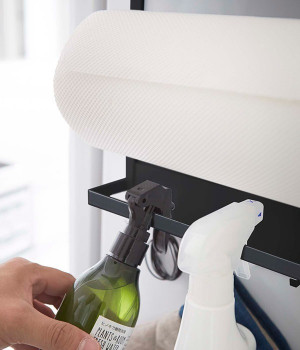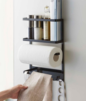 上段には、ラップやアルミホイルを立てて入れることができます。中段には、キッチンペーパーや布巾を掛けられるサイドオープンハンガーと、布巾や洗剤などをハンギング出来るホルダー付き。下段にはフックが付いているので、鍋つかみ、栓抜き、缶切りなどを吊るして収納できます。