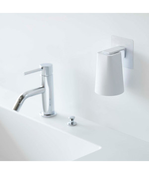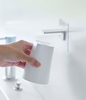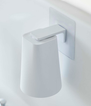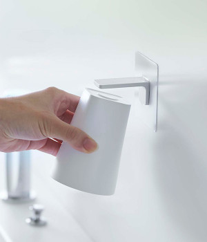 マグネットで浮かせて収納できる、マグネットとタンブラーのセットアイテムです。宙に浮かせることによってタンブラーの水切りがよくなって衛生的なのがうれしいポイント。ホルダーはフィルムフックで簡単に貼り付けできて、浴室のタイルや洗面壁面などにも取り付け可能です。マグネットがつく壁面ならタンブラーを直接収納することもできます。