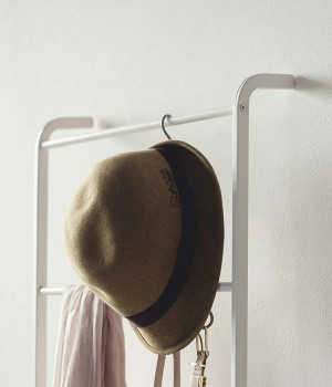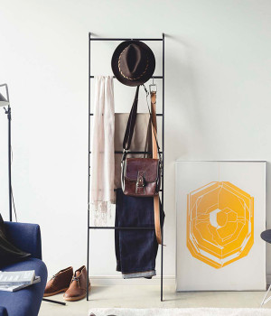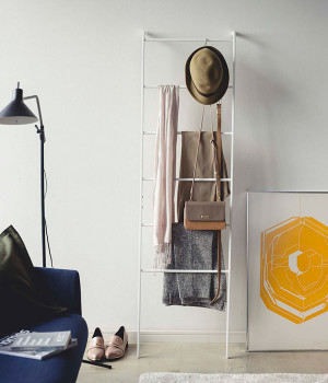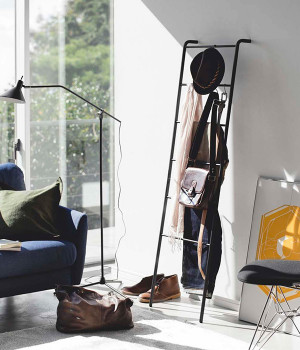 ズボンやスカーフの収納、洋服の一時掛けにも便利なはしご型の立て掛けラダーハンガータワーです。S字フックを使用すればベルトなどを引っかけたり、小物を吊るしたりして収納できます。タオルや衣類の一時掛けにも便利です。スリムな設計なので、物の多いリビングでも圧迫感なく設置可能。立て掛け設計なので置く場所を選ばないのも嬉しいポイントです。