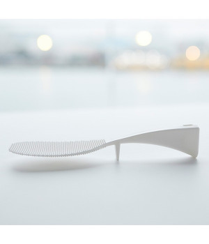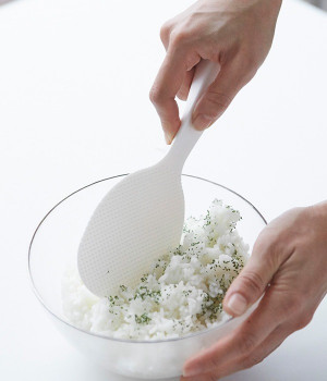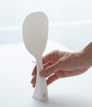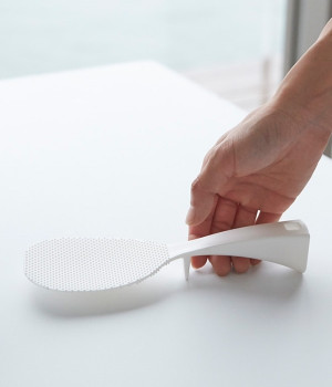 置き場所に困っても自立するので省スペースに立たせたり、先端が浮くので衛生的に横向きに置けたり、フックにかけて他のキッチンツールと一緒に並べたりと3通りの収納ができる便利なしゃもじです。釜の底のお米もすくいやすい、へら形状になっています。お米がつきにくいようエンボス加工も施しています。