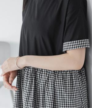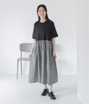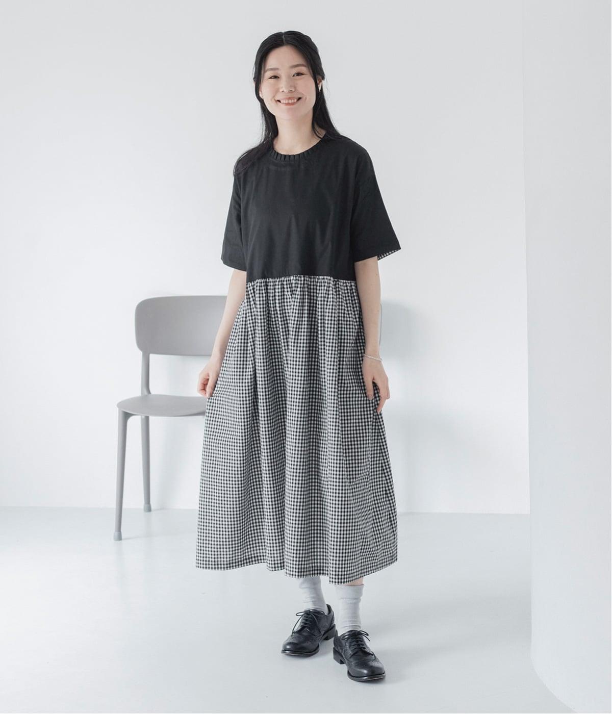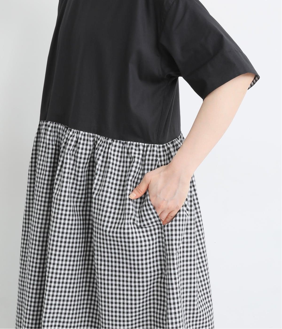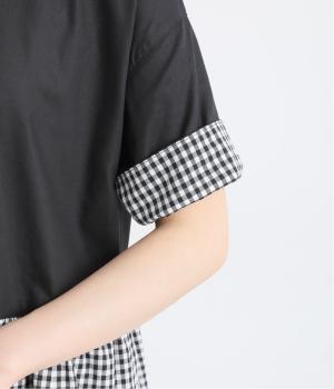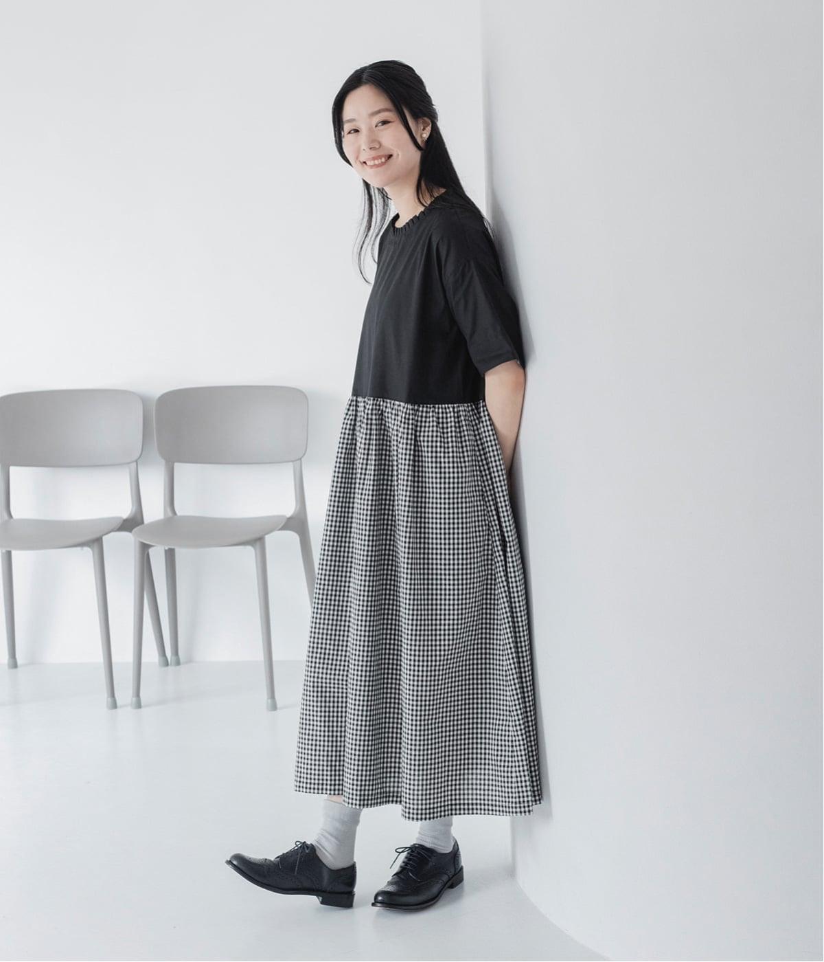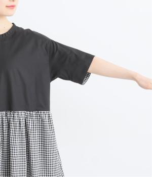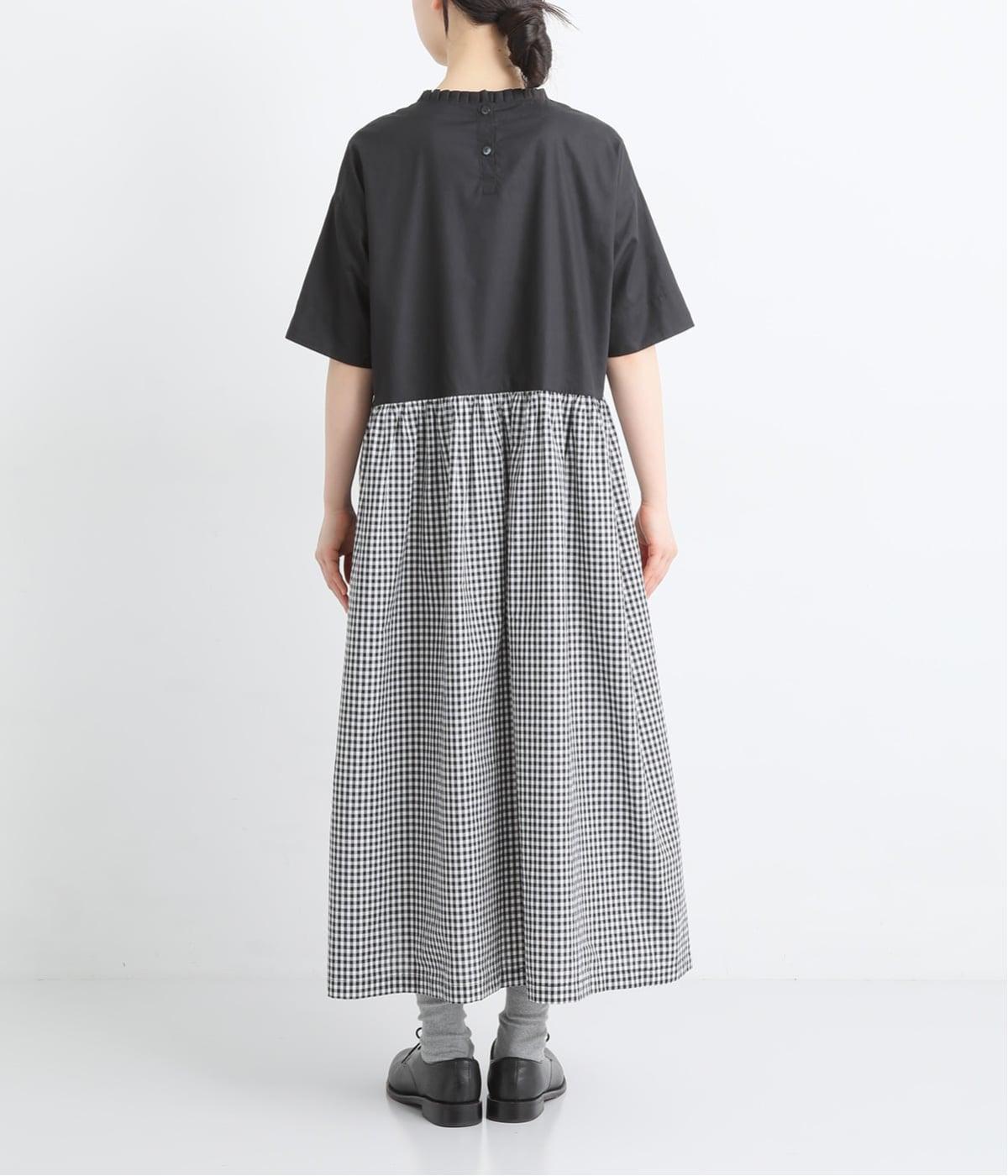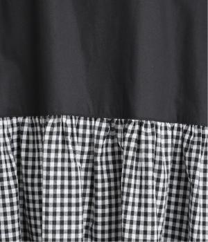 無地のブラックとギンガムチェックを組み合わせた襟フリル切替ワンピース。首元のタックフリルがクラシカルな雰囲気を引き立てます。