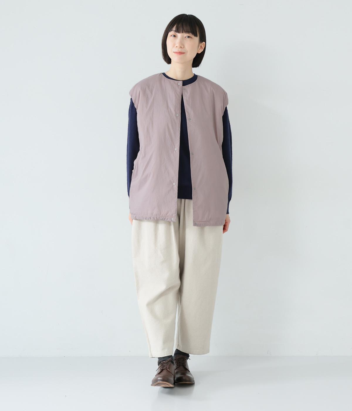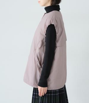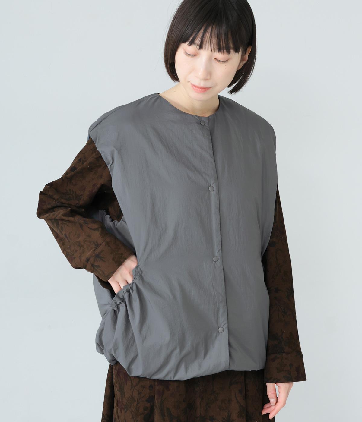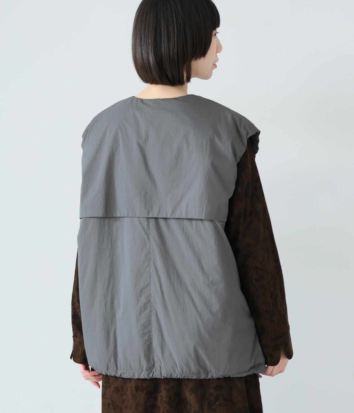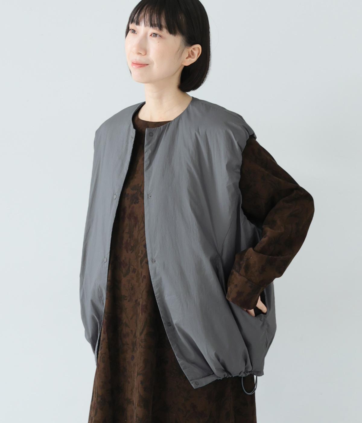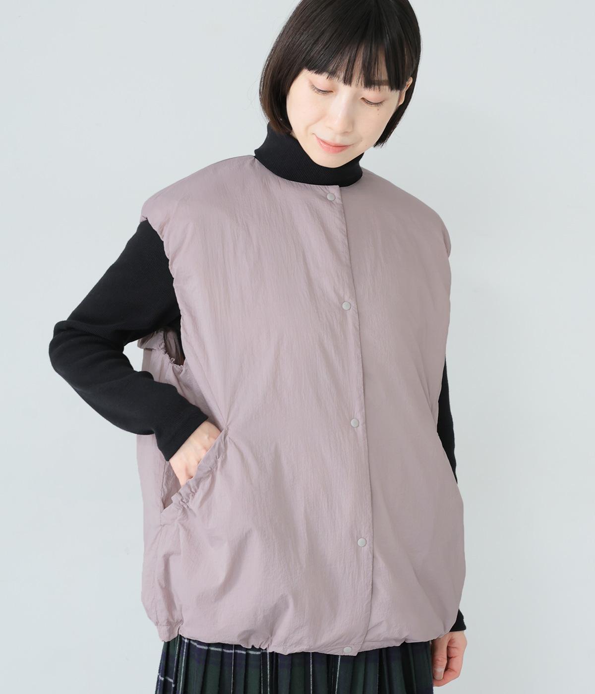軽くてあたたかい中綿入りのベスト。シンプルなデザインとくすみカラーで、カジュアルすぎない大人らしい仕上がりに。裾とポケット口にはドローコード入りで、シルエットのアレンジも可能です。背ヨーク切り替えを加えた、後ろ姿もかわいいポイント。コートのインナーにもおすすめです。
