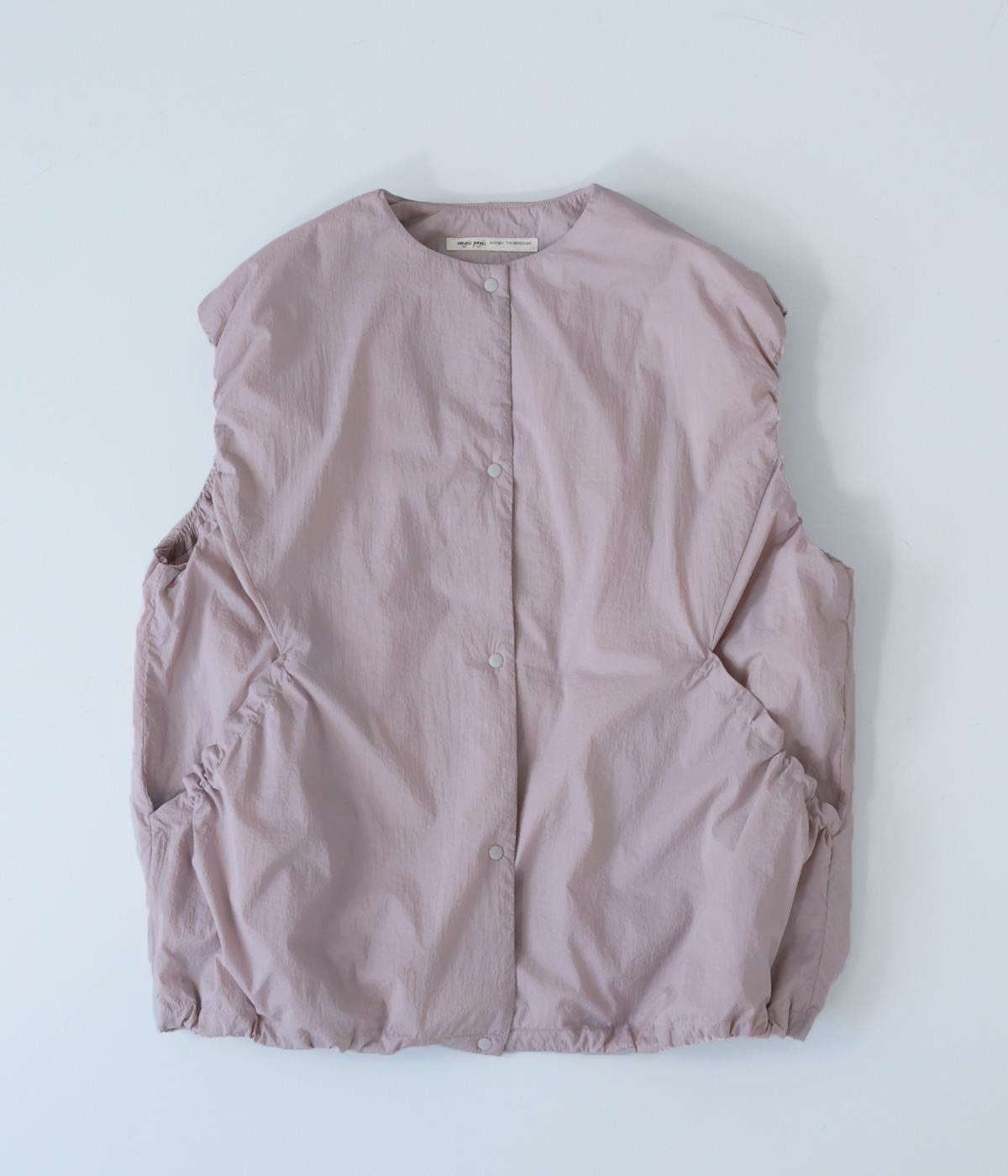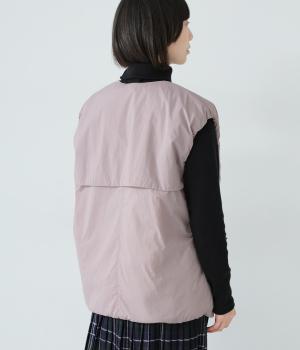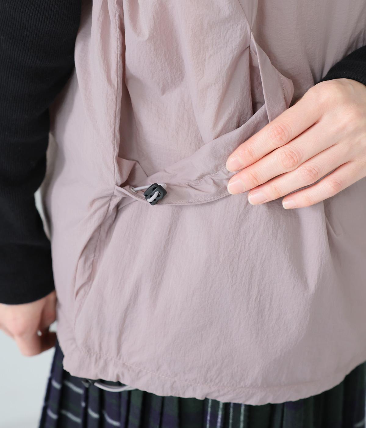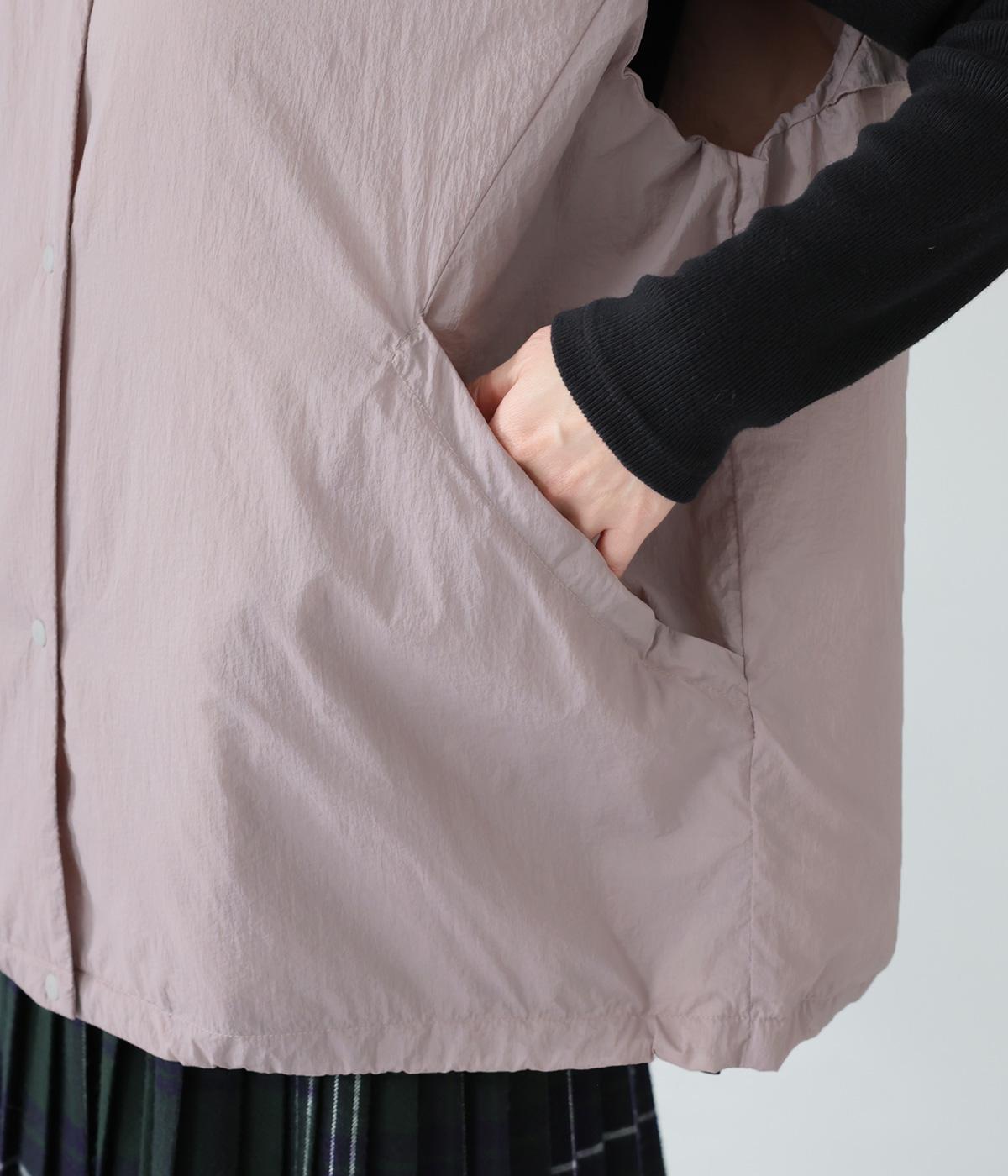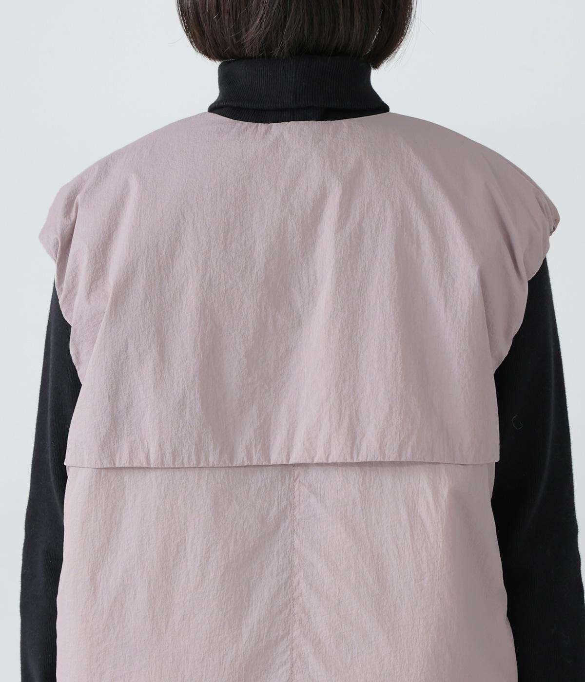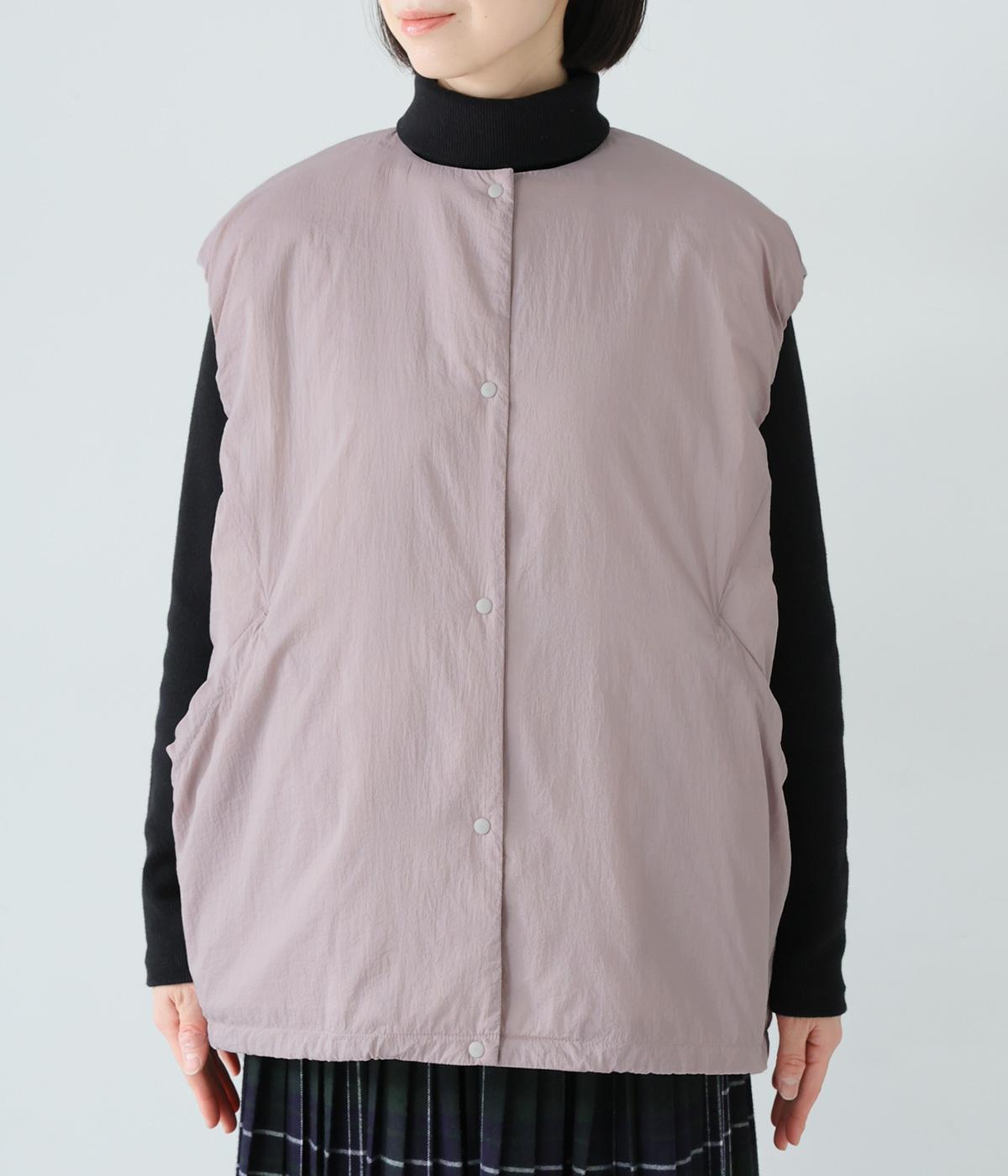 軽くてあたたかい中綿入りのベスト。シンプルなデザインとくすみカラーで、カジュアルすぎない大人らしい仕上がりに。裾とポケット口にはドローコード入りで、シルエットのアレンジも可能です。背ヨーク切り替えを加えた、後ろ姿もかわいいポイント。コートのインナーにもおすすめです。