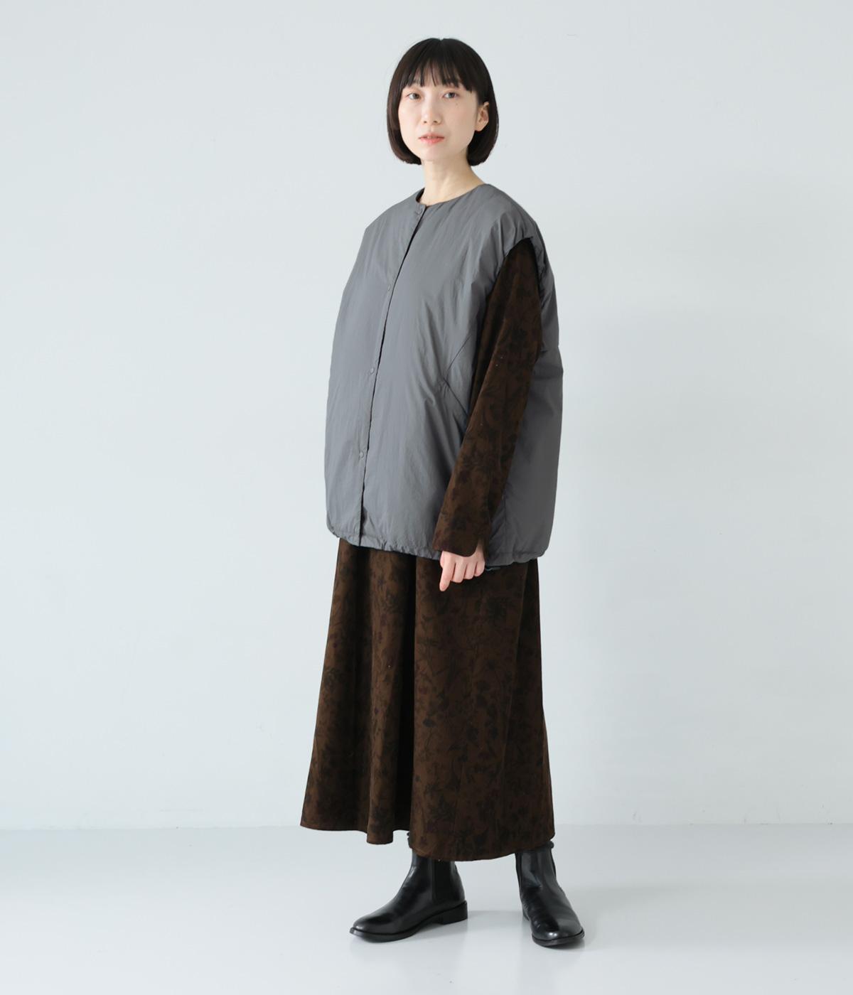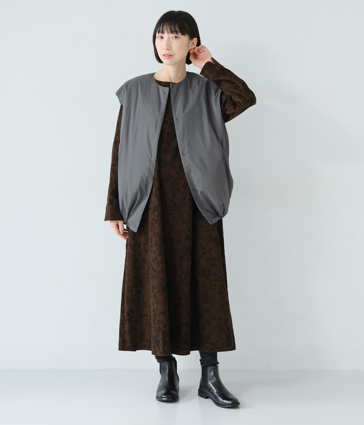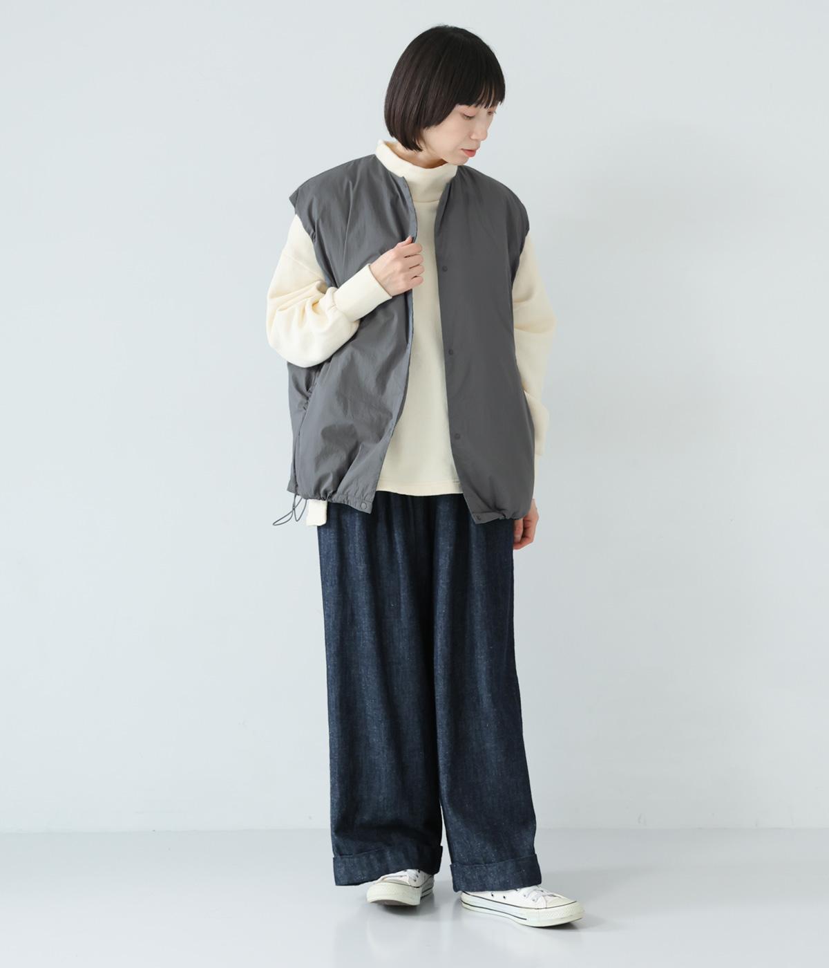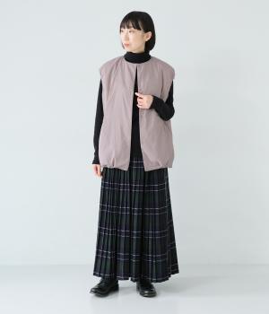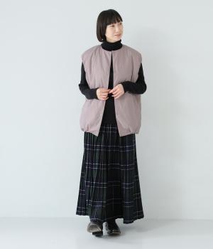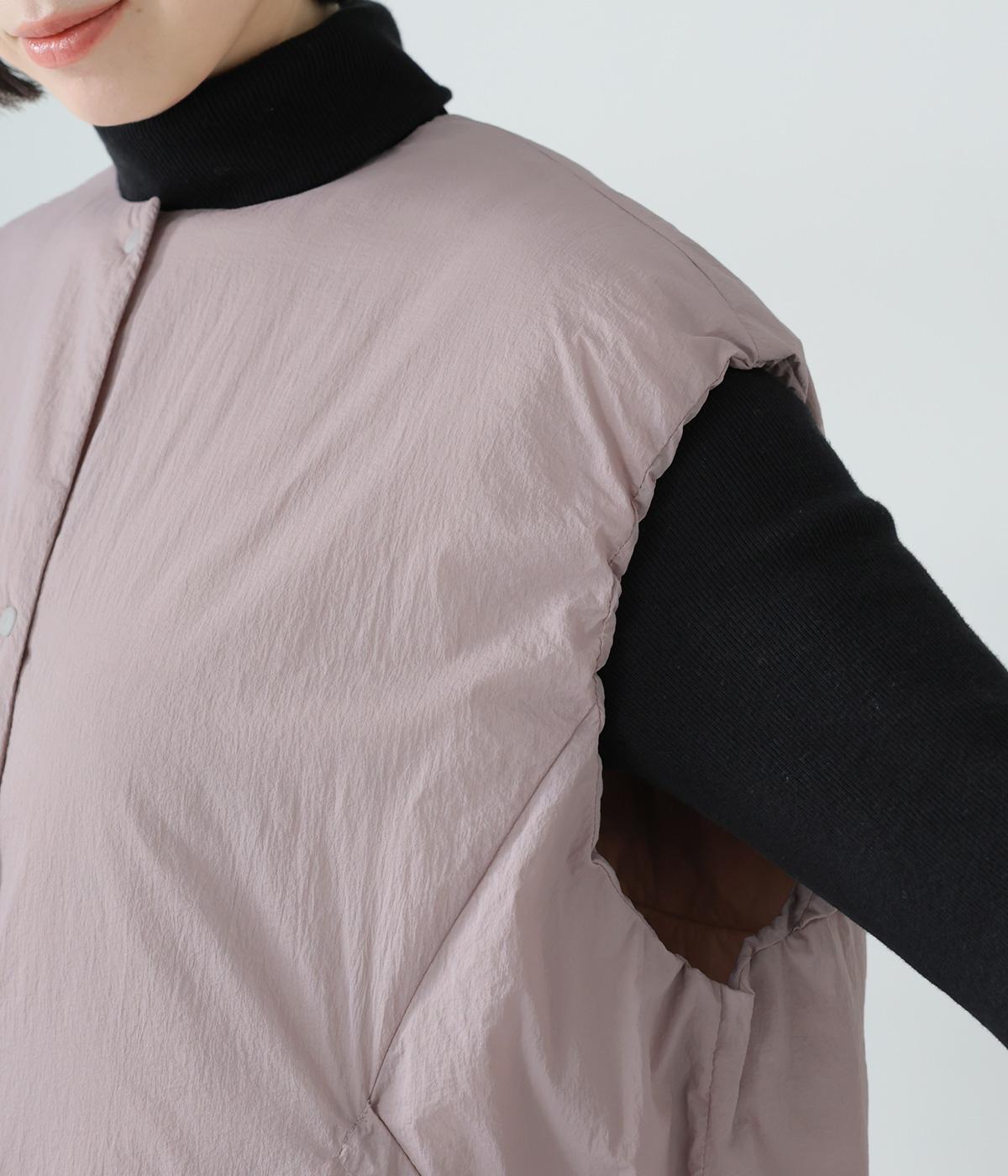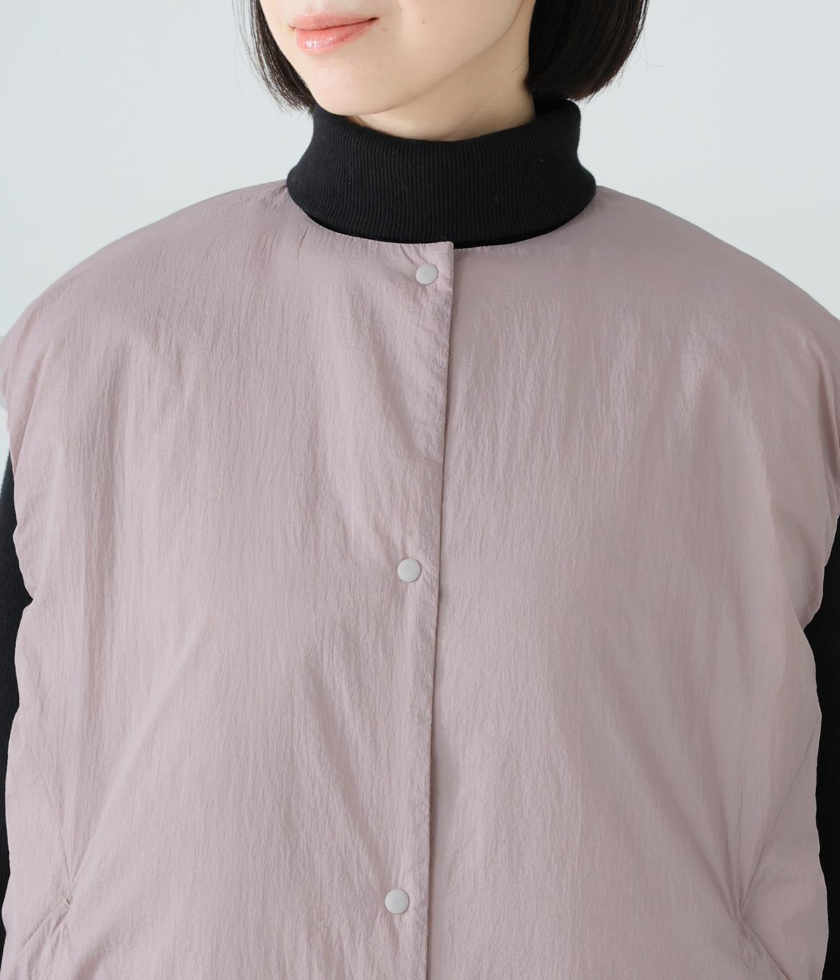 軽くてあたたかい中綿入りのベスト。シンプルなデザインとくすみカラーで、カジュアルすぎない大人らしい仕上がりに。裾とポケット口にはドローコード入りで、シルエットのアレンジも可能です。背ヨーク切り替えを加えた、後ろ姿もかわいいポイント。コートのインナーにもおすすめです。