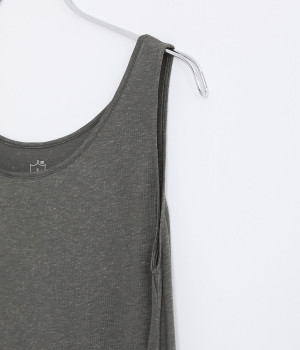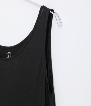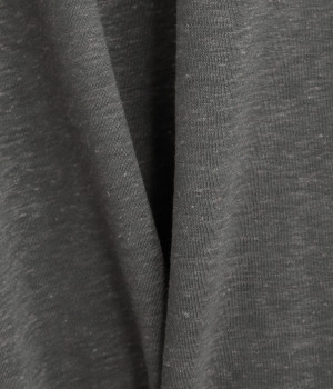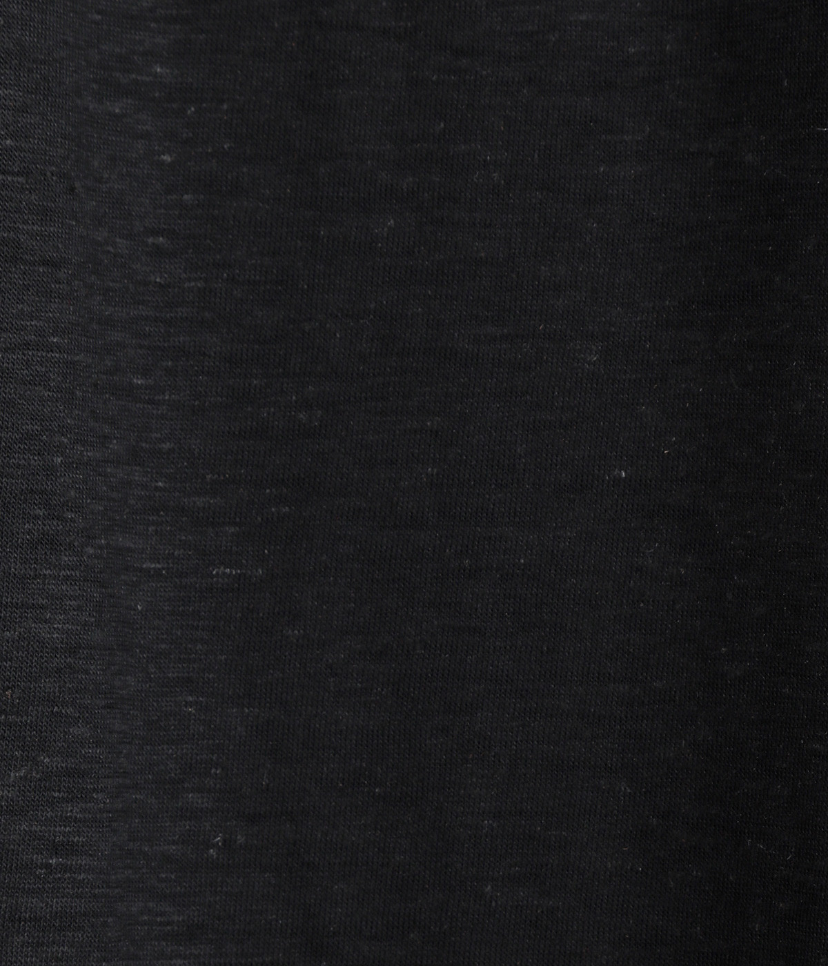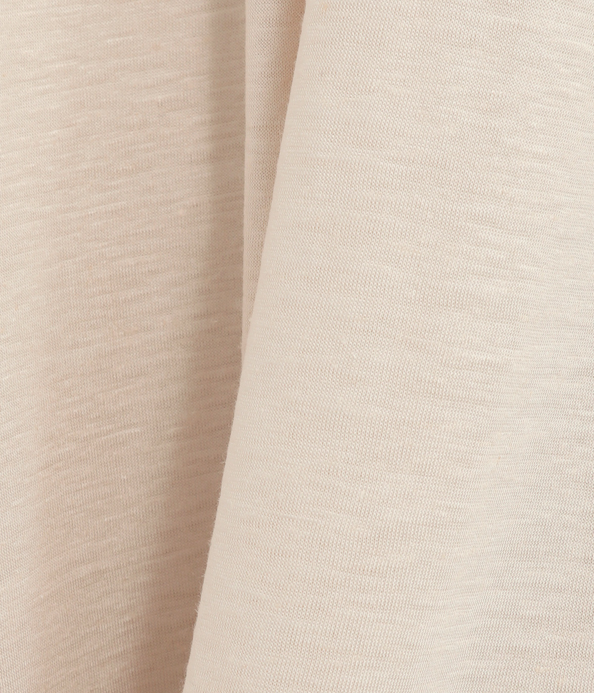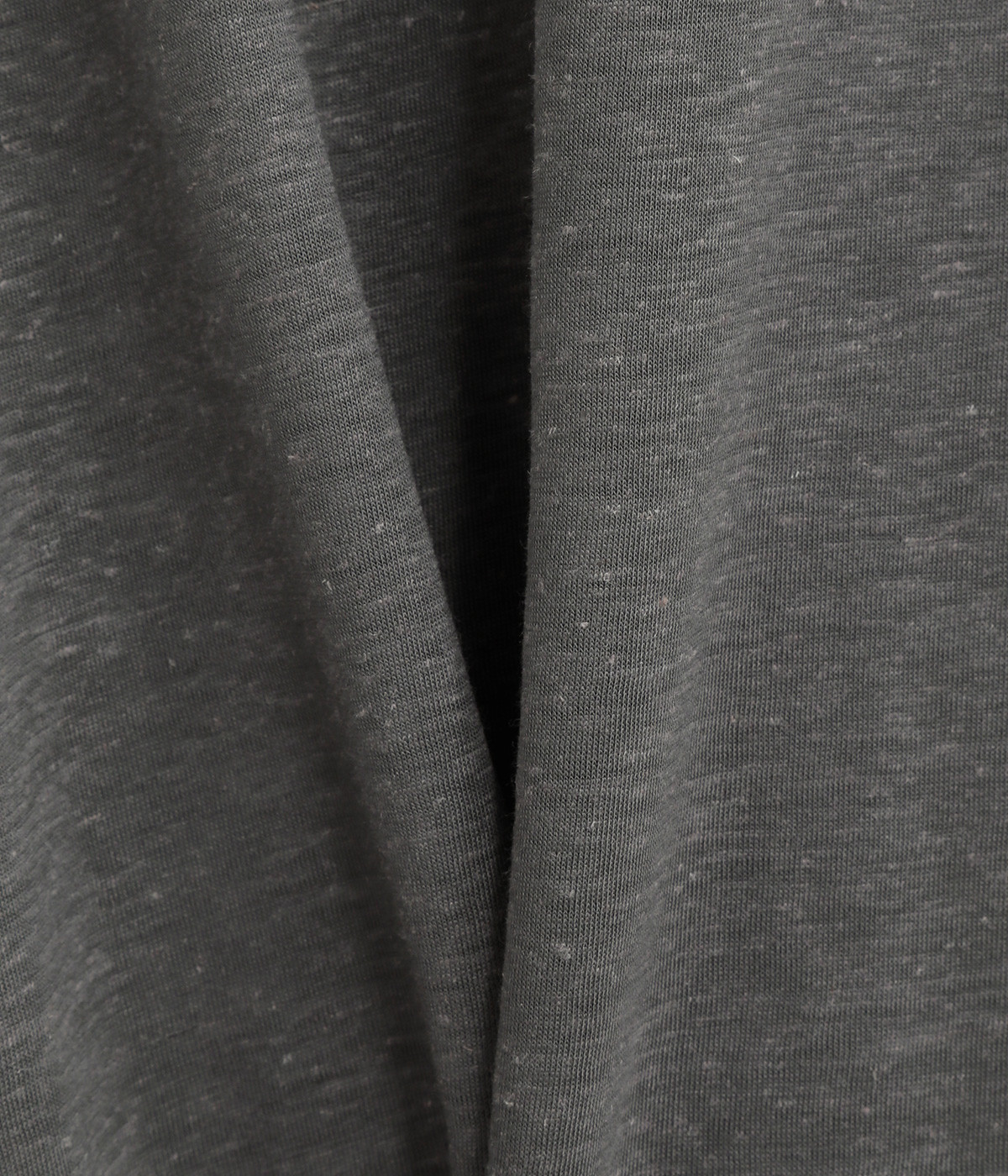 ペーパーライクな薄さのリネン混天竺素材は、表に響きにくいところが特徴的。レーヨンをベースに麻をブレンドし、独特の風合いに仕立てました。落ち着いた光沢があり、着心地も抜群です。