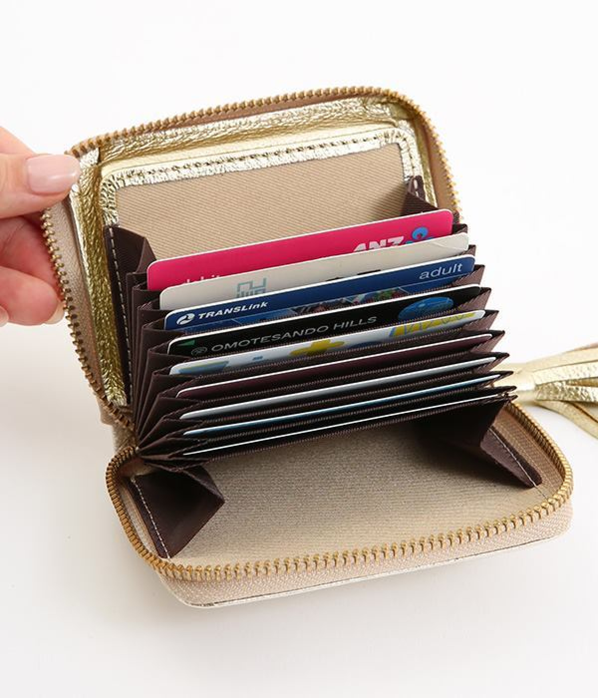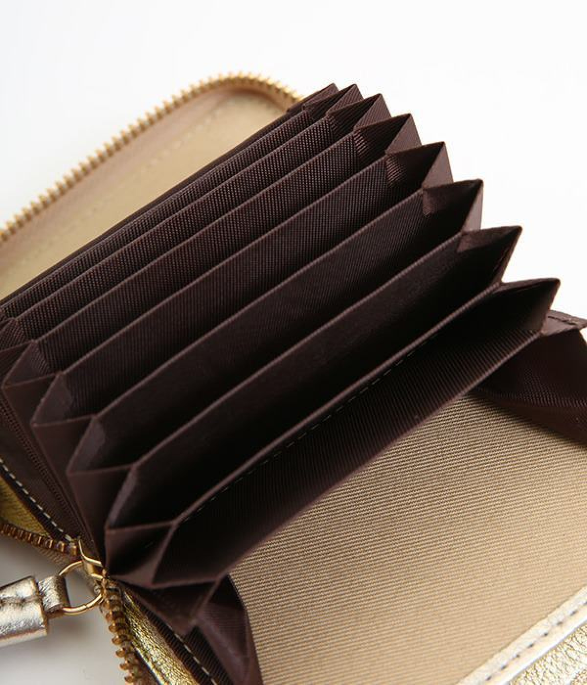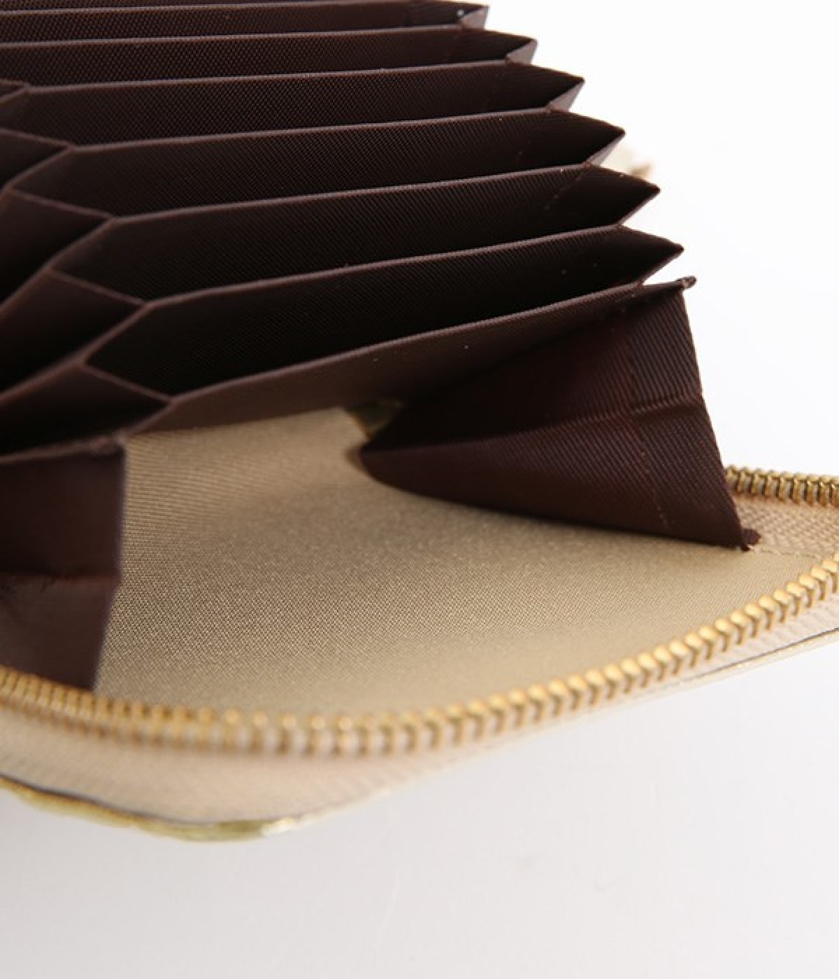 カード、お札、小銭をコンパクトに収納する、長財布とミニ財布の良いところを掛け合わせたウォレットです。小荷物派にうれしい、ミニショルダーやハンドバッグ、ポケットにも入るサイズ設計。ドット型押しを施した牛革を使用しており、大人にふさわしいポップ感を表現しました。出し入れしやすいジャバラ式のカードポケットが備わり、カード類をコンパクトに収納可能。ジャバラポケット下はお札を折らずに収納できるよう、スリップ式になっているのもポイント。本体にスキミング防止シートが内蔵されており、安全面にも気配りを。箱入れでお届けするのでプレゼントにもおすすめです。