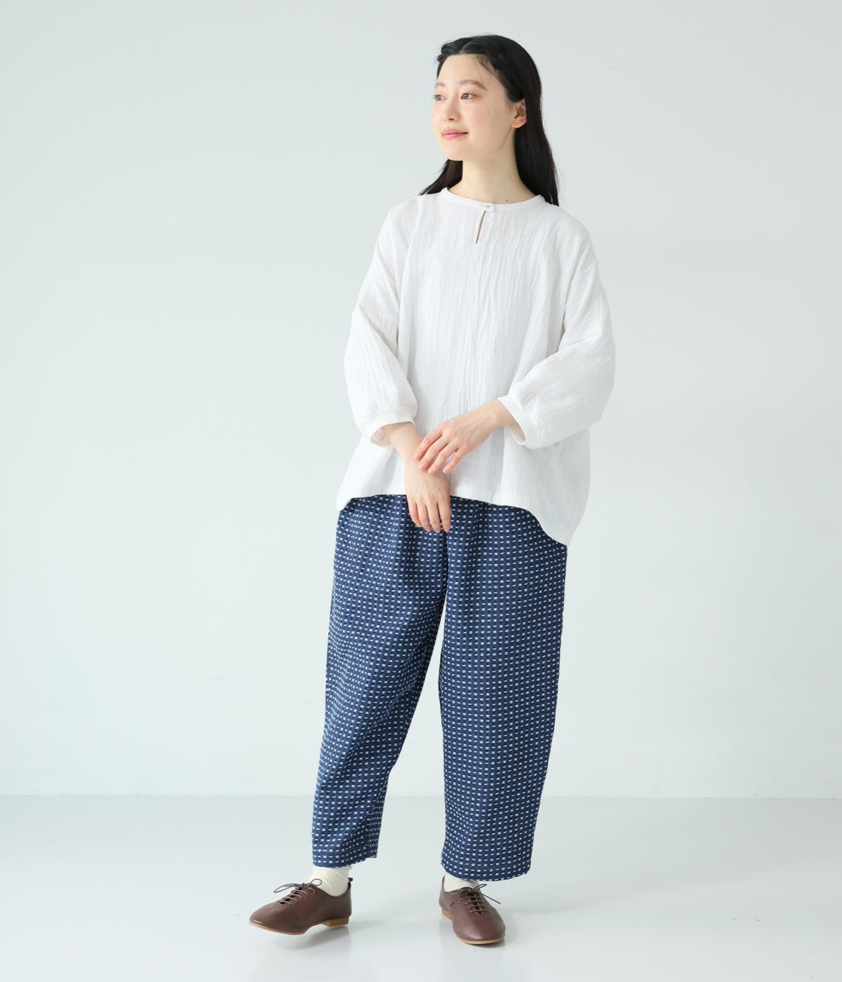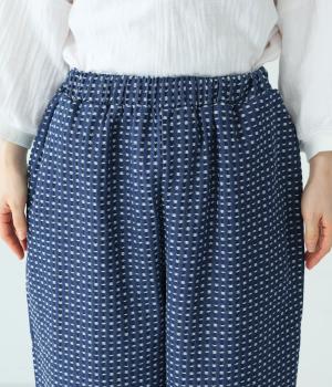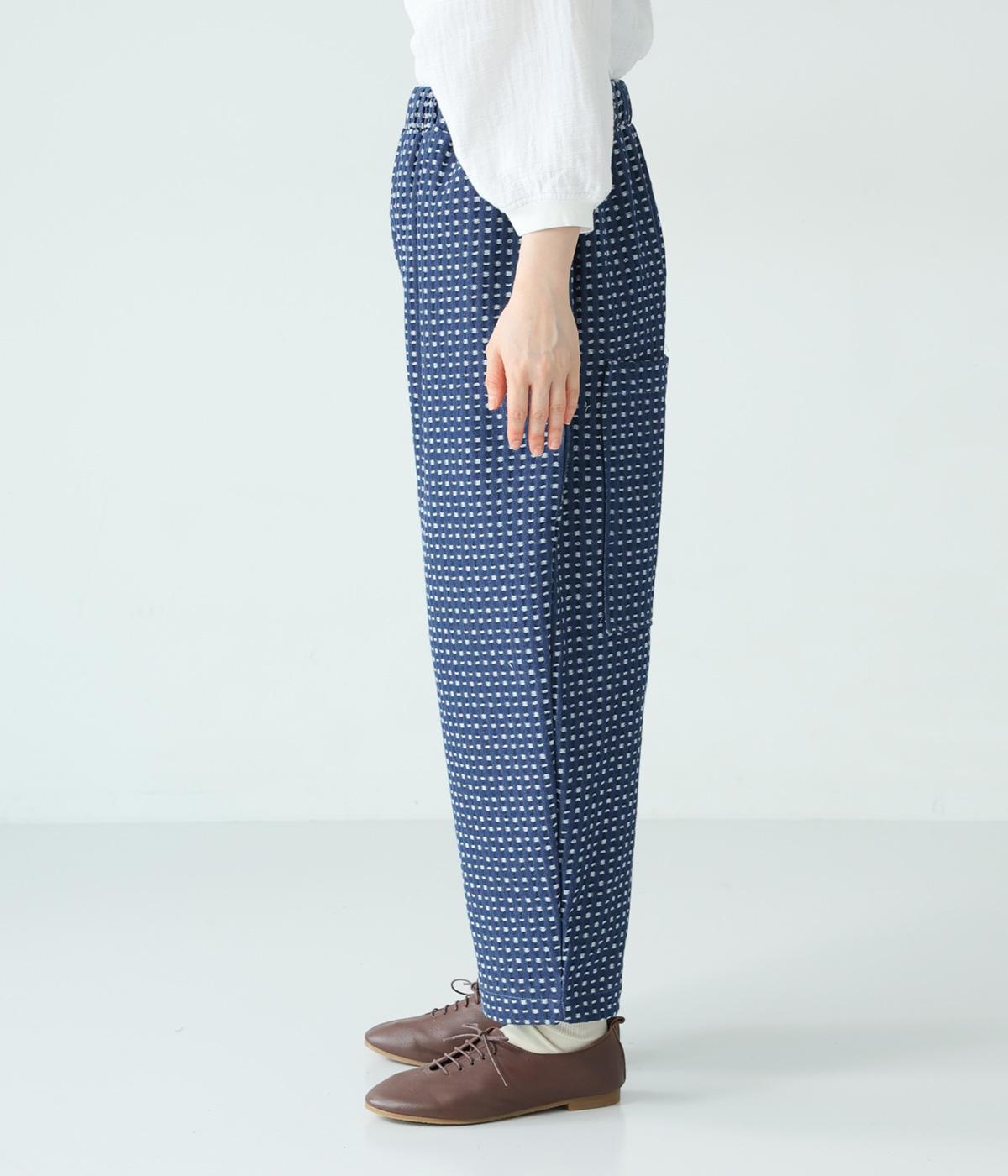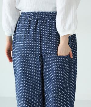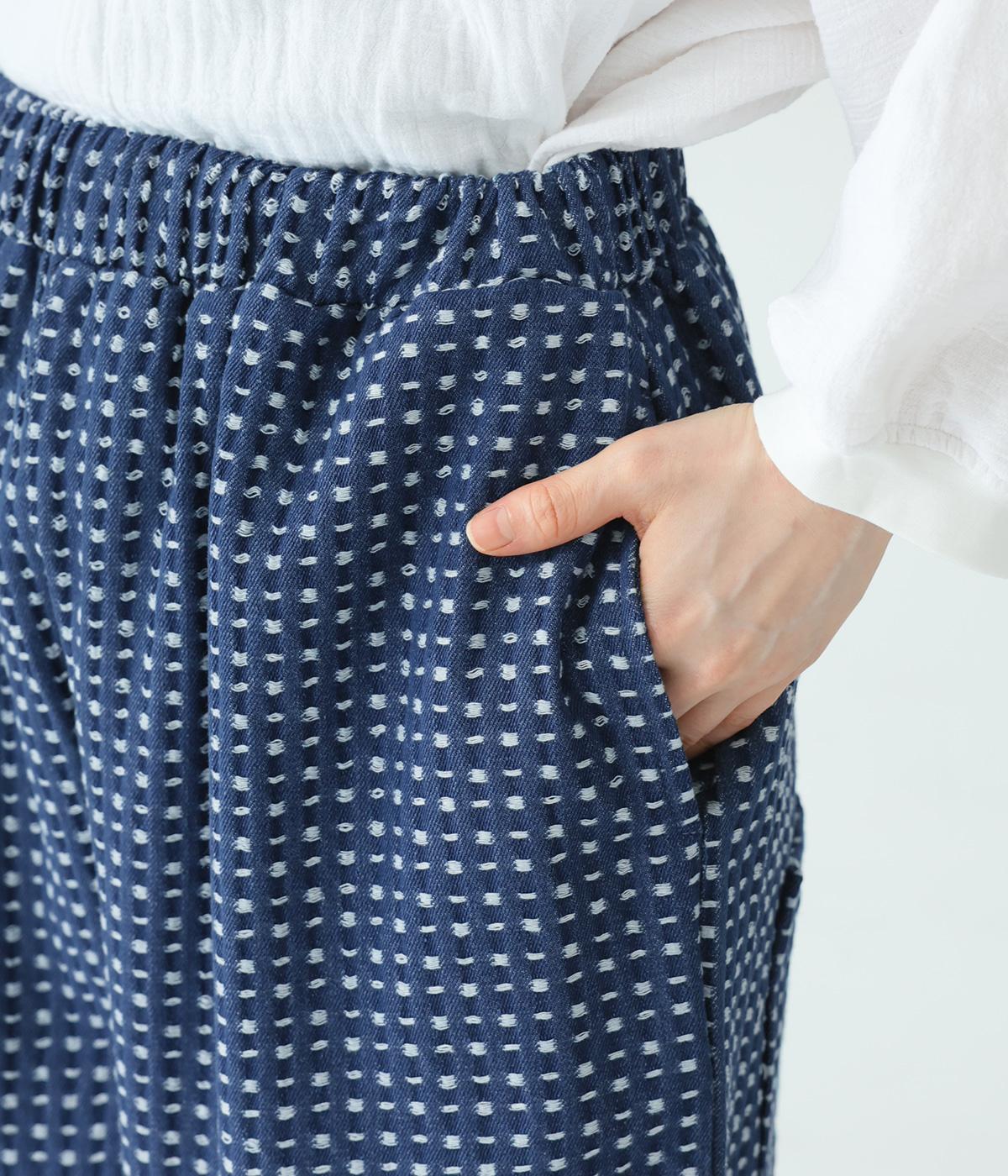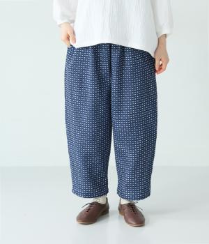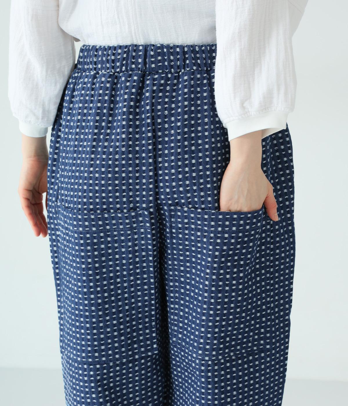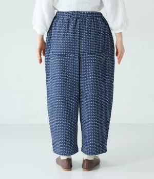 曲線を描くゆとりのあるシルエットが特徴のデニムパンツ。全体にほどこされた細かなステッチが、無地デニムにはない奥行きとあたたかみを感じさせます。ヒップのやや下の位置に配した大きなポケットがアクセントに。ウエストは総ゴム仕様で内紐つきです。