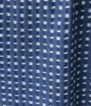 ほどよい厚みがありながらもごわつきの少ないデニム生地です。ステッチの凹凸が加わることで、のっぺりせず存在感のある仕上がりに。刺し子調のディテールがどこか和のニュアンスを感じさせます。