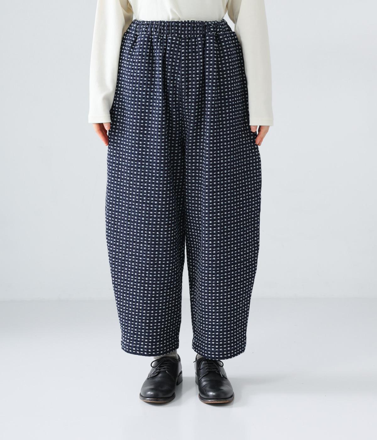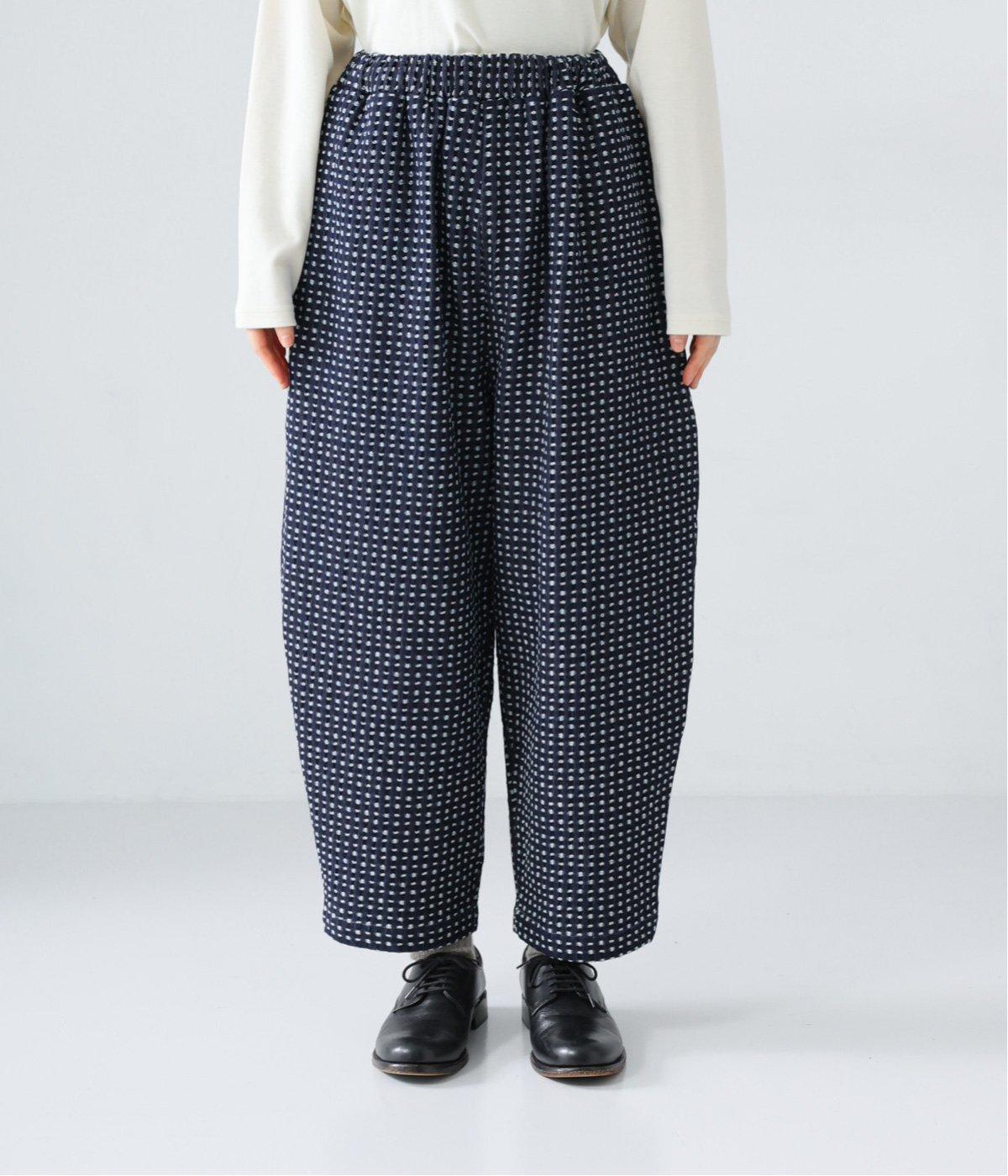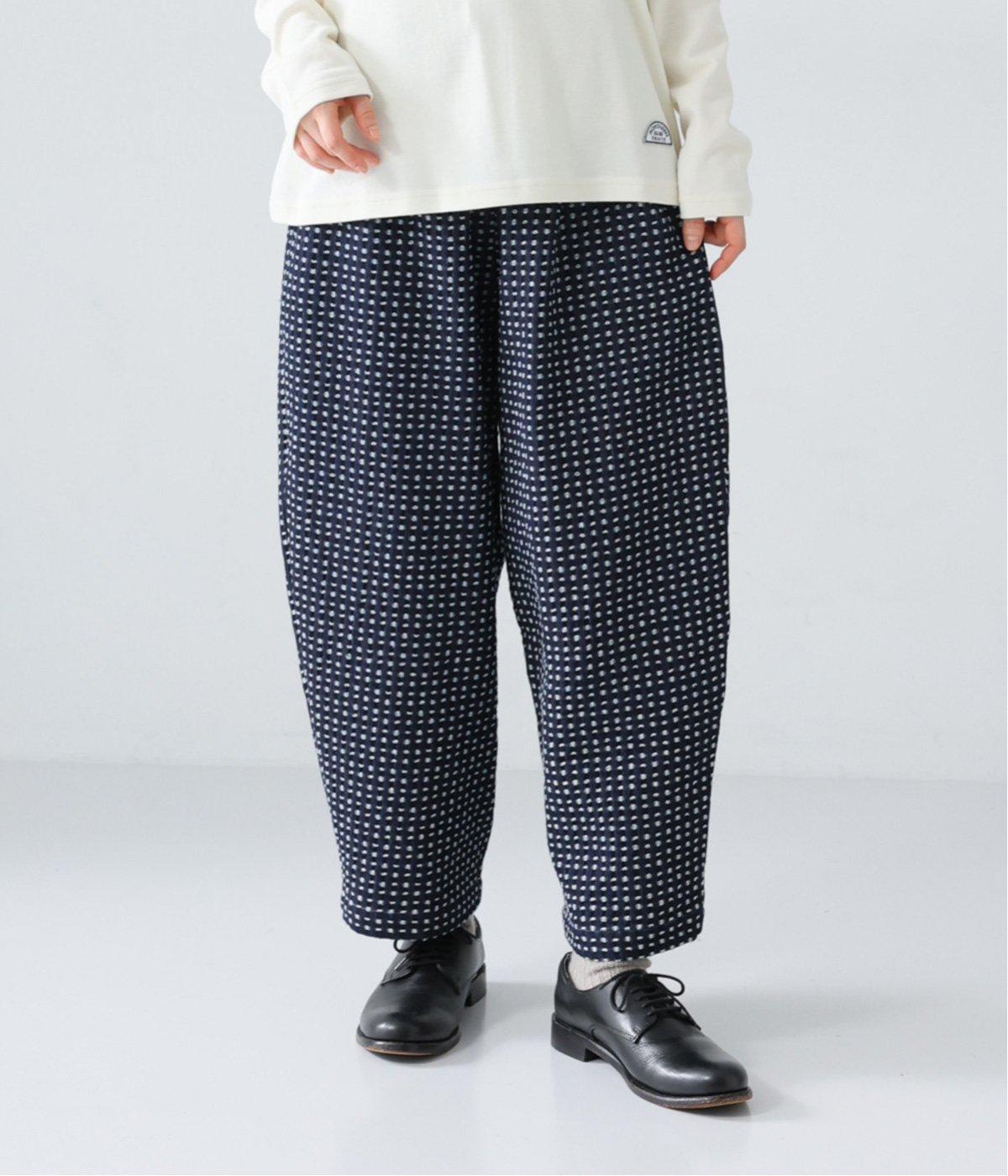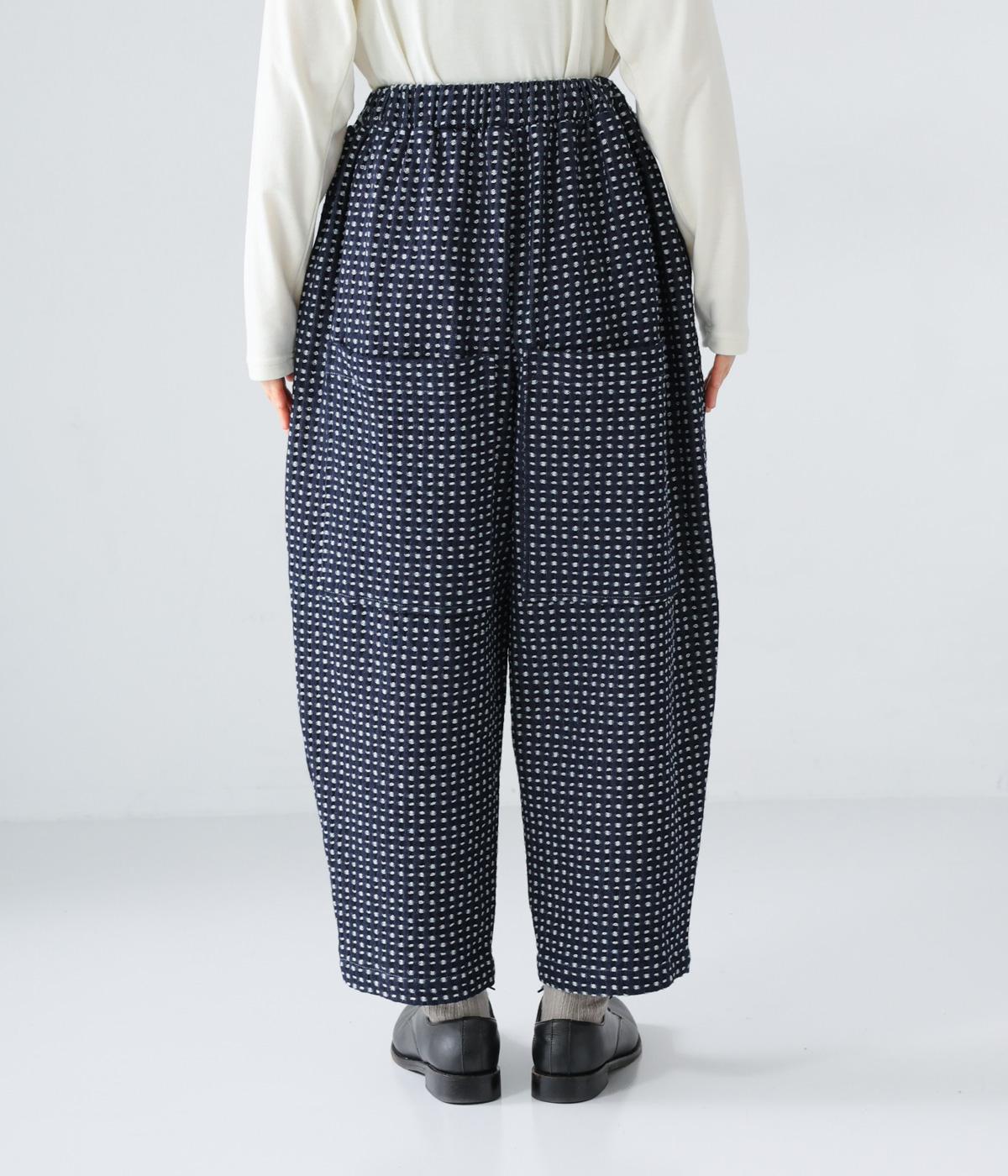 曲線を描くゆとりのあるシルエットが特徴のデニムパンツ。全体にほどこされた細かなステッチが、無地デニムにはない奥行きとあたたかみを感じさせます。ヒップのやや下の位置に配した大きなポケットがアクセントに。ウエストは総ゴム仕様で内紐つきです。