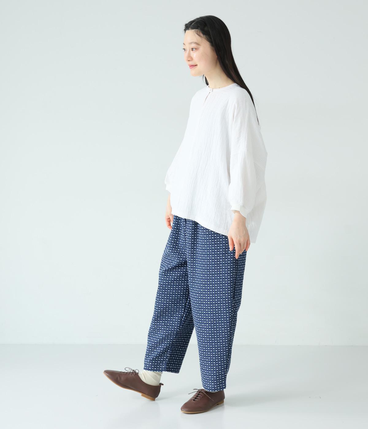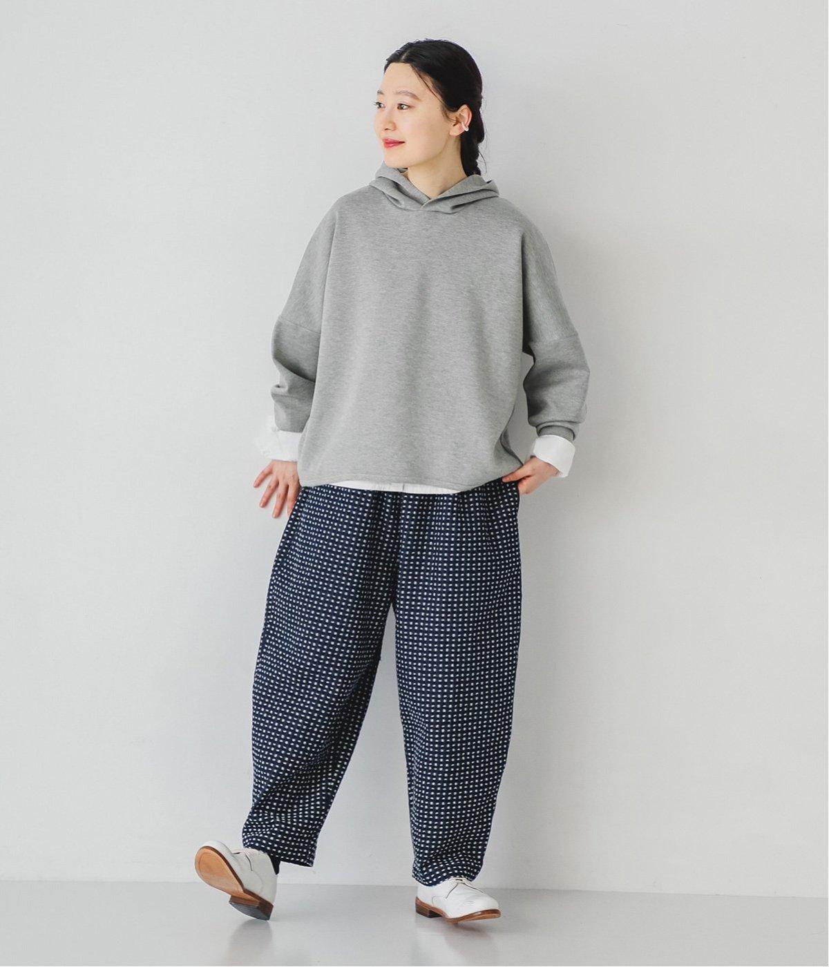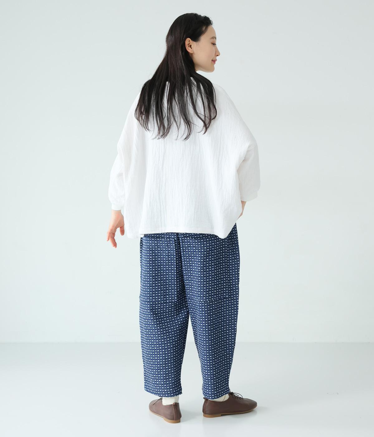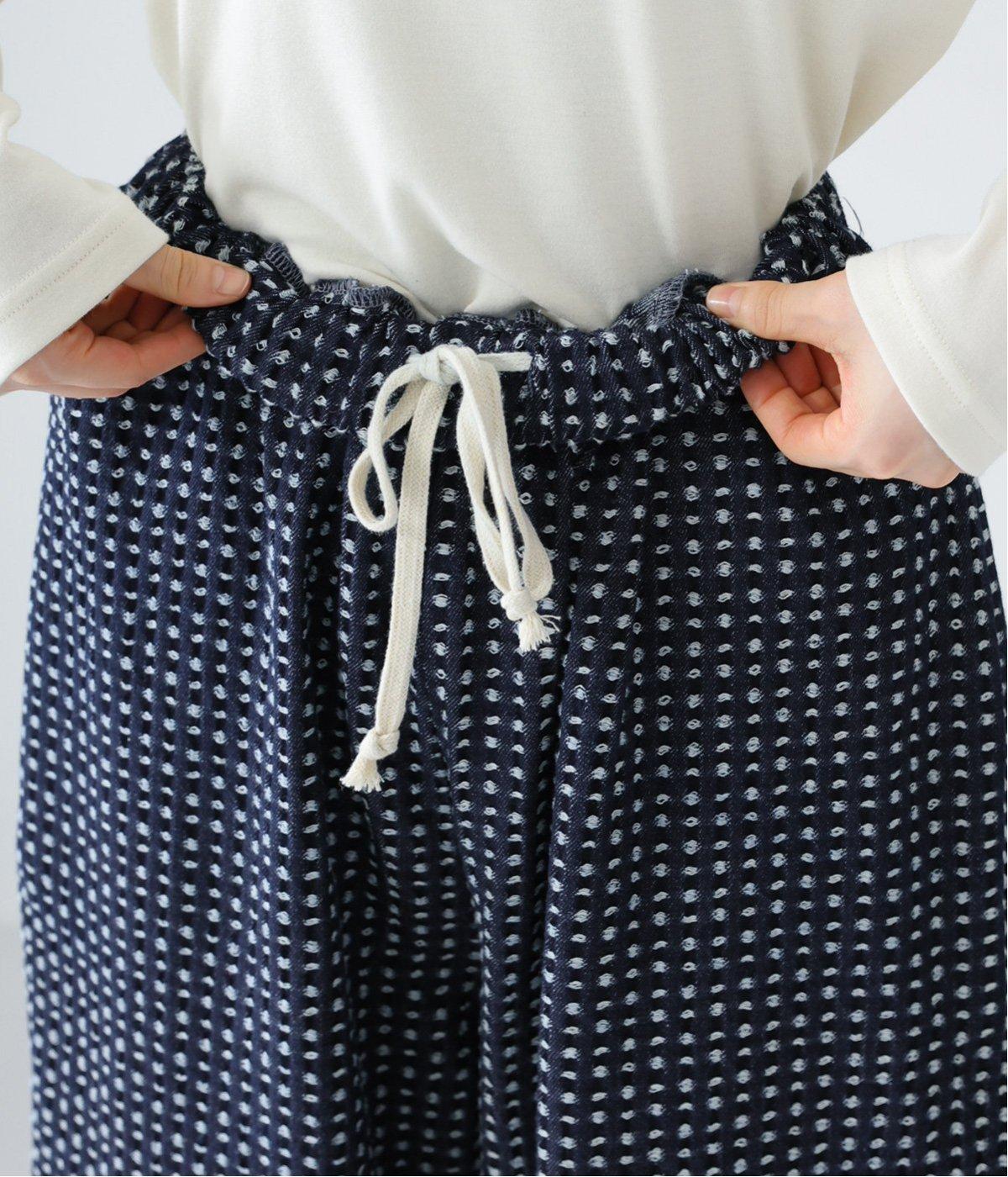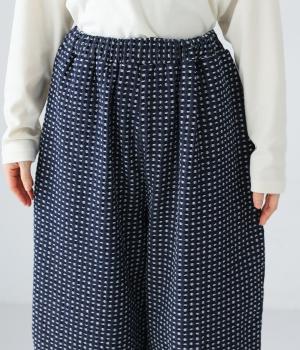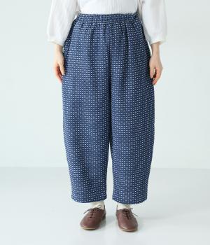 曲線を描くゆとりのあるシルエットが特徴のデニムパンツ。全体にほどこされた細かなステッチが、無地デニムにはない奥行きとあたたかみを感じさせます。ヒップのやや下の位置に配した大きなポケットがアクセントに。ウエストは総ゴム仕様で内紐つきです。