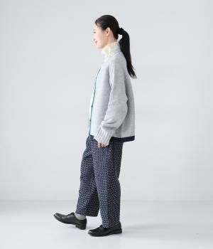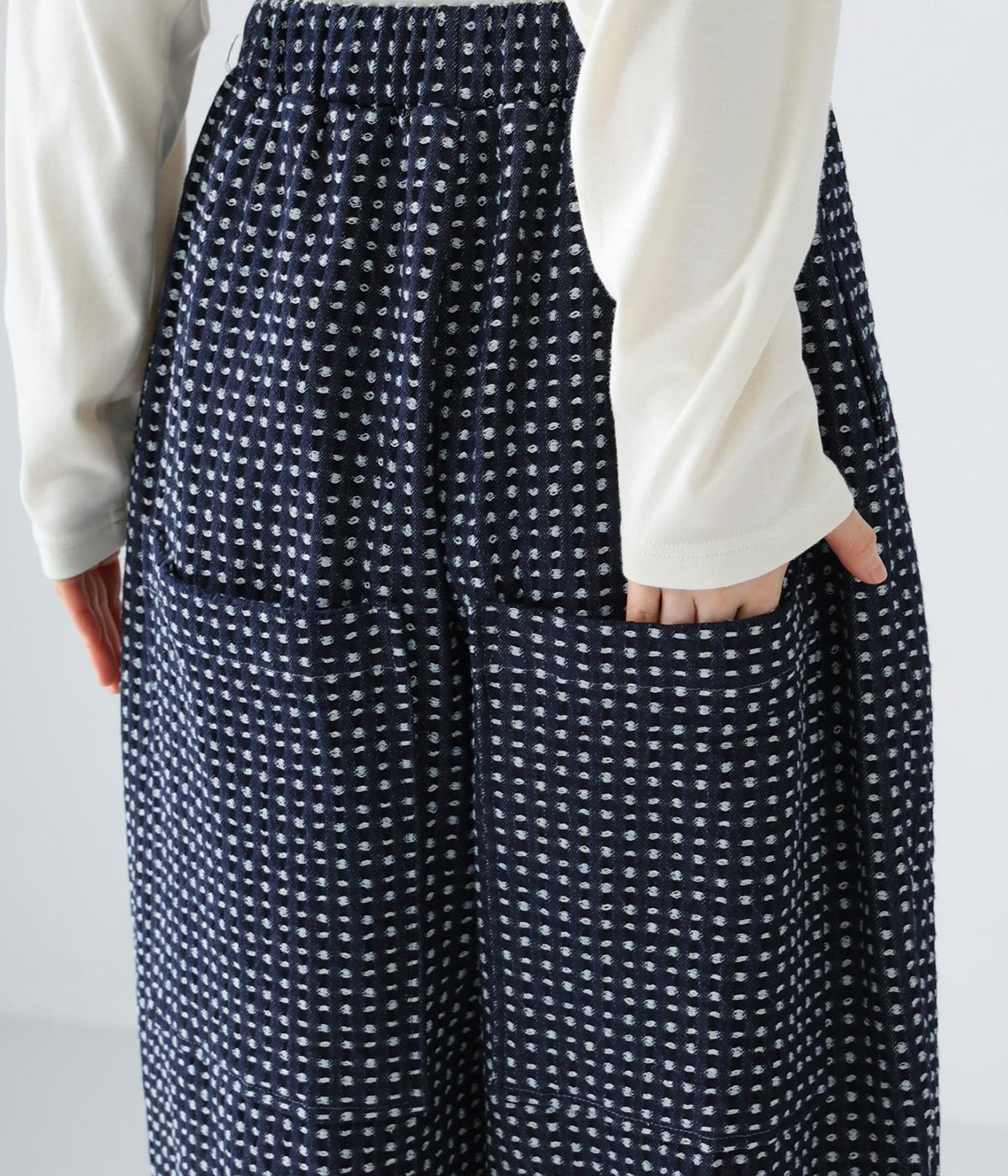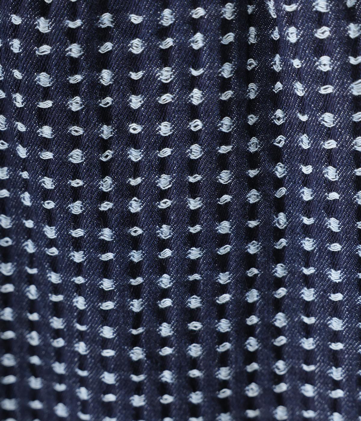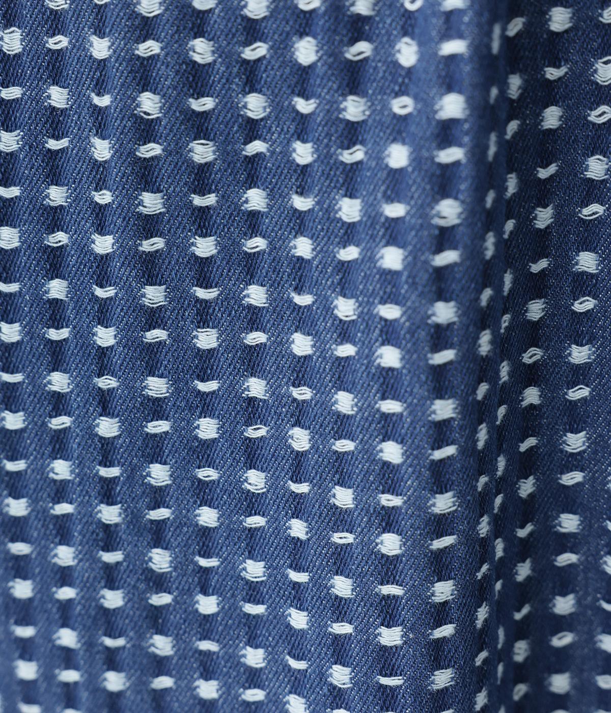 ほどよい厚みがありながらもごわつきの少ないデニム生地です。ステッチの凹凸が加わることで、のっぺりせず存在感のある仕上がりに。刺し子調のディテールがどこか和のニュアンスを感じさせます。