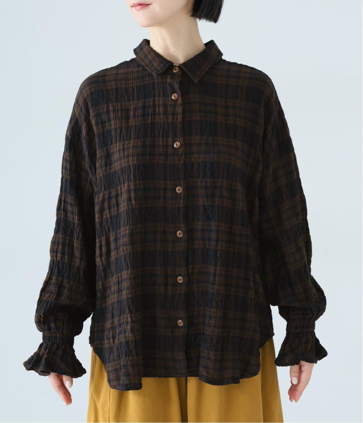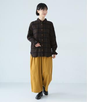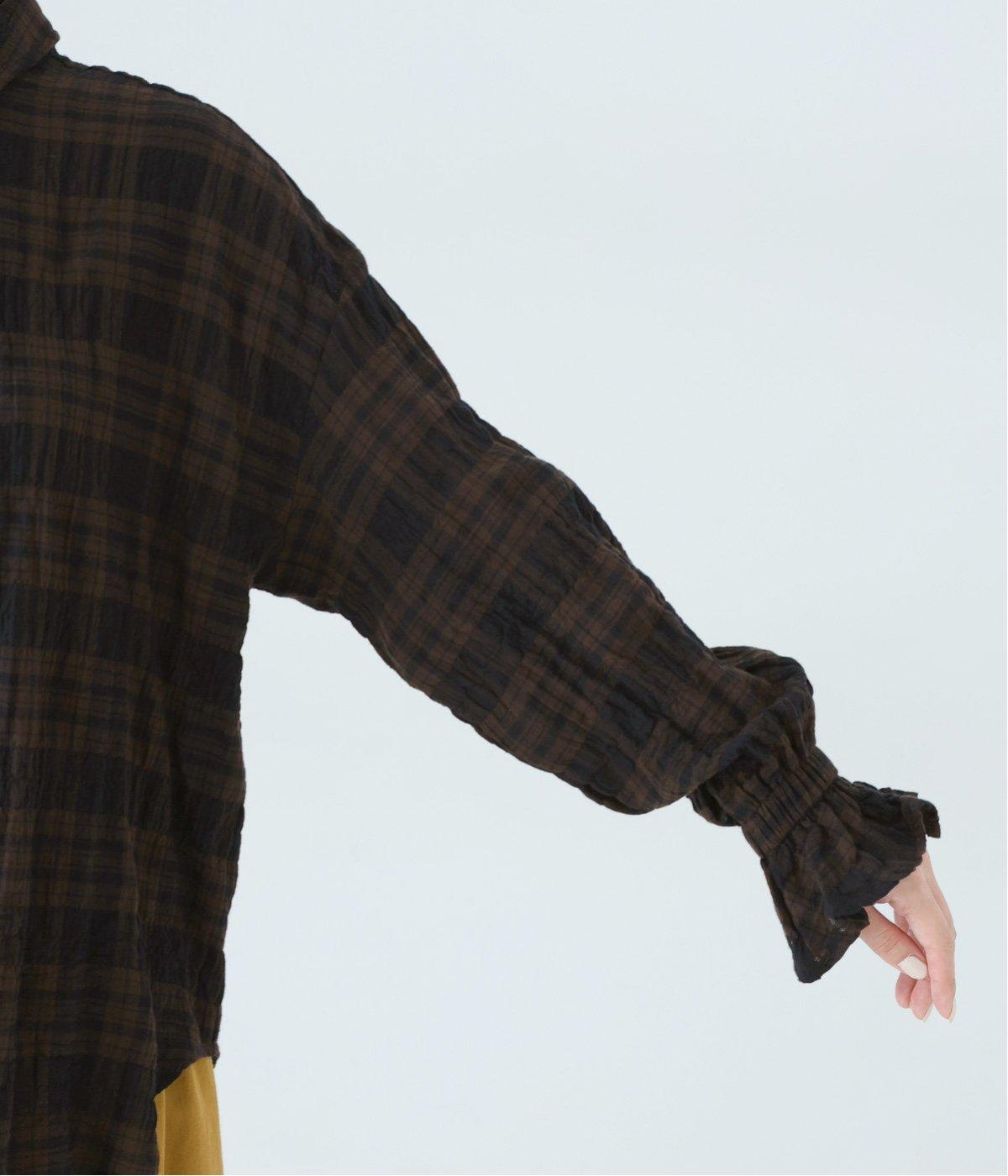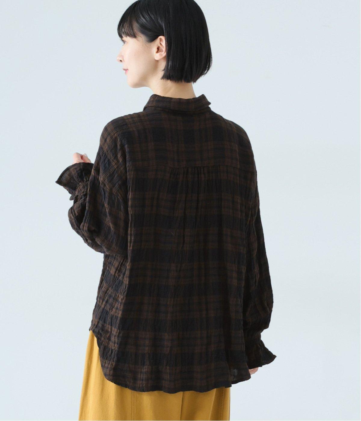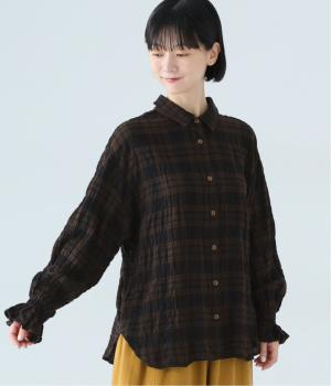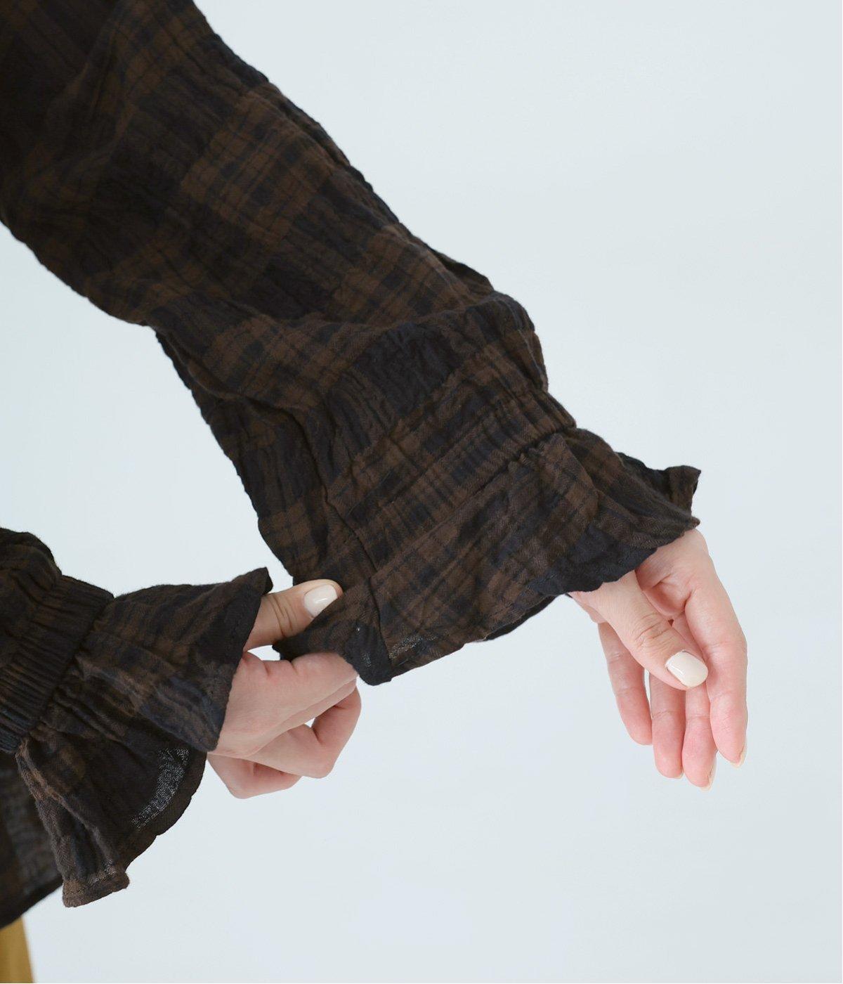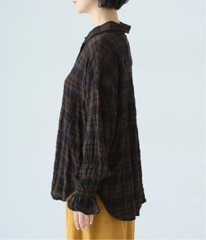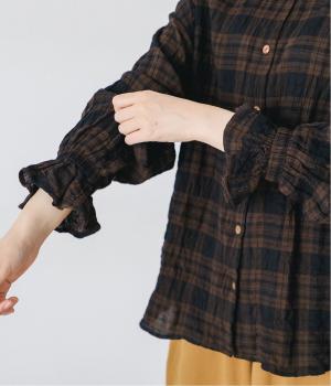 自然なシワ感のあるチェック生地を主役にした、装いに奥行きをプラスするブラウス。袖口にはゴムを通して愛らしいフリルを表現しています。動きのある表情を添えるラウンドヘムで、さまざまなボトムスとなじみやすくしました。