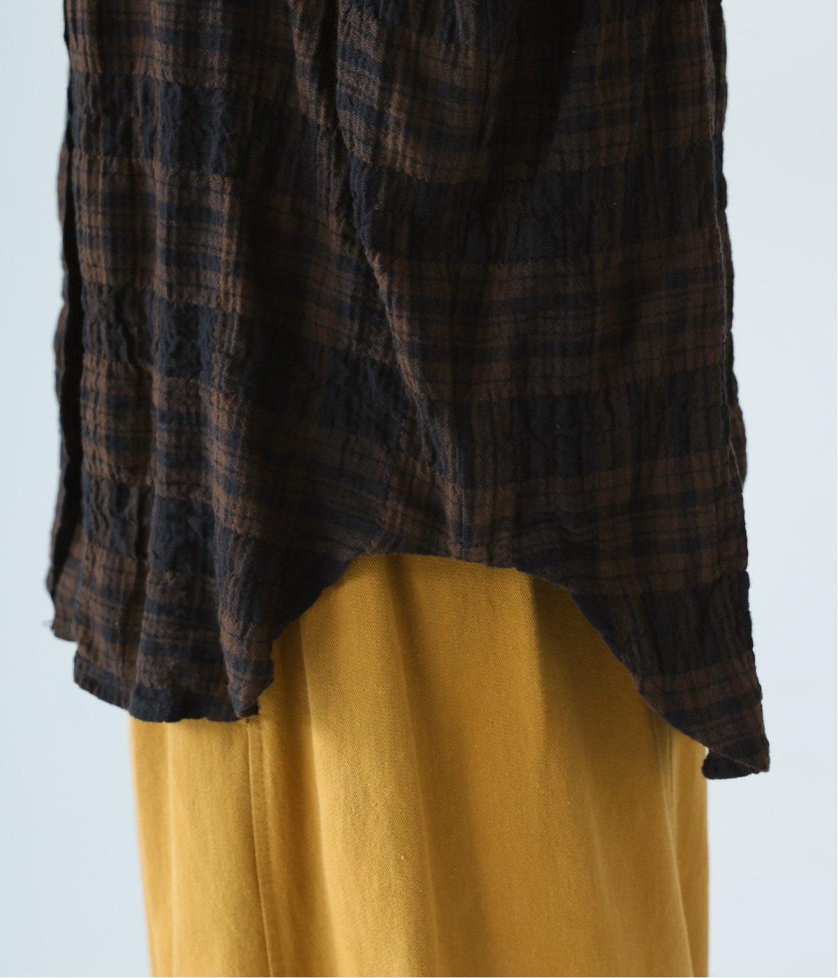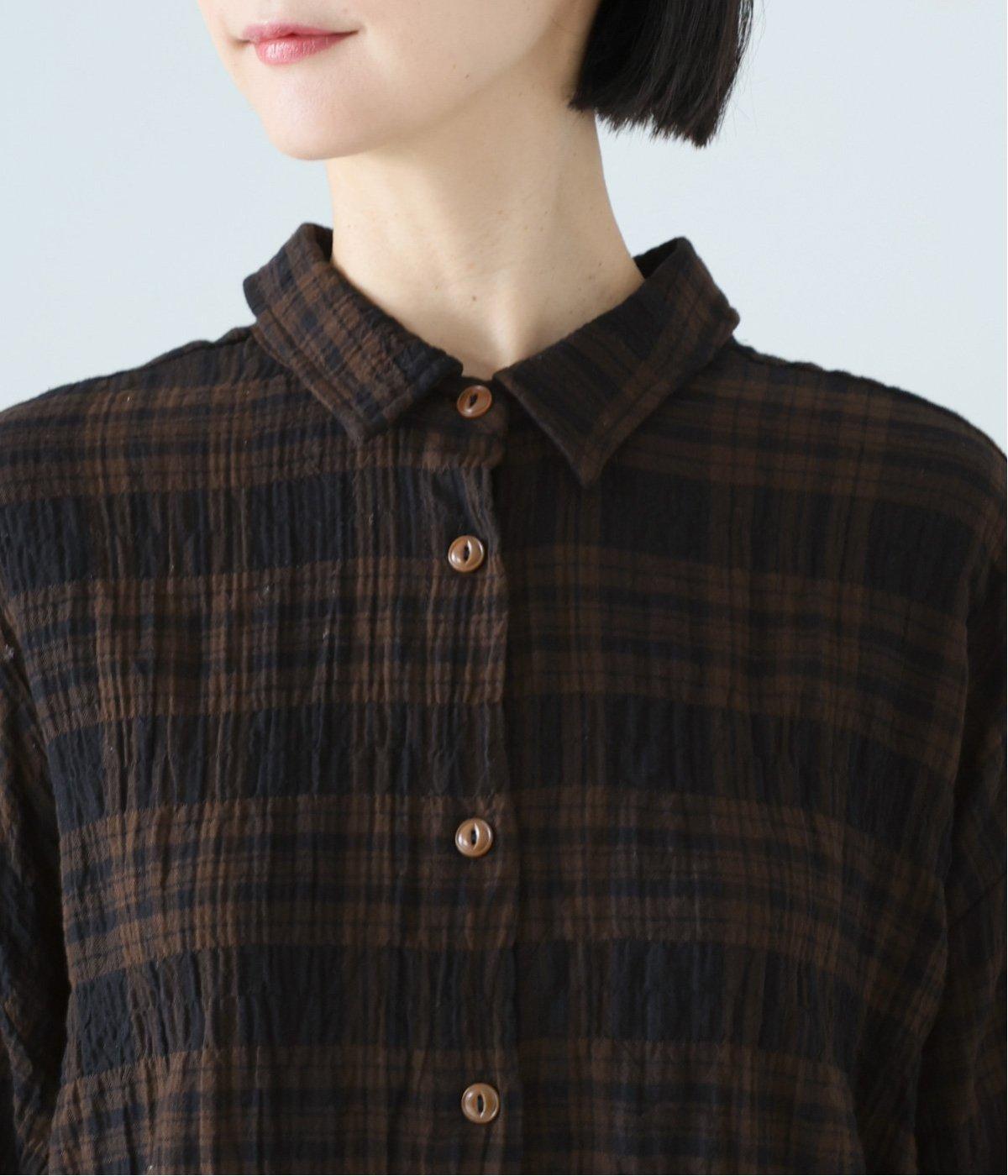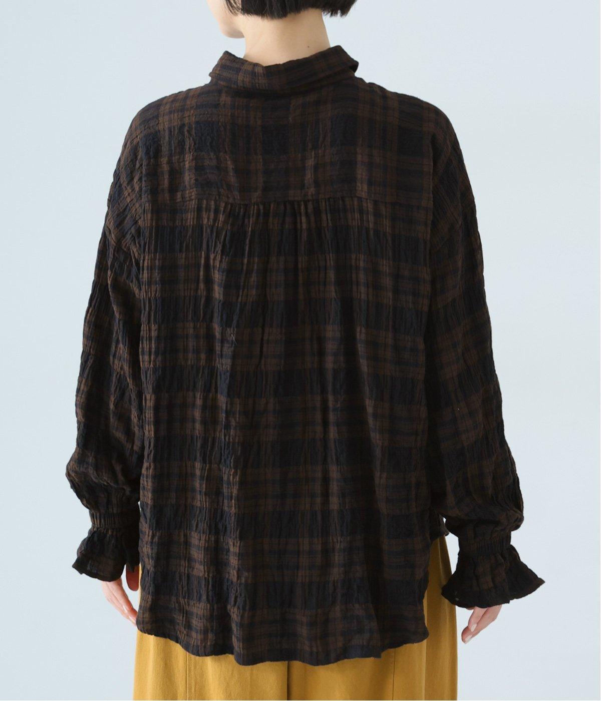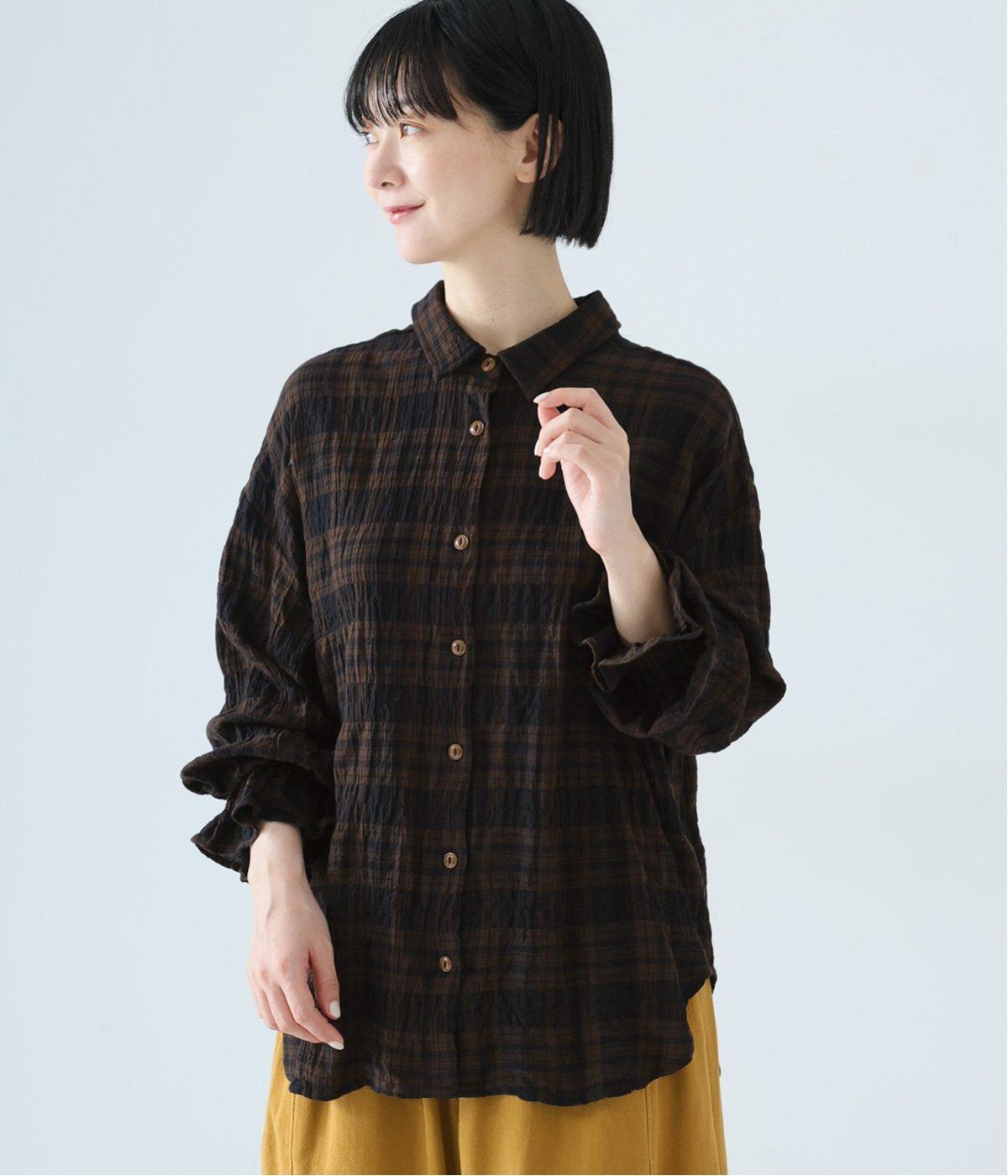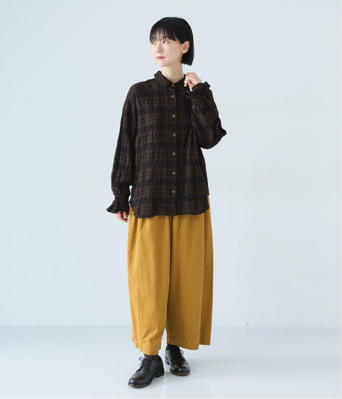 自然なシワ感のあるチェック生地を主役にした、装いに奥行きをプラスするブラウス。袖口にはゴムを通して愛らしいフリルを表現しています。動きのある表情を添えるラウンドヘムで、さまざまなボトムスとなじみやすくしました。