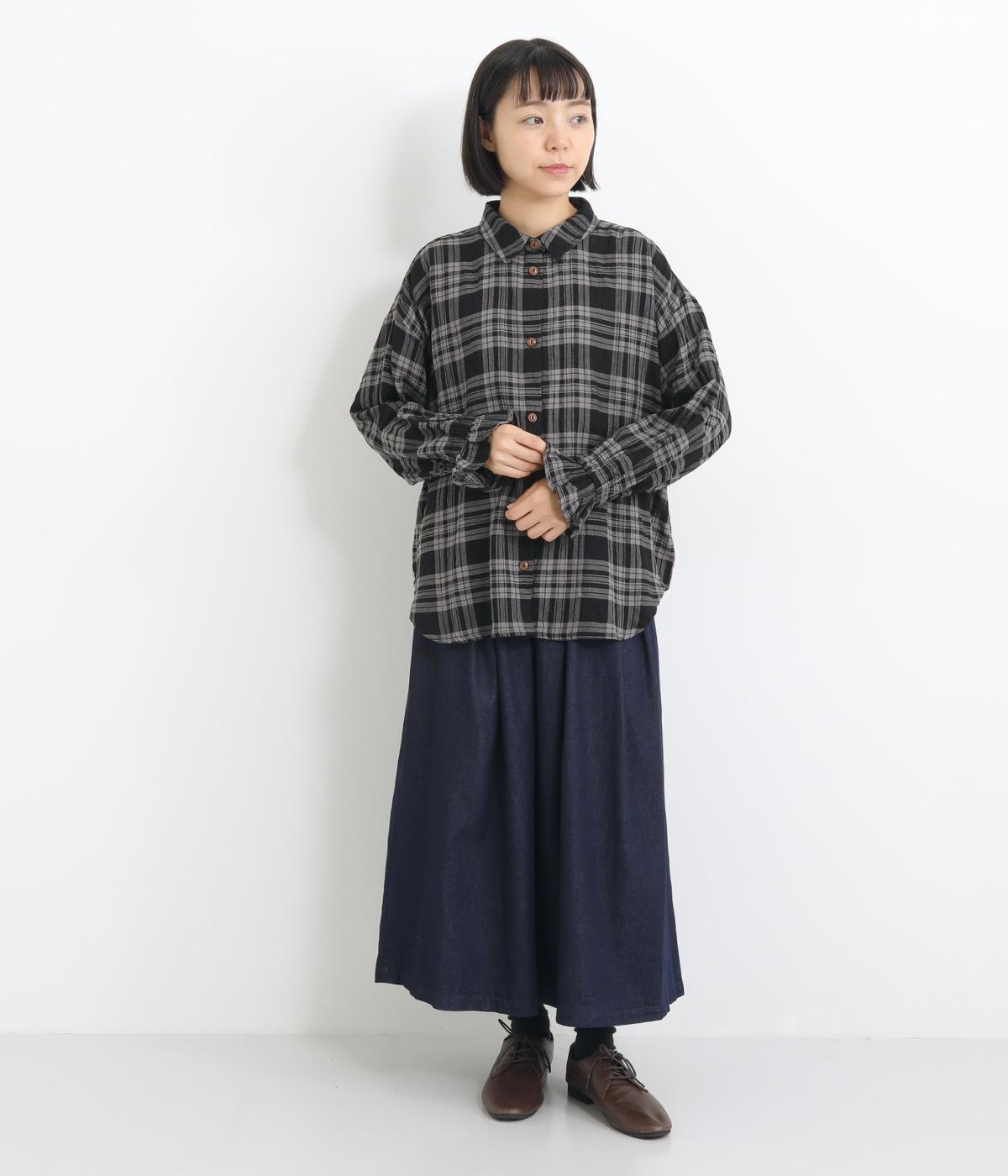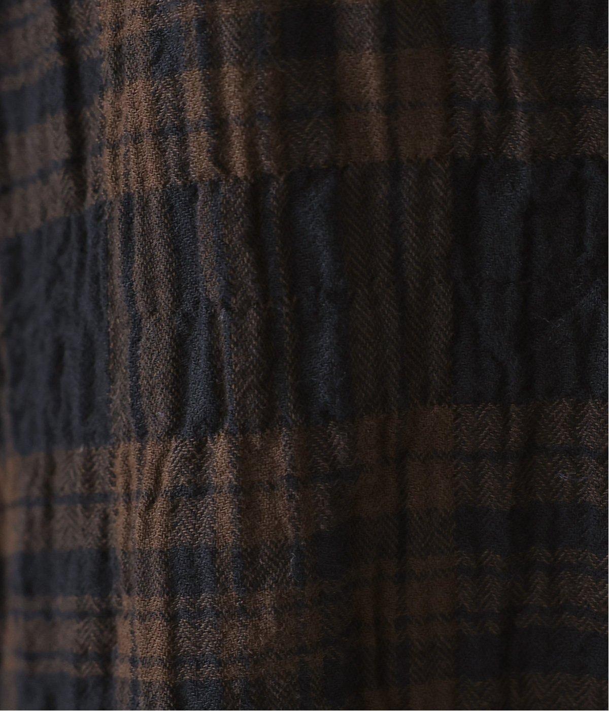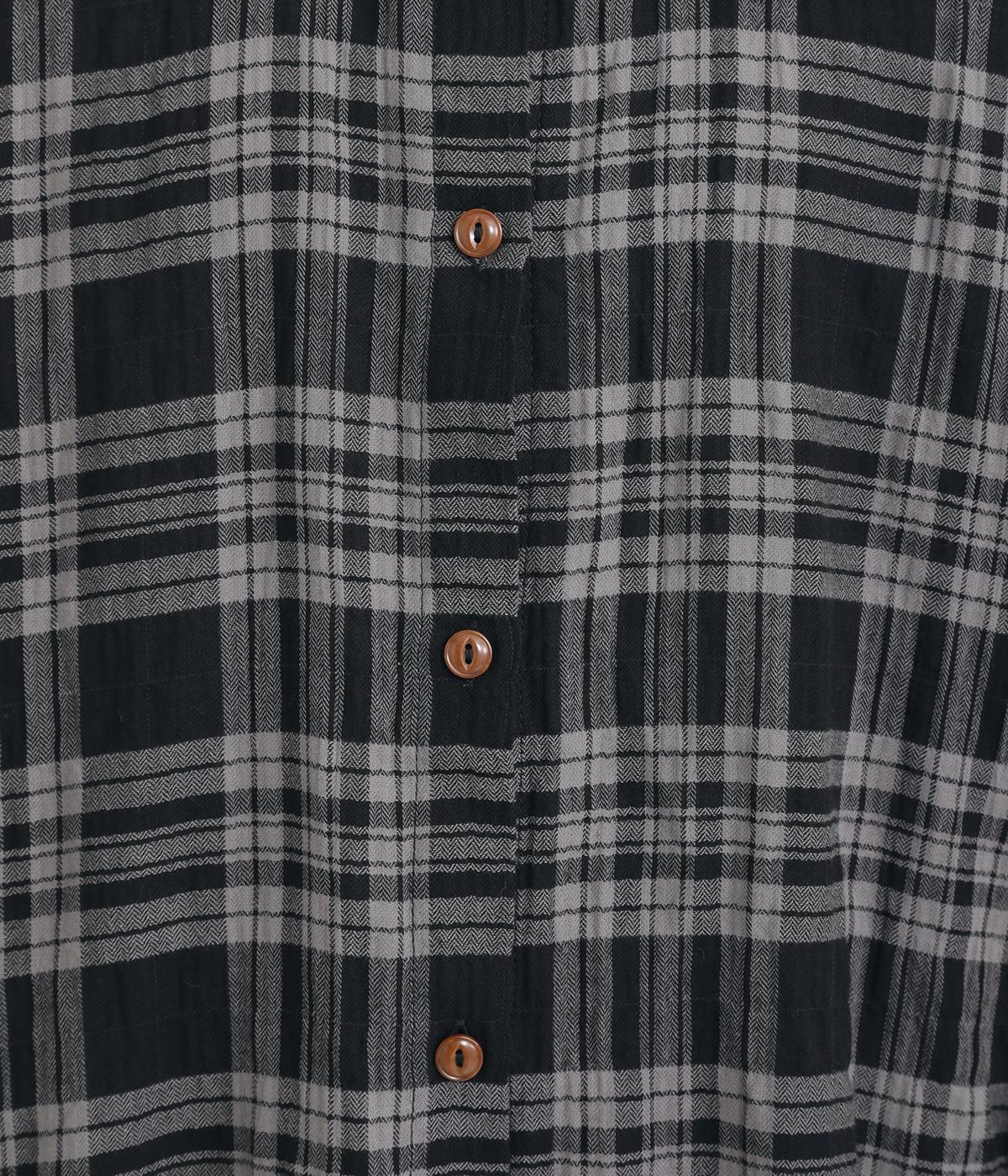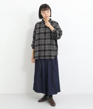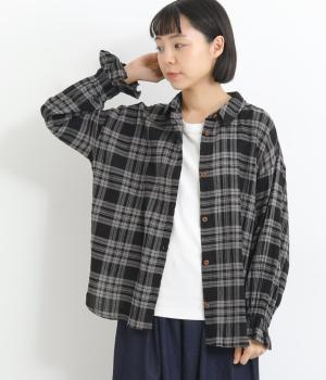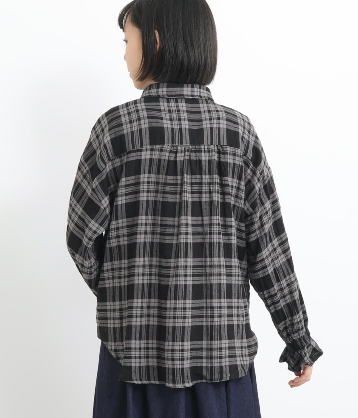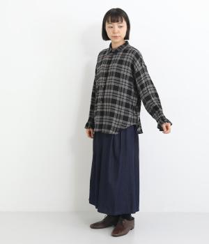 自然なシワ感のあるチェック生地を主役にした、装いに奥行きをプラスするブラウス。袖口にはゴムを通して愛らしいフリルを表現しています。動きのある表情を添えるラウンドヘムで、さまざまなボトムスとなじみやすくしました。