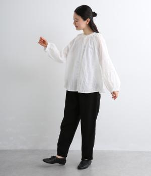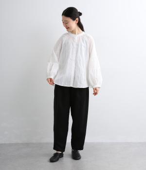 ふんわりと肌になじみ、やさしい着心地のコットン生地を使用しています。軽やかで透け感のあるレースがさりげない華やかさを添えます。春にぴったりの爽やかな素材感です。