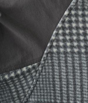 つい表面を撫でたくなるようなふっくらとしたやわらかな起毛感が魅力のポリエステルレーヨン生地をメインに使用。ほどよいハリ感のあるさらりとしたコットン混の布帛生地をドッキングしました。