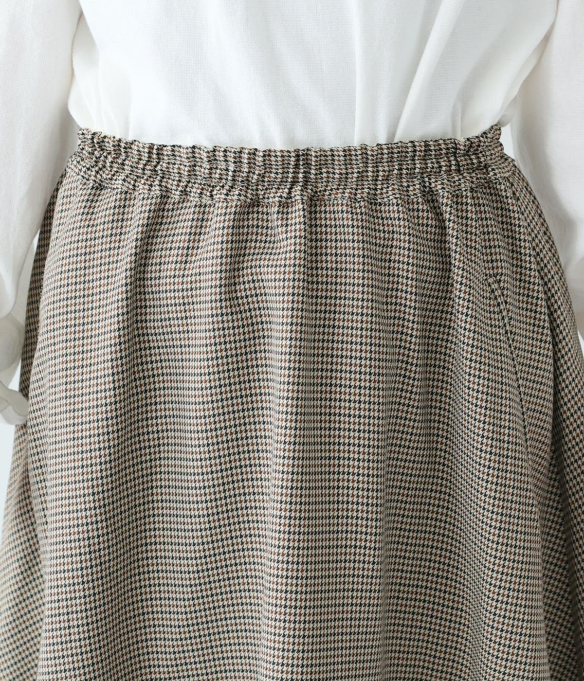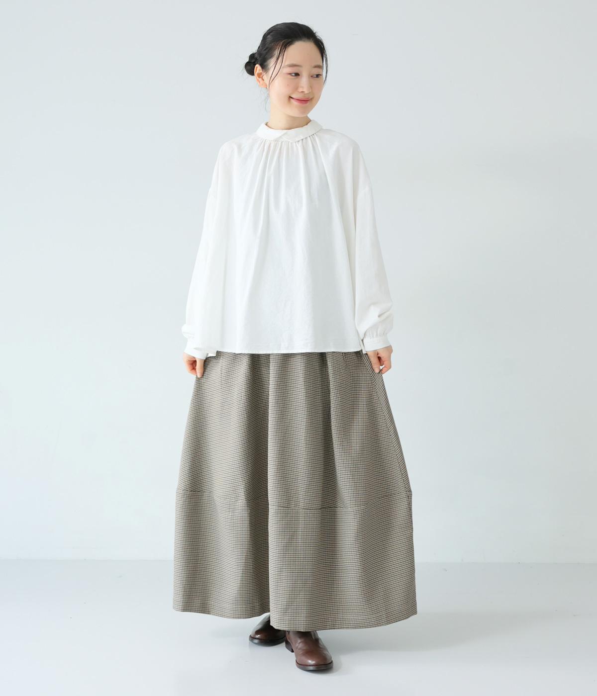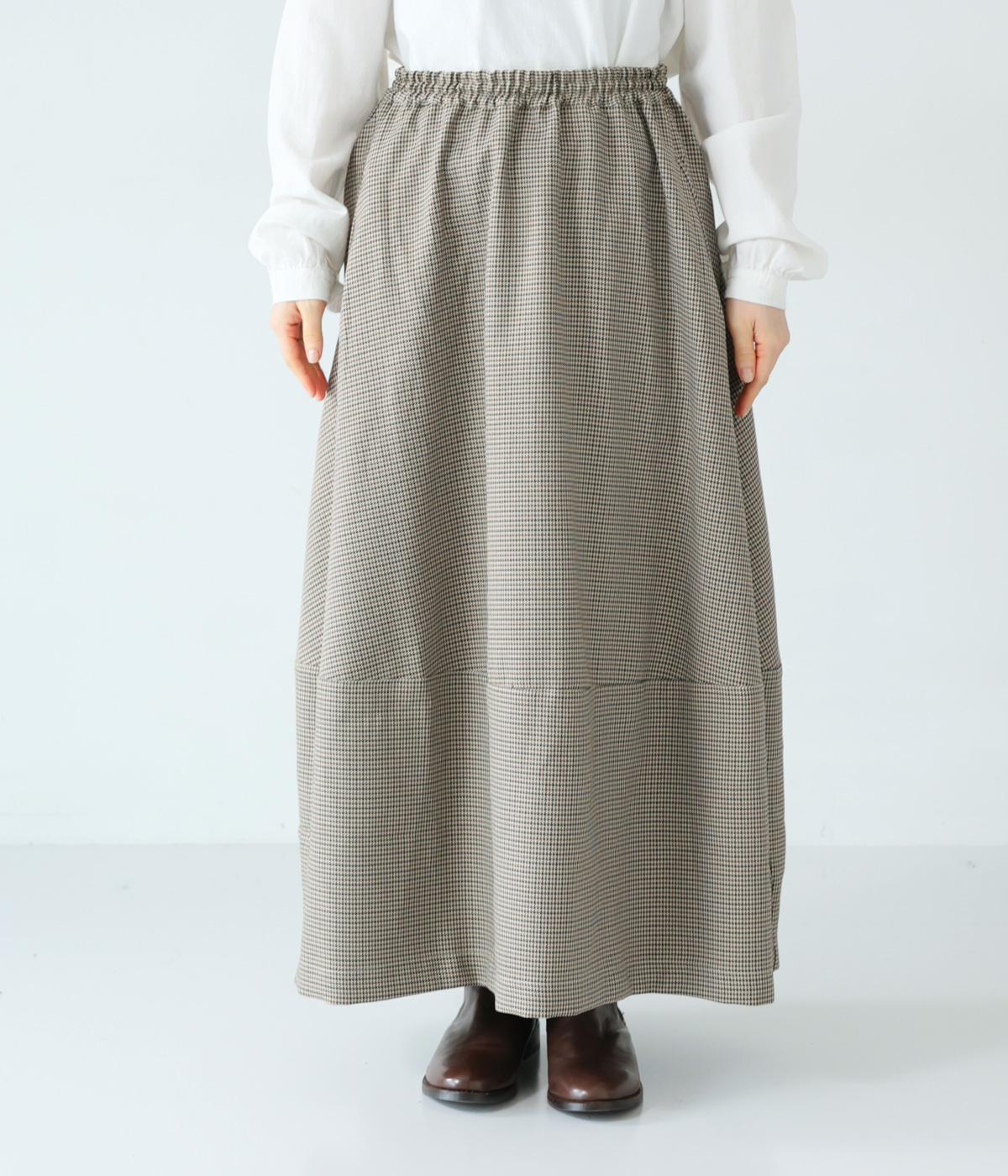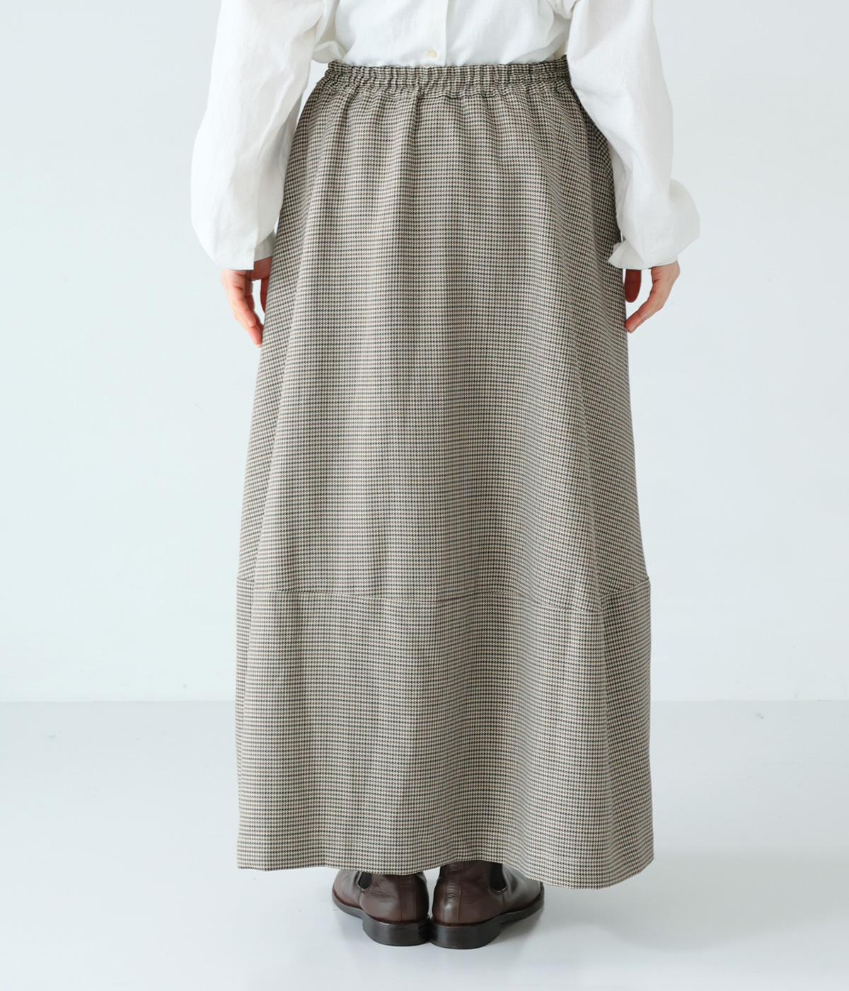 さりげない斜めの畝からセンスの良さが感じられるロングスカート。日本の伝統的な文様のひとつである千鳥格子柄で、清楚な雰囲気に仕上げました。ギャザーを入れて立体的に見せ、丸みを帯びたコクーンシルエットもフェミニンな印象。