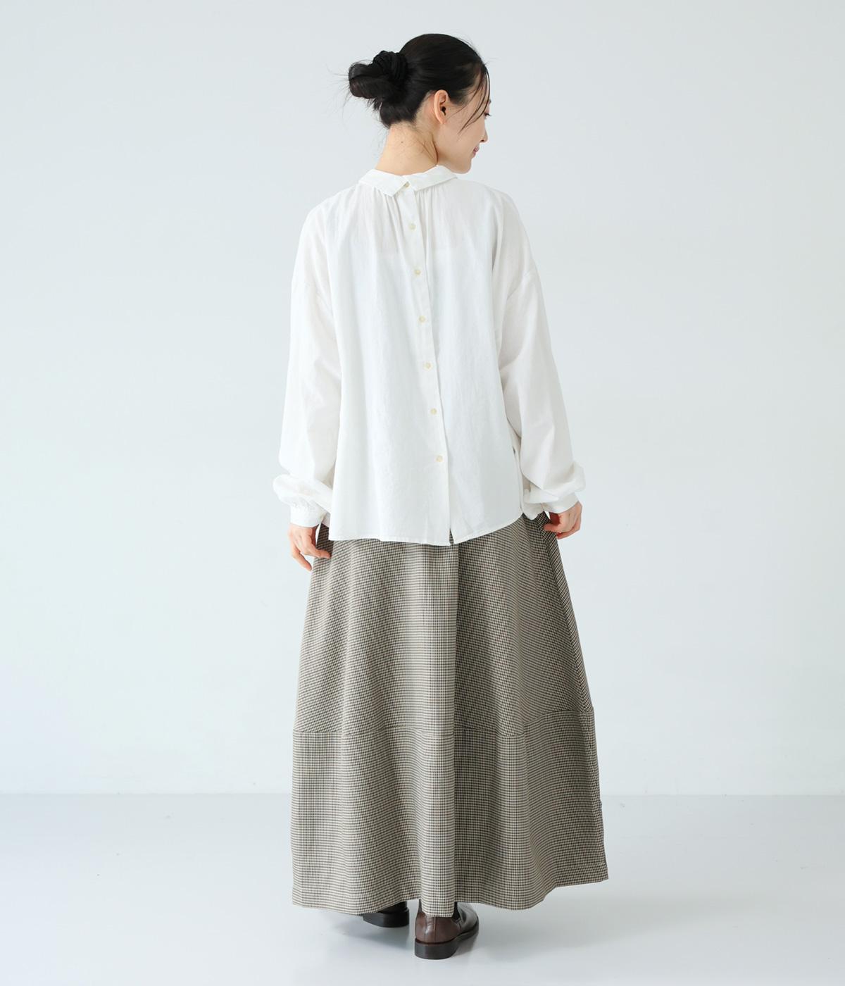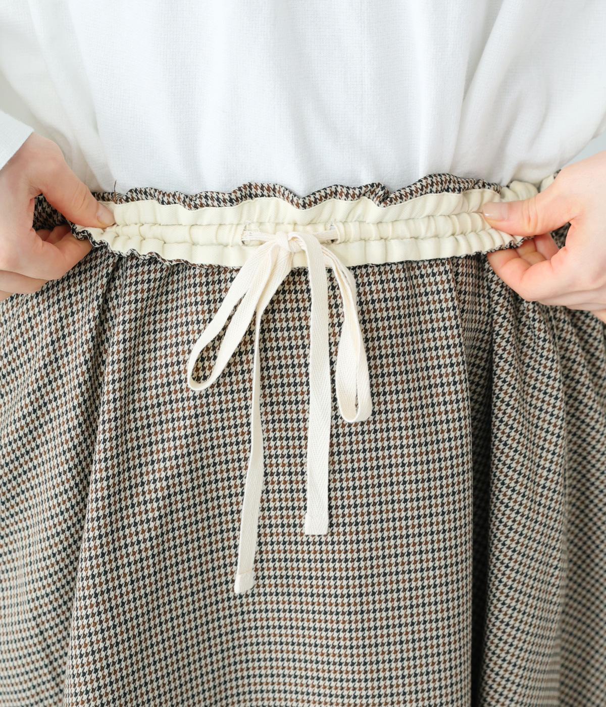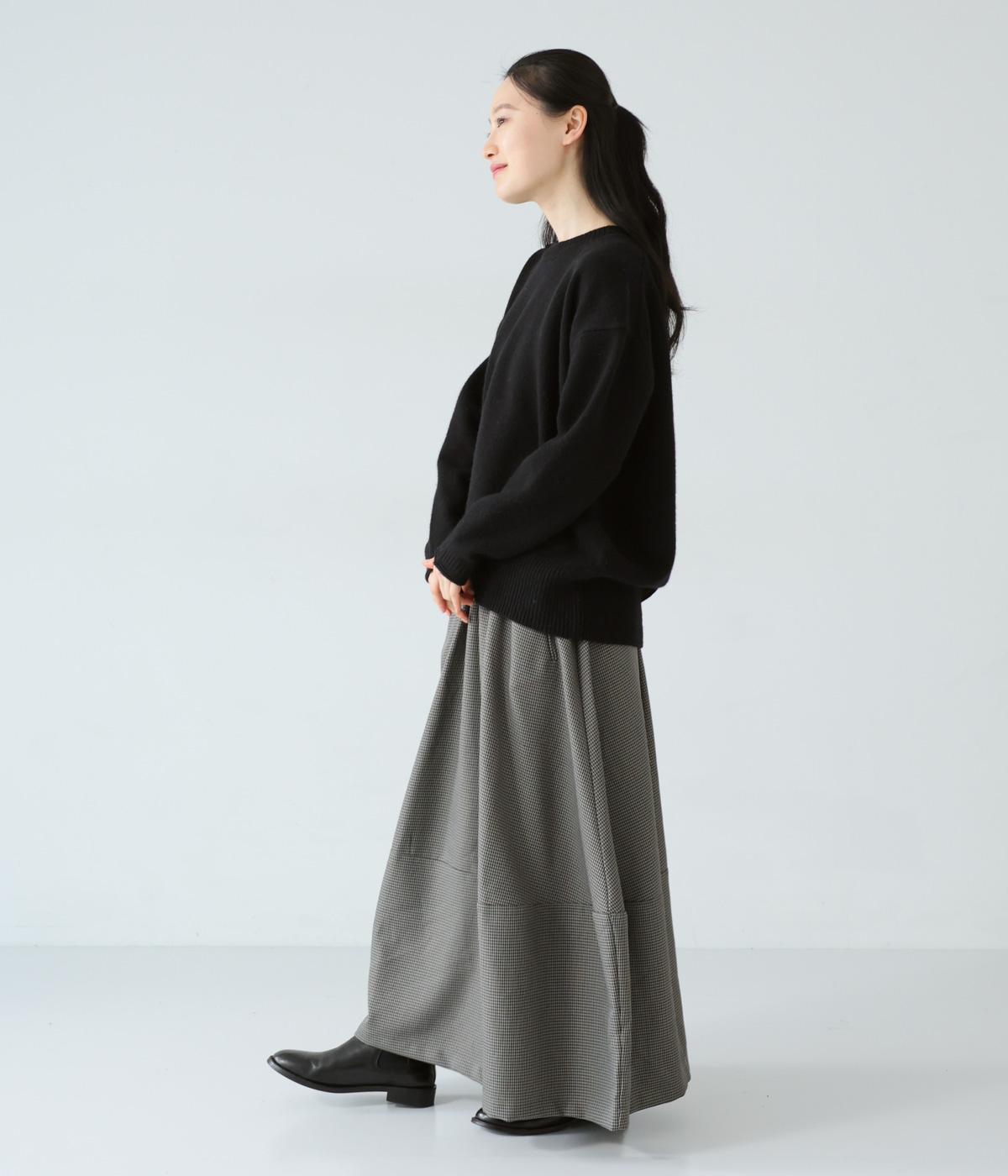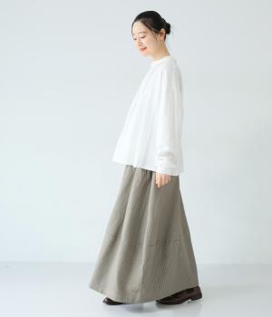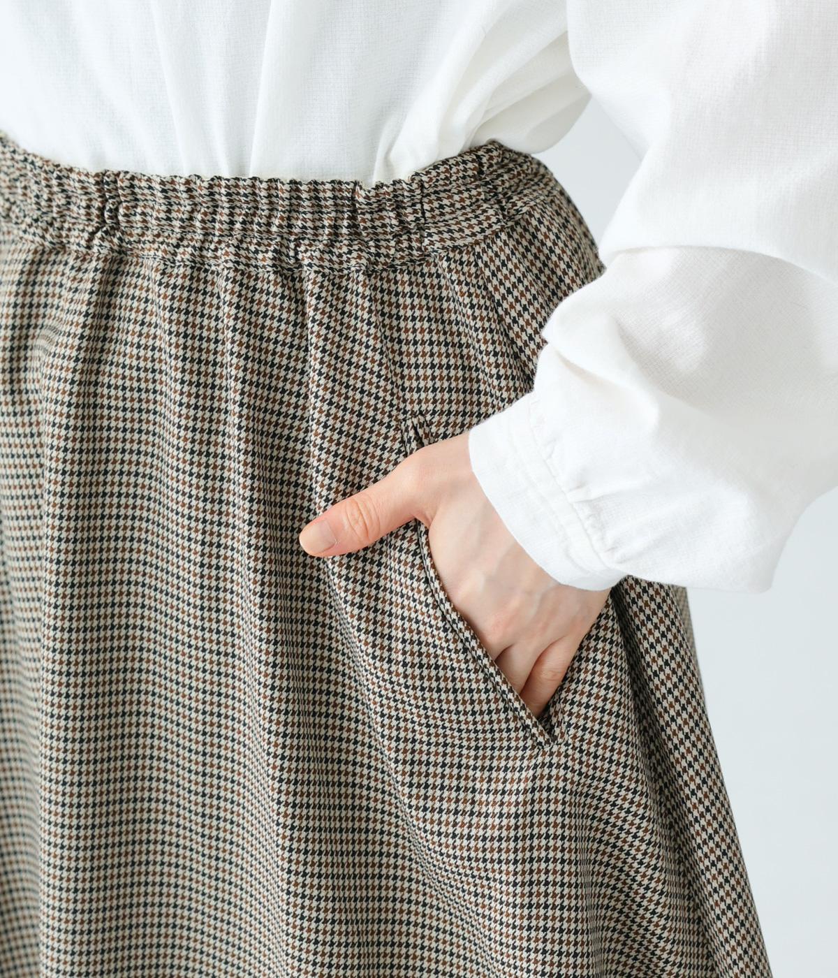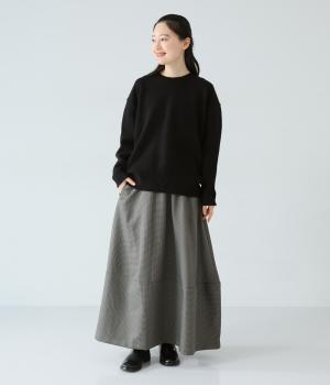 さりげない斜めの畝からセンスの良さが感じられるロングスカート。日本の伝統的な文様のひとつである千鳥格子柄で、清楚な雰囲気に仕上げました。ギャザーを入れて立体的に見せ、丸みを帯びたコクーンシルエットもフェミニンな印象。