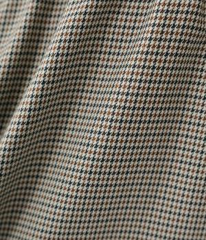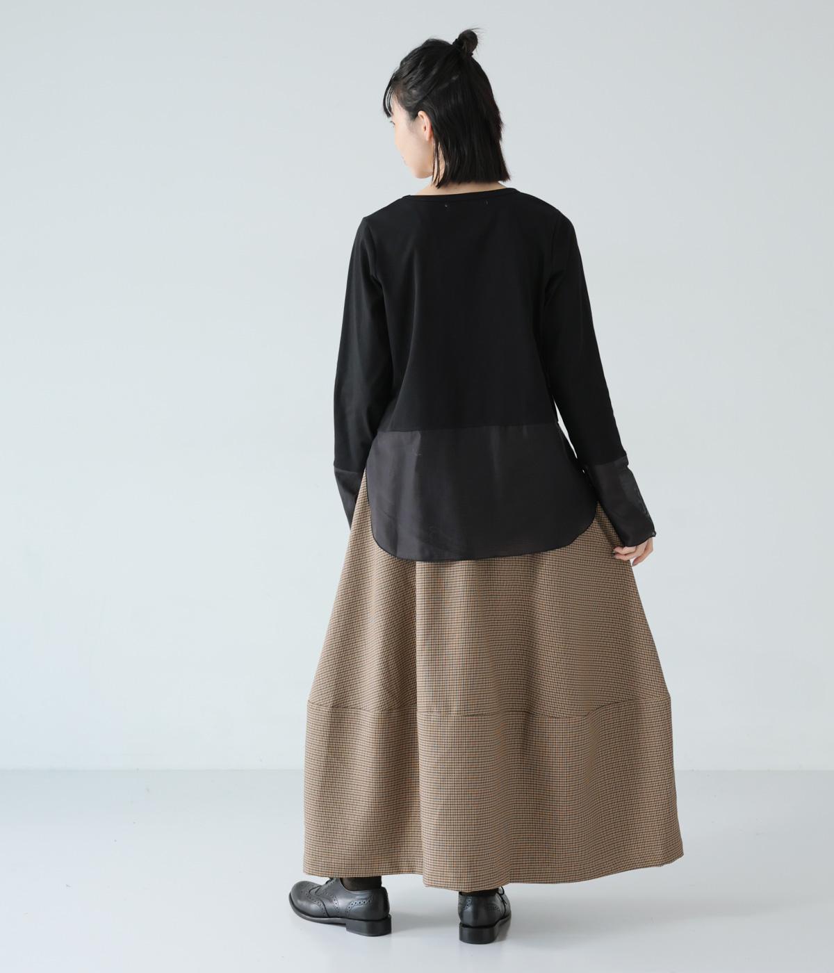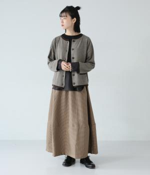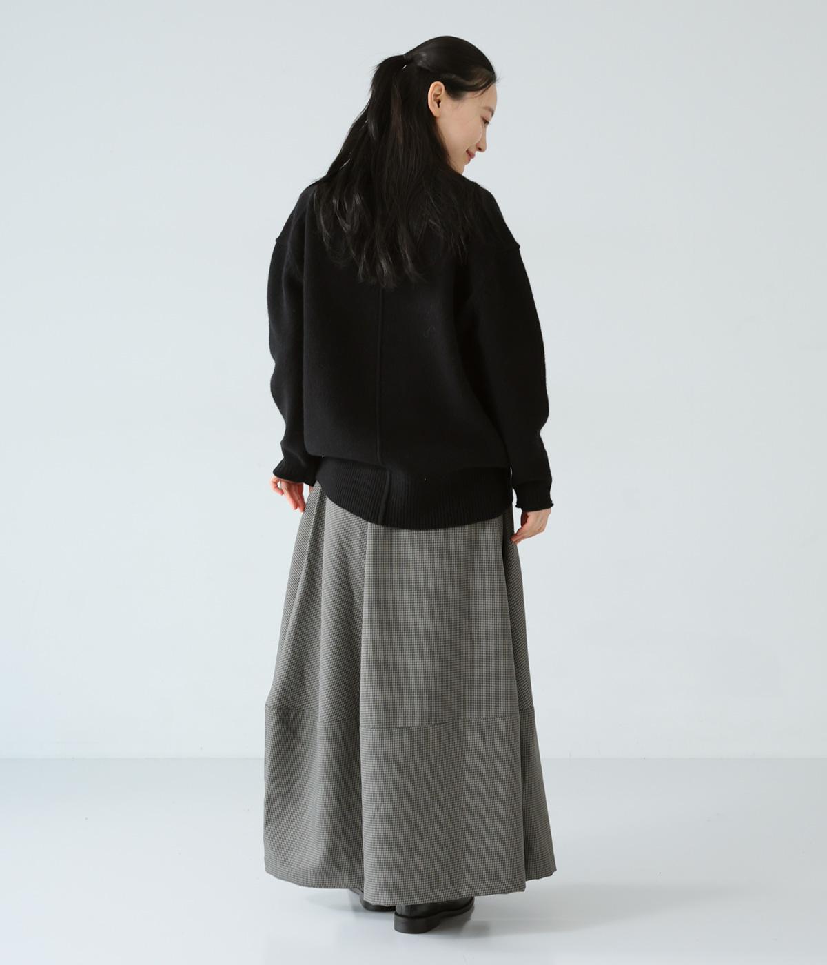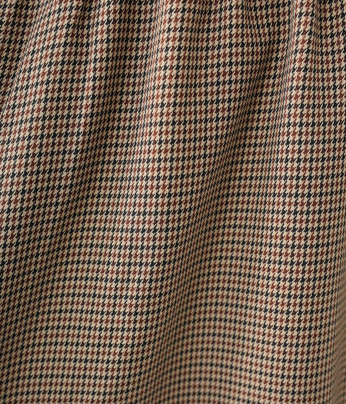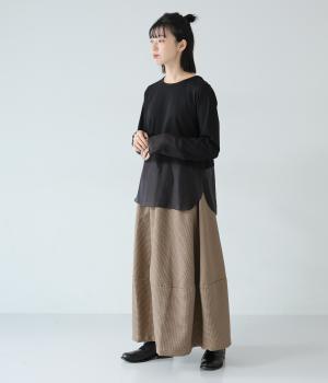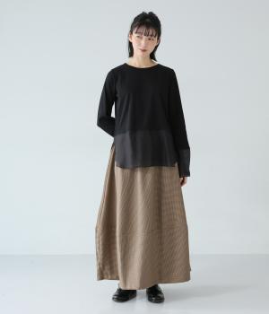 さりげない斜めの畝からセンスの良さが感じられるロングスカート。日本の伝統的な文様のひとつである千鳥格子柄で、清楚な雰囲気に仕上げました。ギャザーを入れて立体的に見せ、丸みを帯びたコクーンシルエットもフェミニンな印象。