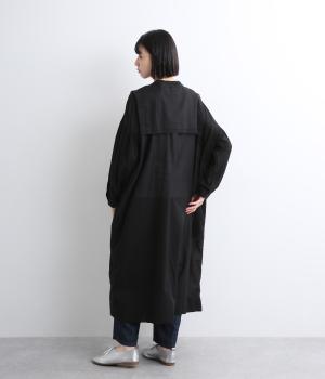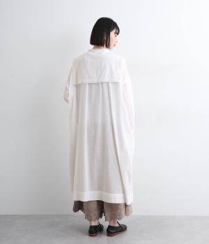 襟ぐりと肩に大きくギャザーを入れたワンピースは、比翼仕立てで前あきの羽織りにもなります。コーディネイトのアクセントになるレーストリミングのつけ襟がロマンティックで、気分やスタイリングに合わせててアレンジ可能。