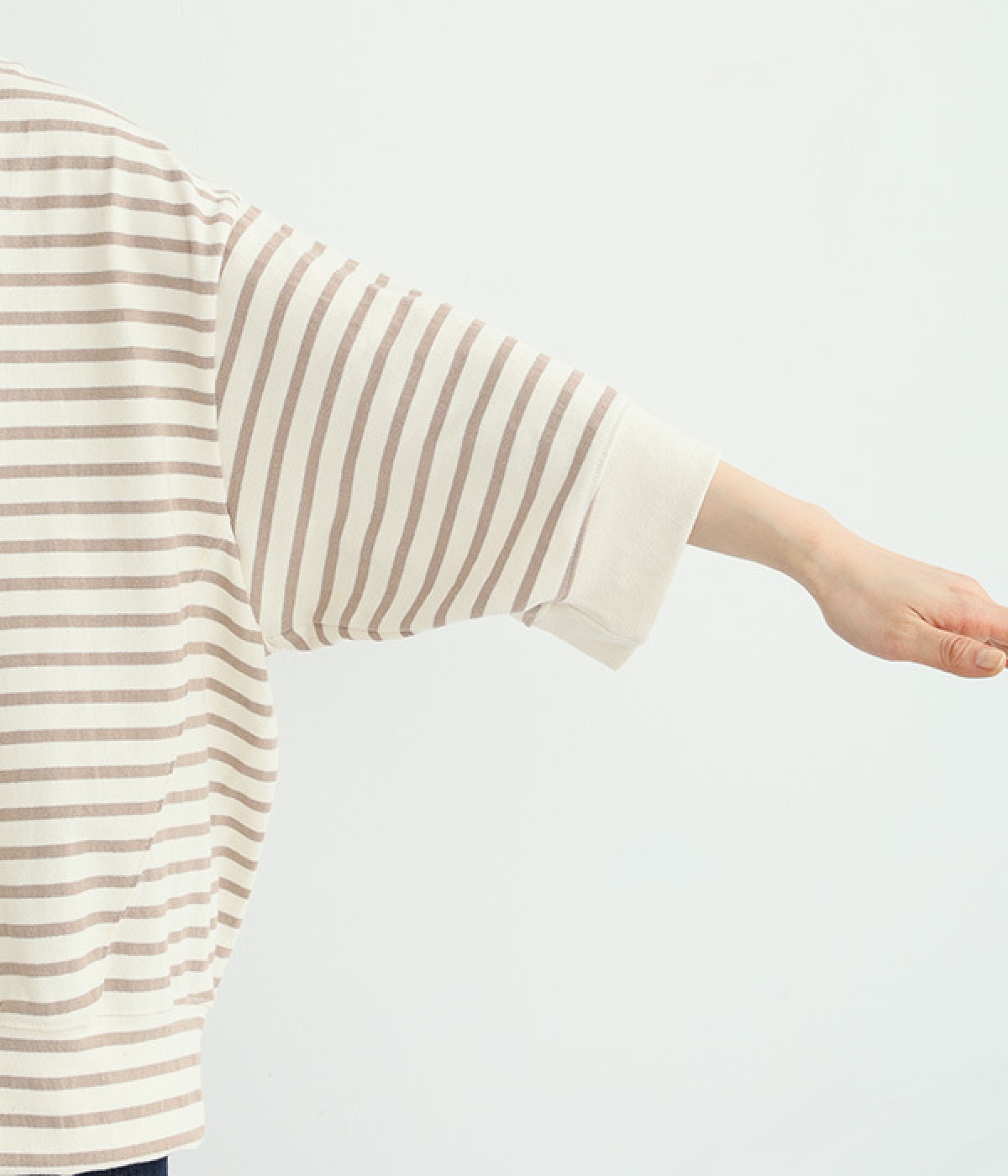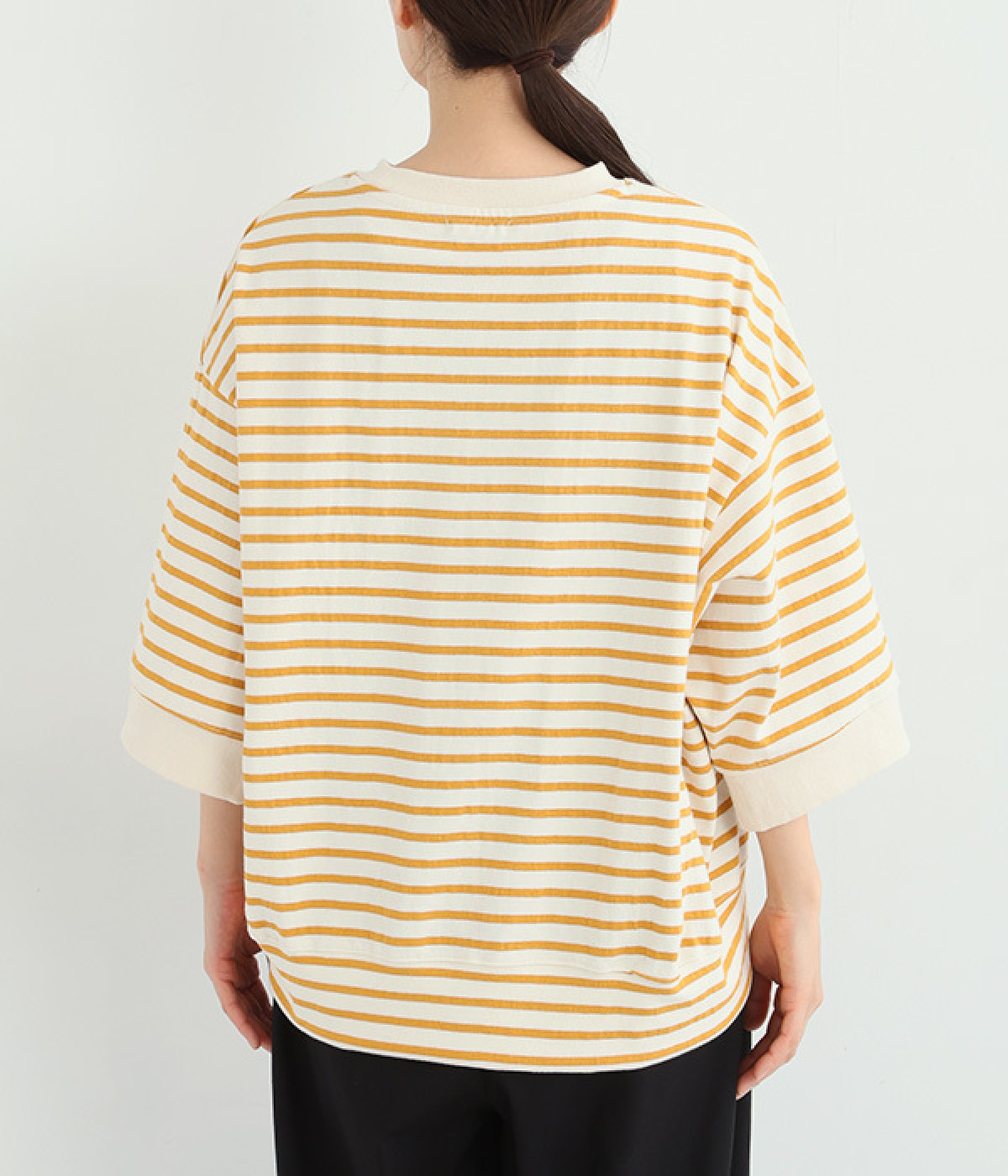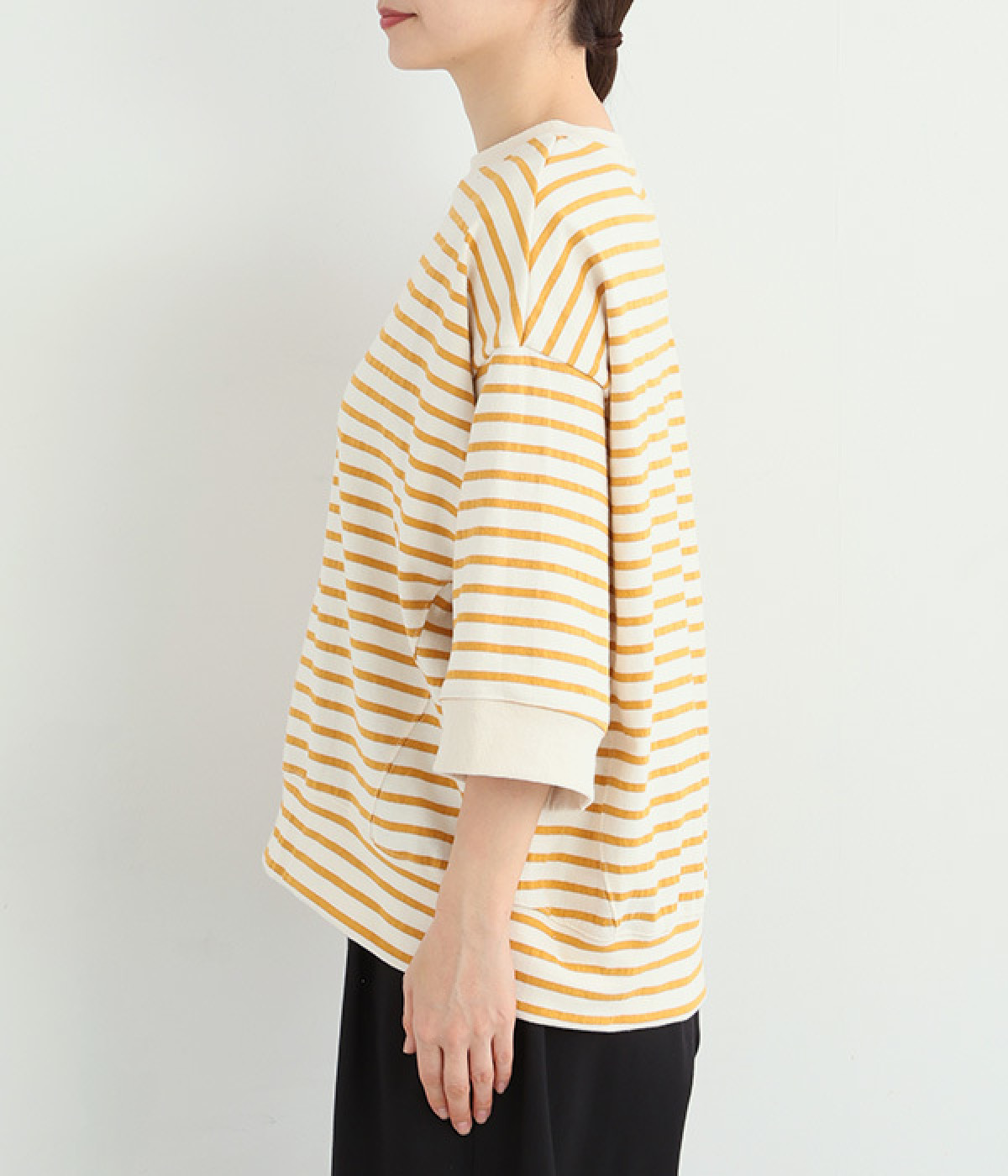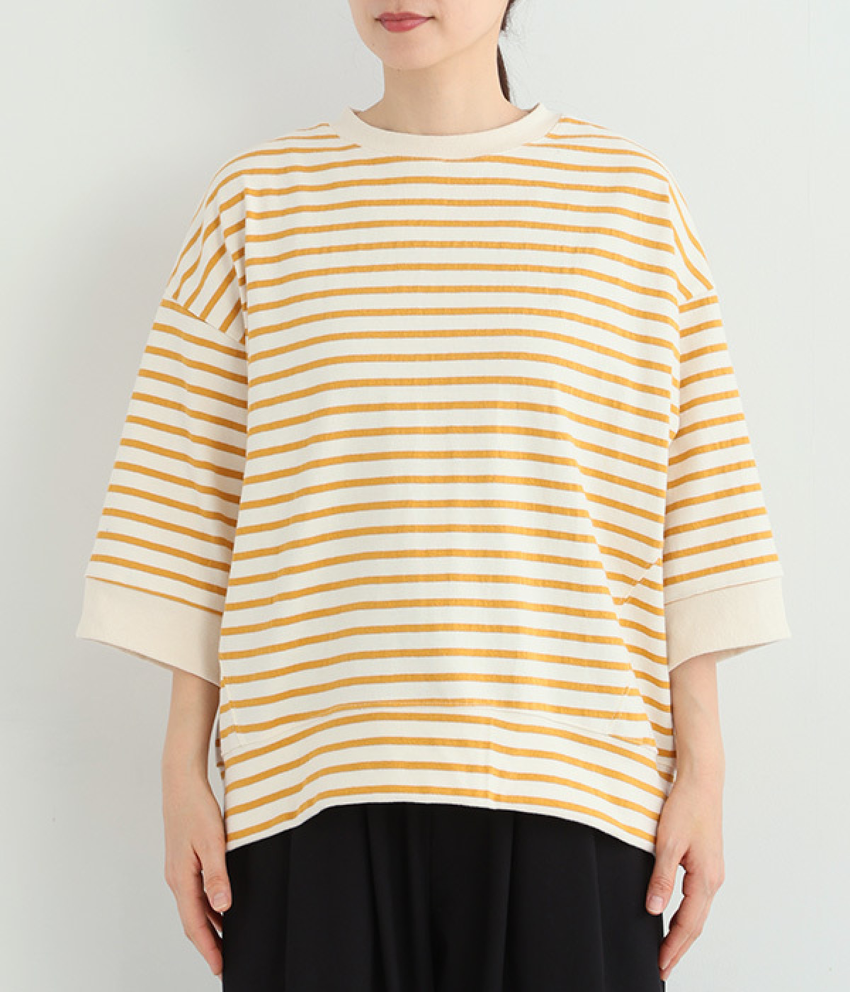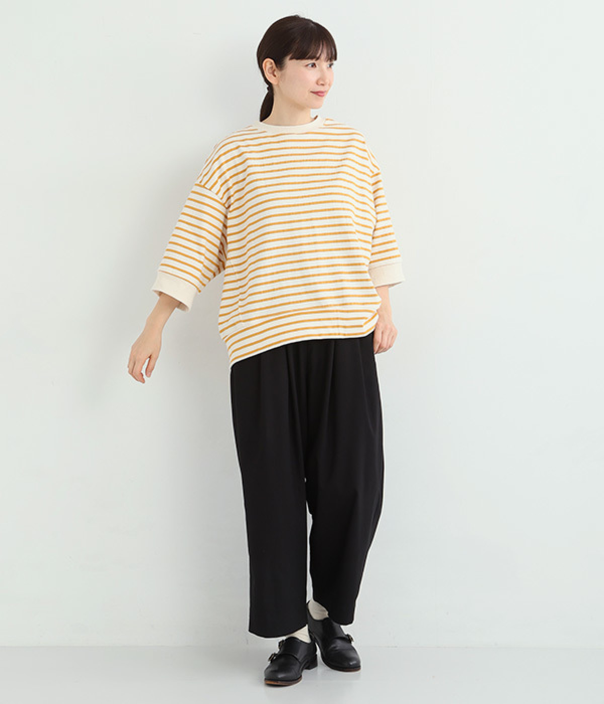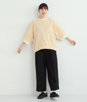 サイドの切り替えを斜めにしてワイドシルエットをすっきりと見せたのがポイント。アウトラインはリブ仕立てにしてメリハリをつけました。コーディネートをさわやかに演出するボーダー柄があたたかい季節にぴったり。