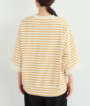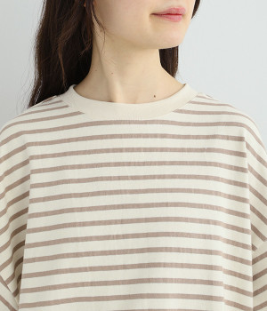 素朴な手触りが気持ちいいしっかりめのコットン天竺素材で、着心地のよさを高めました。糸に染色をほどこして織り上げた先染めボーダーがポイントになっています。