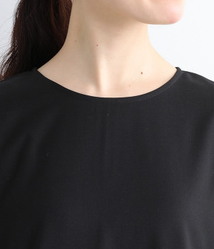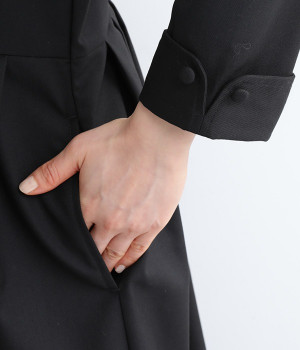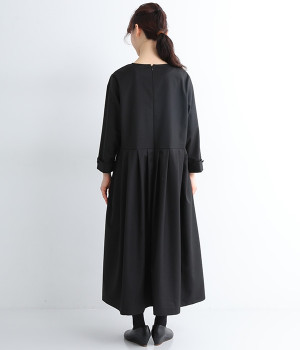 程よい光沢のあるなめらかな素材で仕立てたワンピースです。フォーマルシーンに使えるきちんとした印象ですが、身幅が広めなので堅苦しさを感じにくい着心地。バックスタイルはコンシールファスナーで目立たない仕様です。袖口のくるみボタンがさりげないアクセントに。スカート部分のタックがやさしいシルエットを作り、かしこまった場でも自然体な着こなしが叶うワンピースです。