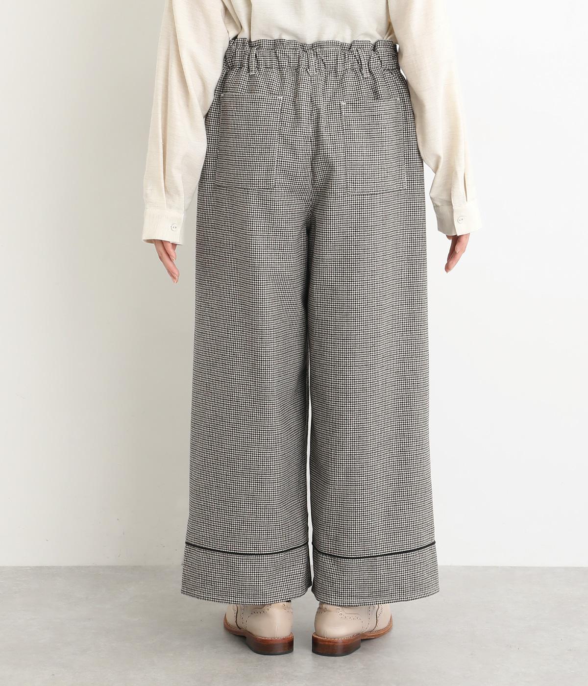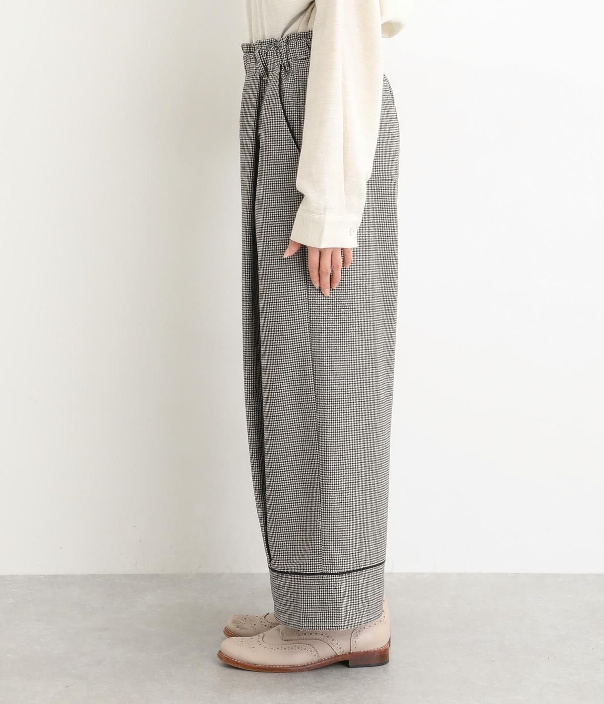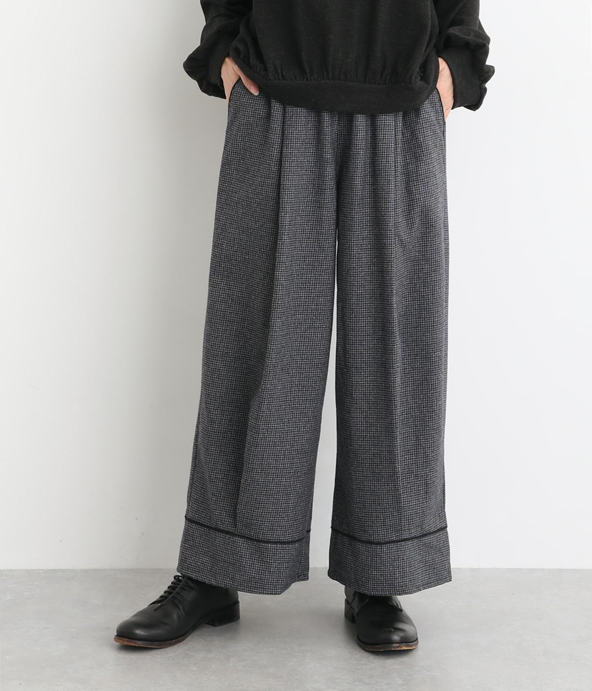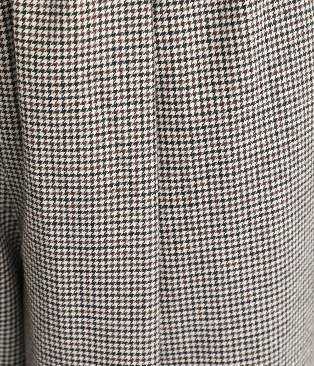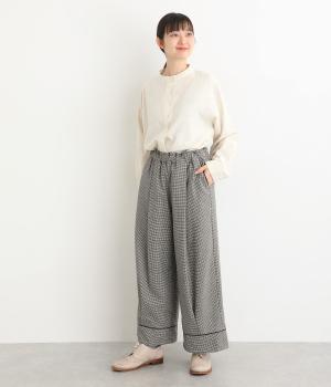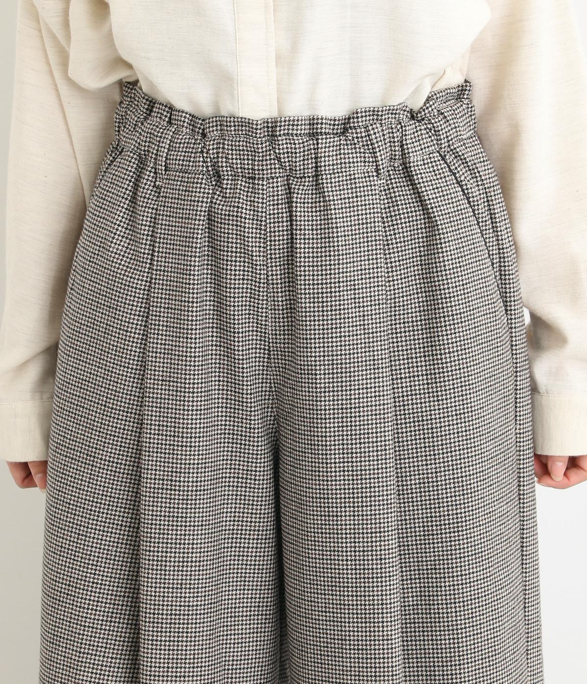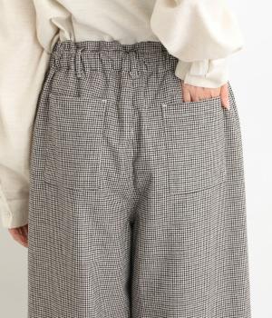 あたたかみのある起毛感と細かな千鳥格子柄がポイントのウール混生地。やわらかな風合いも魅力で、はき心地のよさと上品見えを叶えてくれます。脚にまとわりつかないさらりとした裏地つきです。