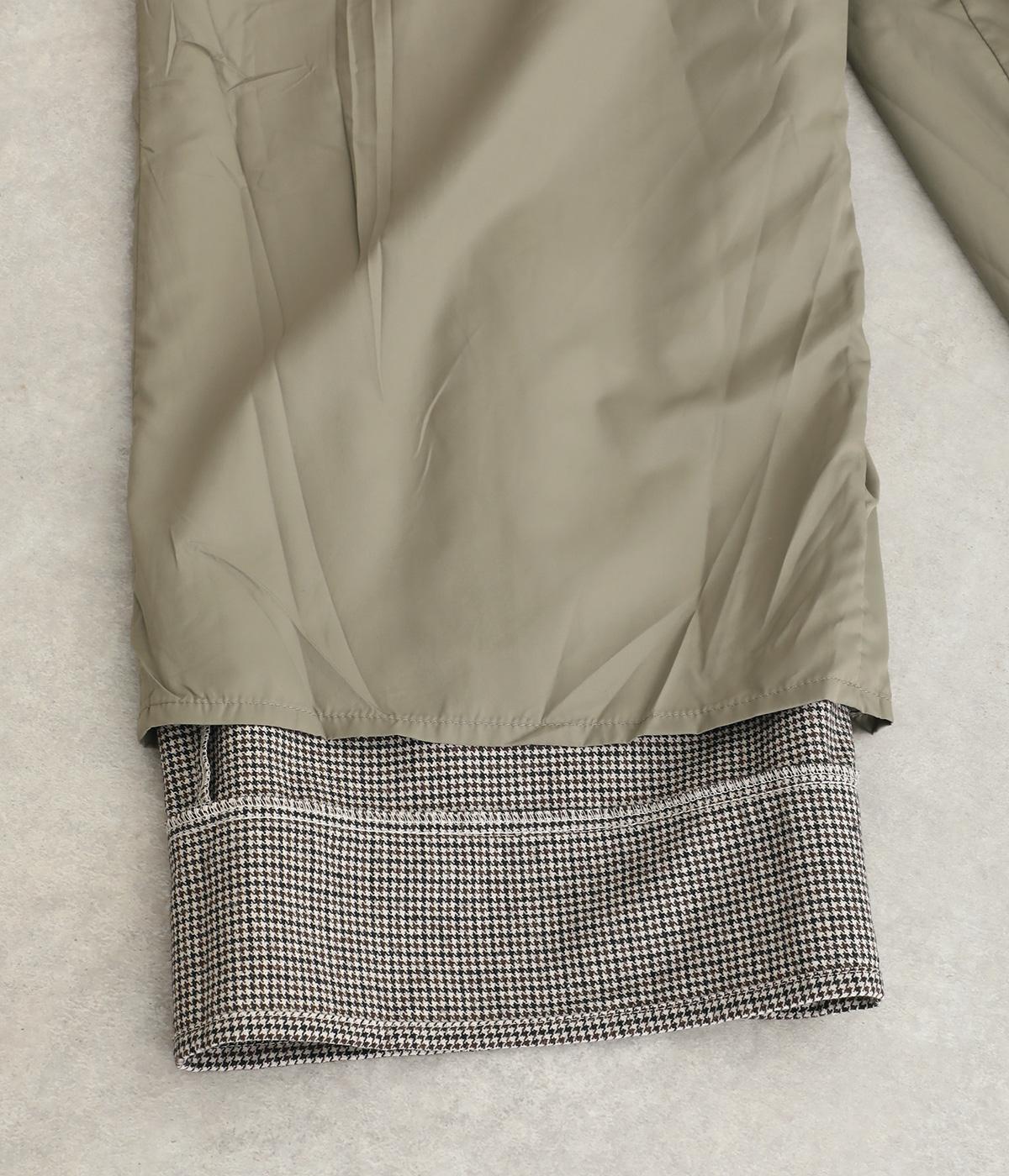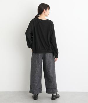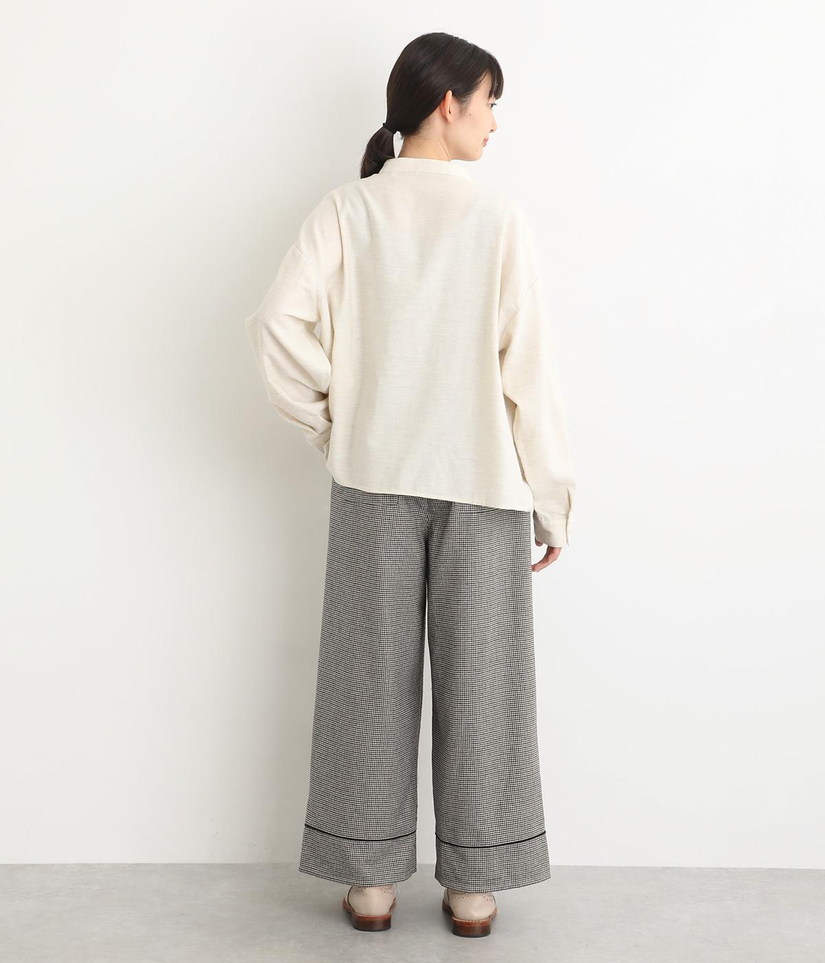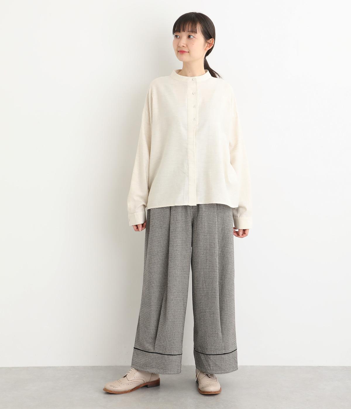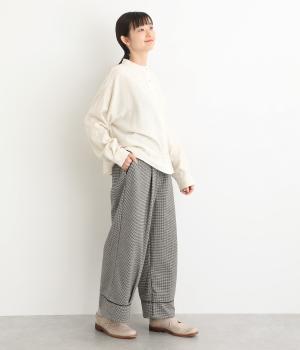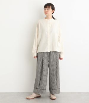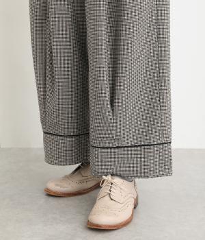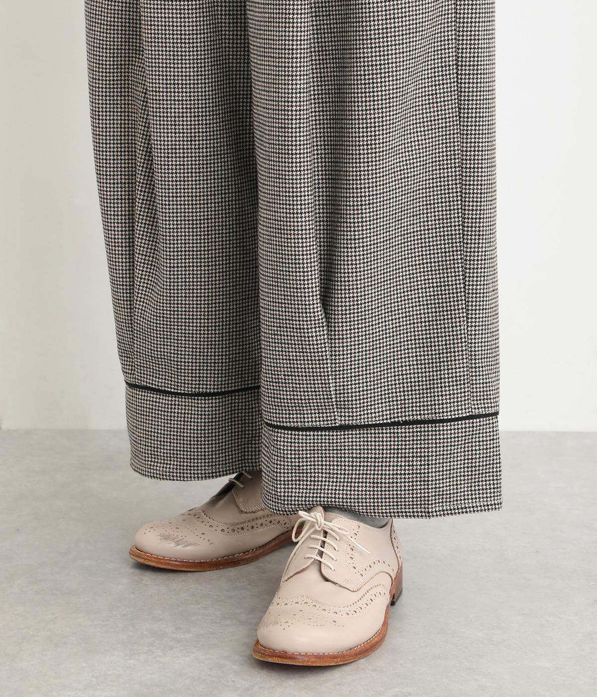 あたたかみのある起毛感と細かな千鳥格子柄がポイントのウール混生地。やわらかな風合いも魅力で、はき心地のよさと上品見えを叶えてくれます。脚にまとわりつかないさらりとした裏地つきです。
